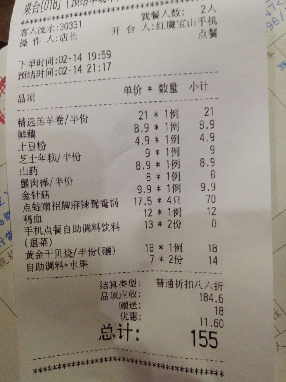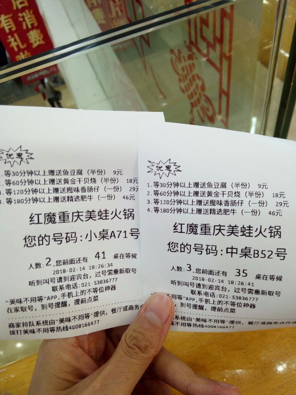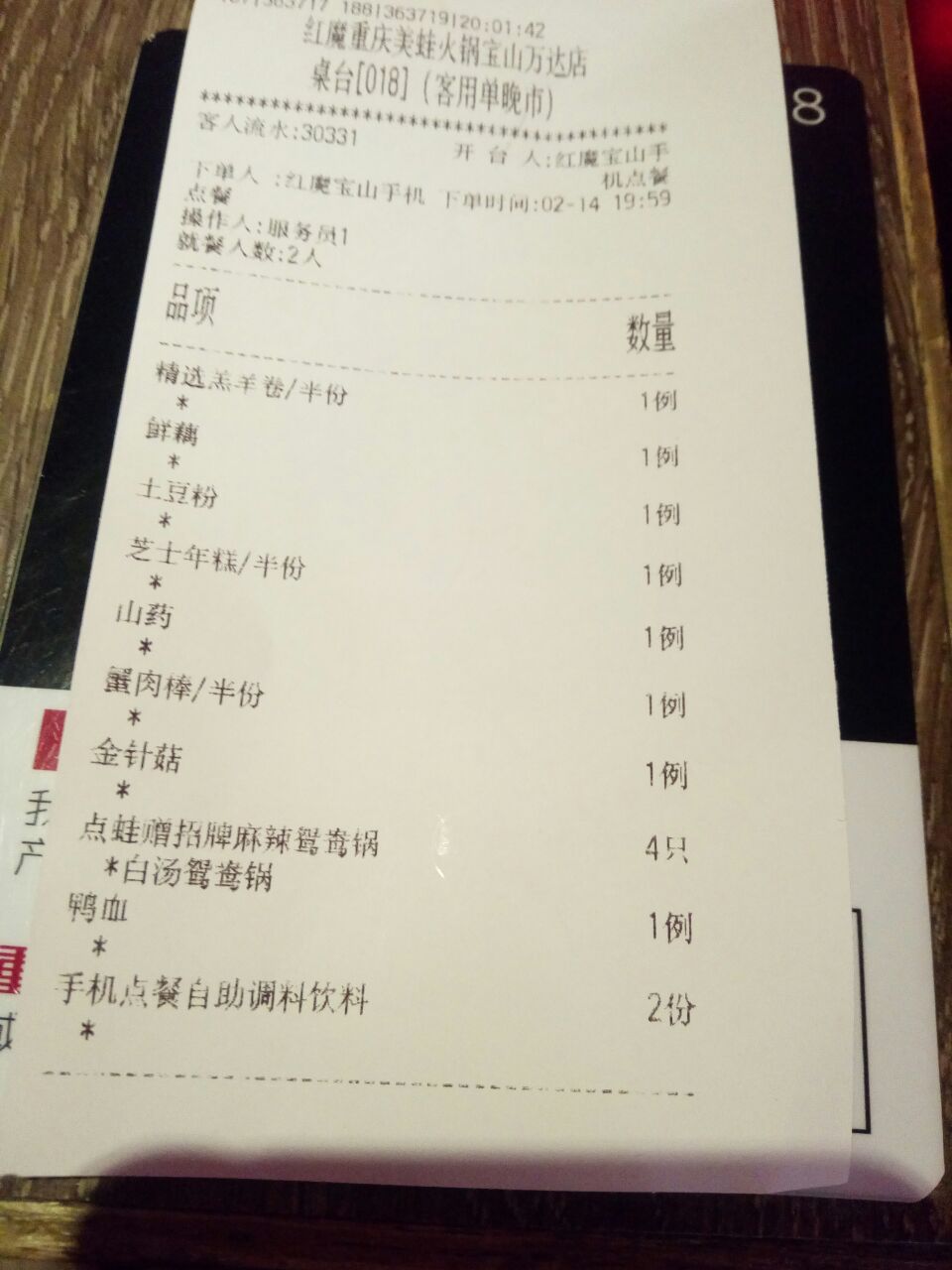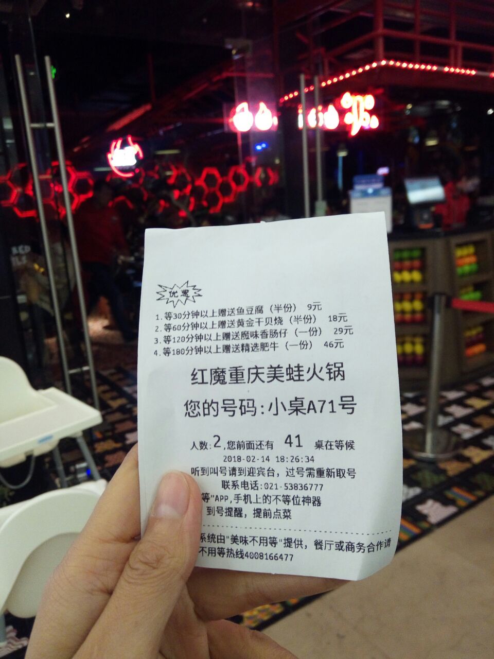 小年夜那天和小伙伴去汗蒸吃饭,本来以为没什么人的,没想到人都是辣辣多,尤其吃饭,等位了90+分钟,他们电也有等位超过多久就送菜的1活动,但是是指定的不是可以仔价格内自选,这个有点鸡肋,因为等这么久送的是我们不吃的好尴尬唉。 一只牛蛙17.5元,点4只就送一个锅底的,自助调料和饮料加起来一共13元一人,菜都可以点半份这个很适合2个人吃,多一些品种也不会浪费。 牛蛙个头是挺小的,一整只一整只放锅里的,肉质很嫩。
