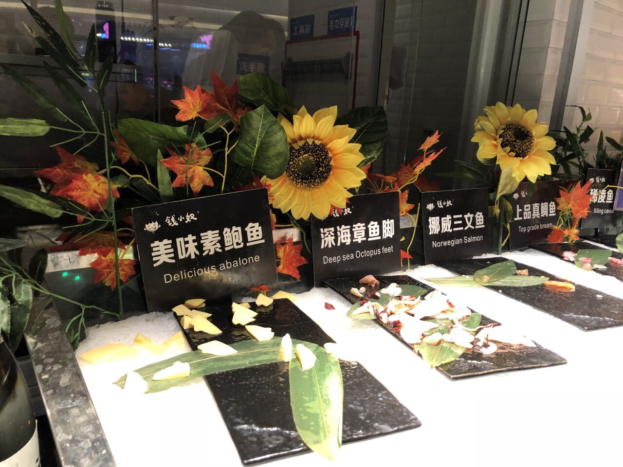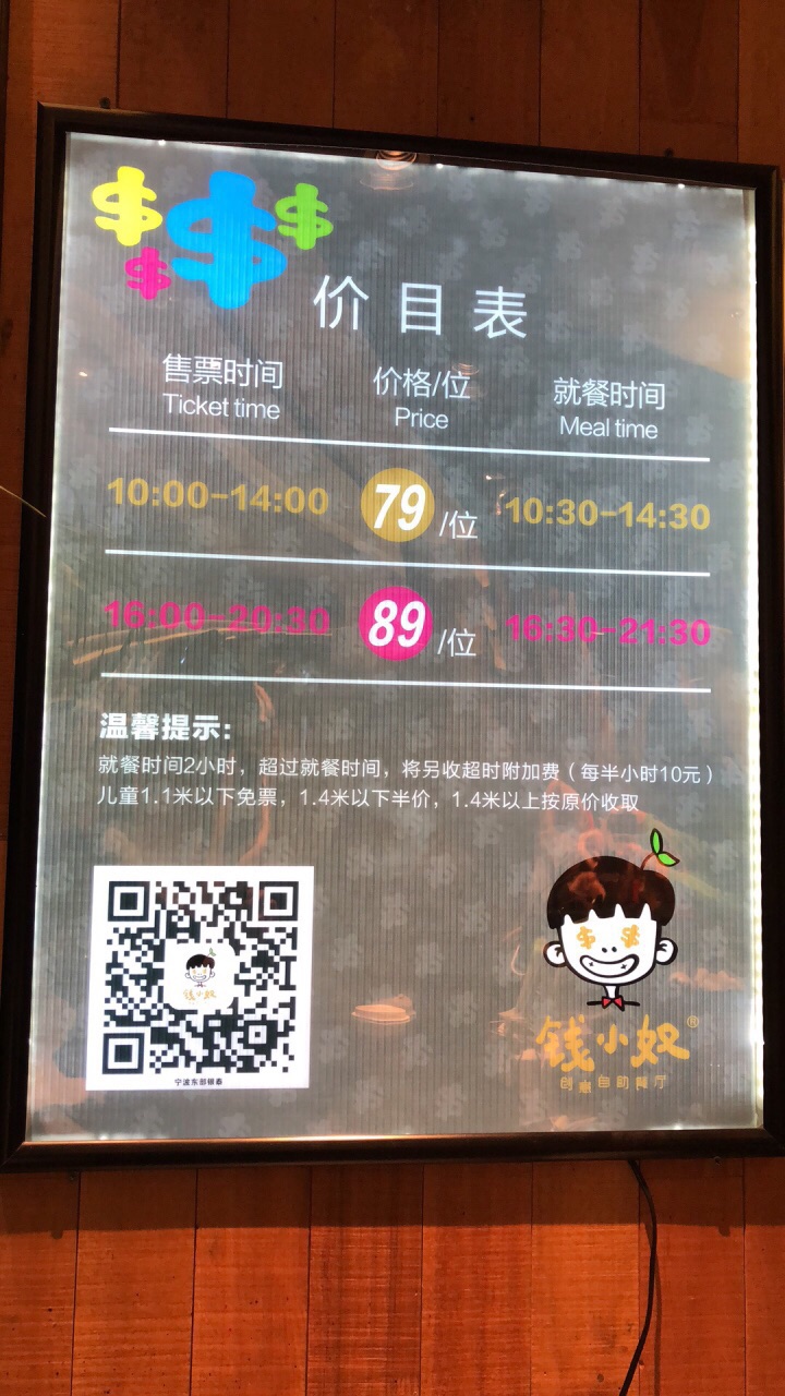 钱小奴自助餐厅 已经许久没有出门觅食的我们,这次难得过来吃一顿,私心想着小姚姚肯定战斗力十足的,没想到我估计错误。 基本上会出现在自助餐厅的都在了,另外没有发现他们家特别的地方,感觉可能真的只会来这一次了。 晚上自助餐时间是从下午4:30开始的,我能说他们买个单都超级慢吗?等最起码10-20分钟才能好,问题在于排的队也不是很长啊,疑惑。 各种海鲜、各色肉类、熟食类、火锅类、水果真心好少,饮料都不怎么好喝,都不明白这些饮料都是哪里变出来了的。 一个餐桌上有烧烤、有个小火锅,这样的搭配也不错,不会觉得一直吃烧烤太干,也不会因为火锅吃的太多撑死,换换口味。 来这里吃的还是小朋友居多,个人也感觉这里确实小朋友比较合适,不错不错。 就是个人感觉不怎么会回来了,因为不是特别好吃,没有值得我再来吃饭的欲望了,期待值下降太多。