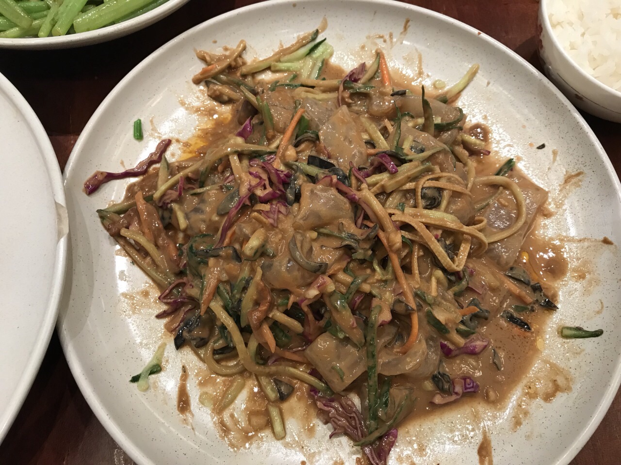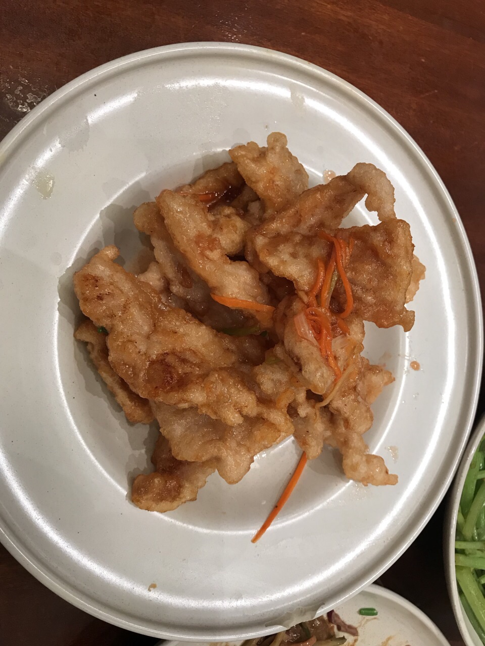 春节期间都是慕名而来的游客,桌上必点的是锅包肉和麻酱拉皮,锅包肉说是他家的创始,但可能跟家里日常做的不太一样,有人会吃不惯。松仁茼蒿比较推荐,另外鲜酿格瓦斯超级好喝,鲜酿啤酒也不错。想吃冻梨沙冰,没有,好可惜。