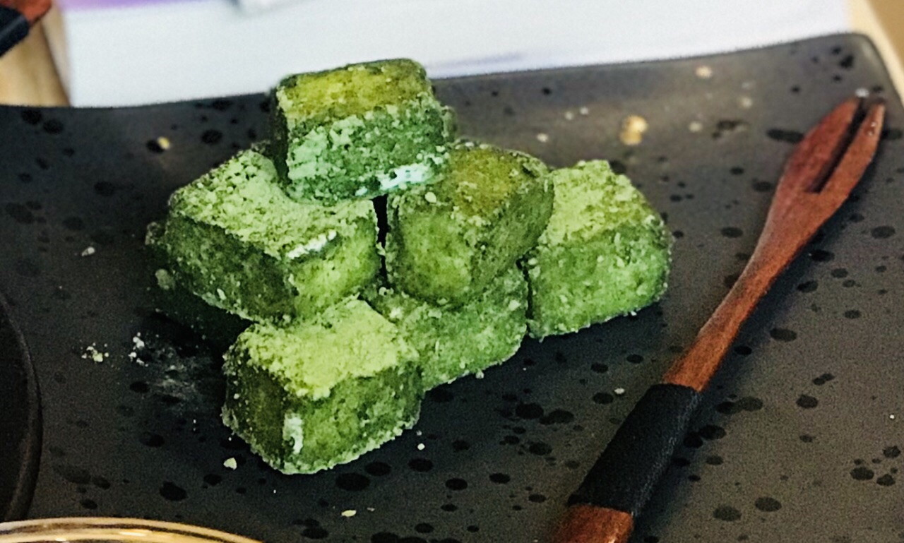 也许是春节的缘故, 老板附送了一份牛奶抹茶点心, 很美味。 门口拴着条贵宾, 叫笨笨, 还挺黏人