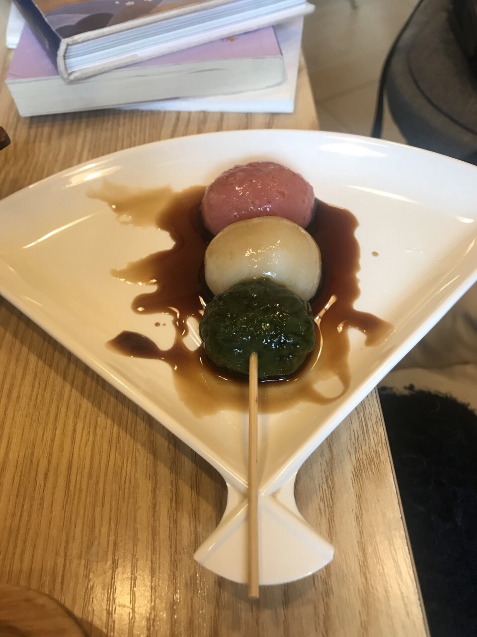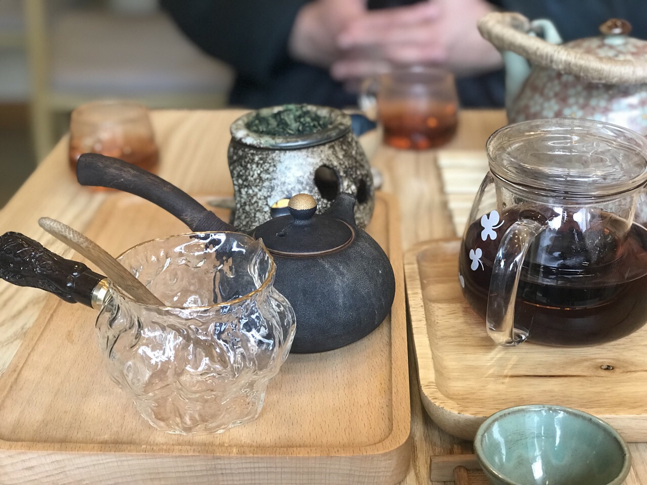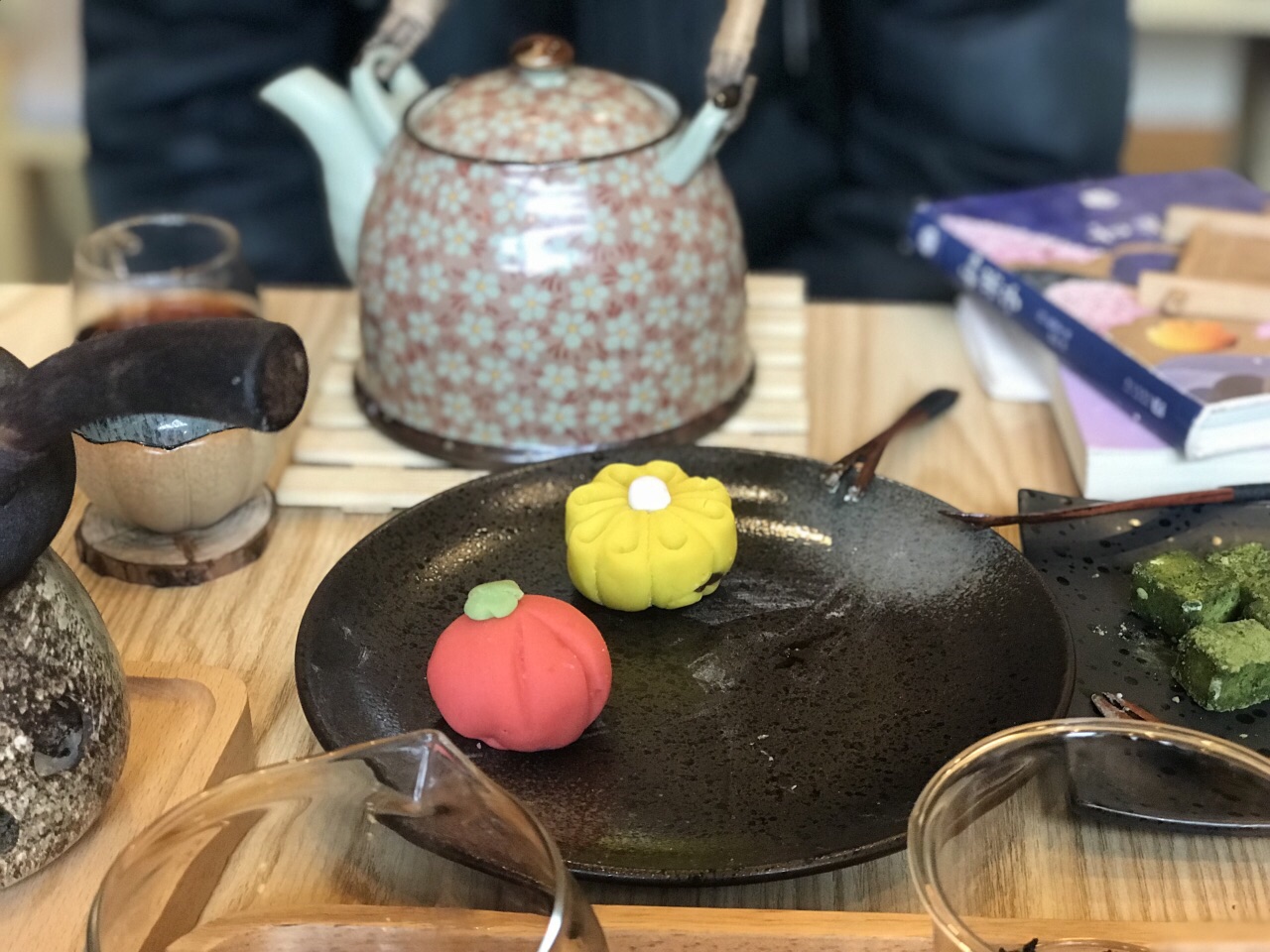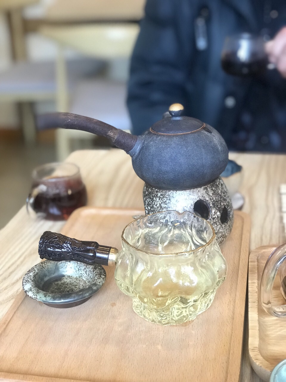 年三十中午聚完餐后, 我们没有急着离开, 时代天街难得人少清净, 正好可以随意逛逛消消食。 走了个把小时, 饱腹感基本消除, 也正好是下午茶的时间, 便决定找间抹茶店歇歇脚。 原计划是去另外一间熟悉的店, 因为走错路来到时桔的门口。 既然一切都是最好的安排, 那就选择随遇而安。 若是气温更温暖一些, 室外的卡座更舒服, 不过当天还是偏冷, 我们坐进室内, 座位布置得有些拥挤, 好在没有其他客人, 倒也安静。 四个人, 点了两份套餐, 一共是一壶普洱、一壶烤茶(碧螺春)、四颗和菓子。 厨师放假回家, 老板亲自上阵, 但毕竟术业有专攻, 包出来的造型的确丑了些。 也许是春节的缘故, 老板附送了一份牛奶抹茶点心, 很美味。 清苦的茶和甜腻的糕点, 停留一个多小时, 还有些撑了。 店里还有些日本文化的书籍和漫画, 喝喝茶翻翻书, 感觉也蛮好。 桌上有枯山水的小布景, 无聊时也可以消磨些时间。 门口拴着条贵宾, 叫笨笨, 还挺黏人。