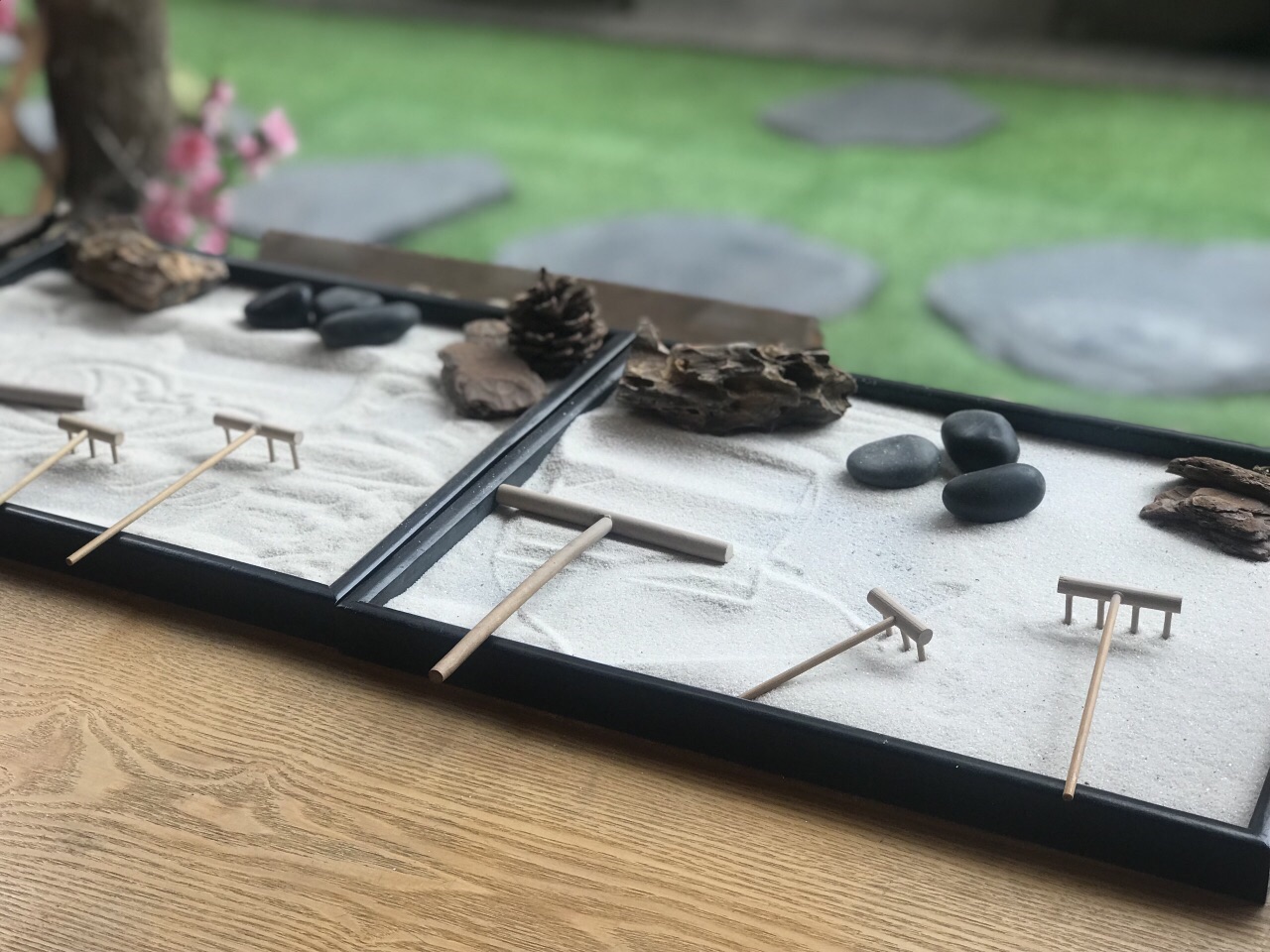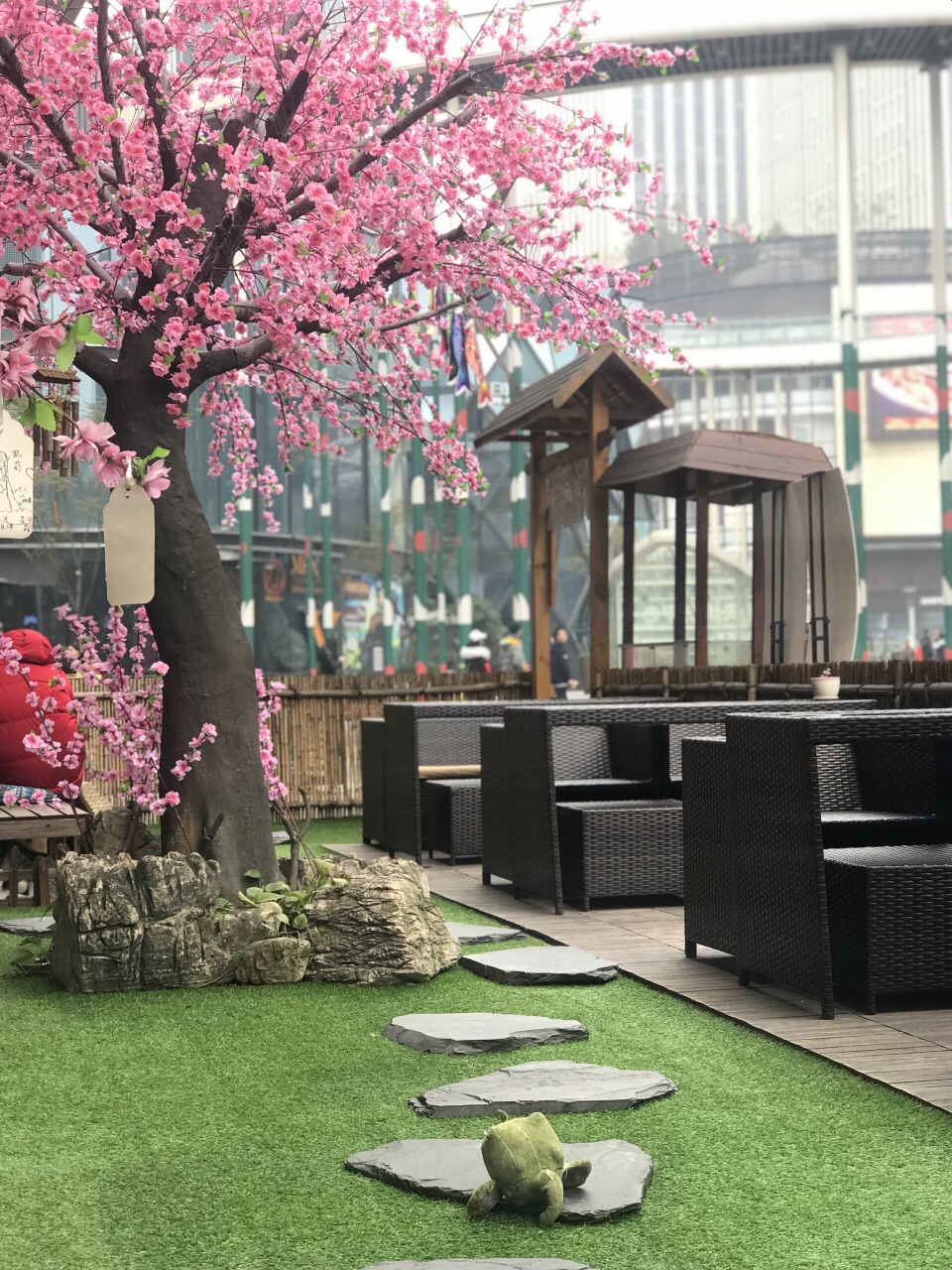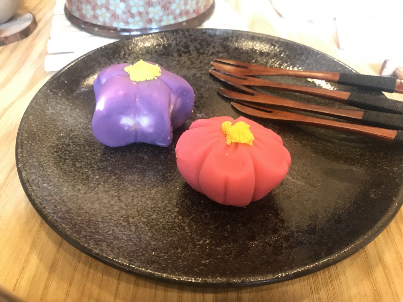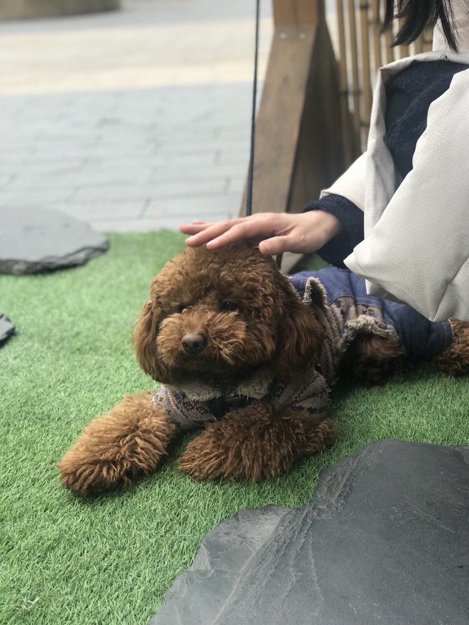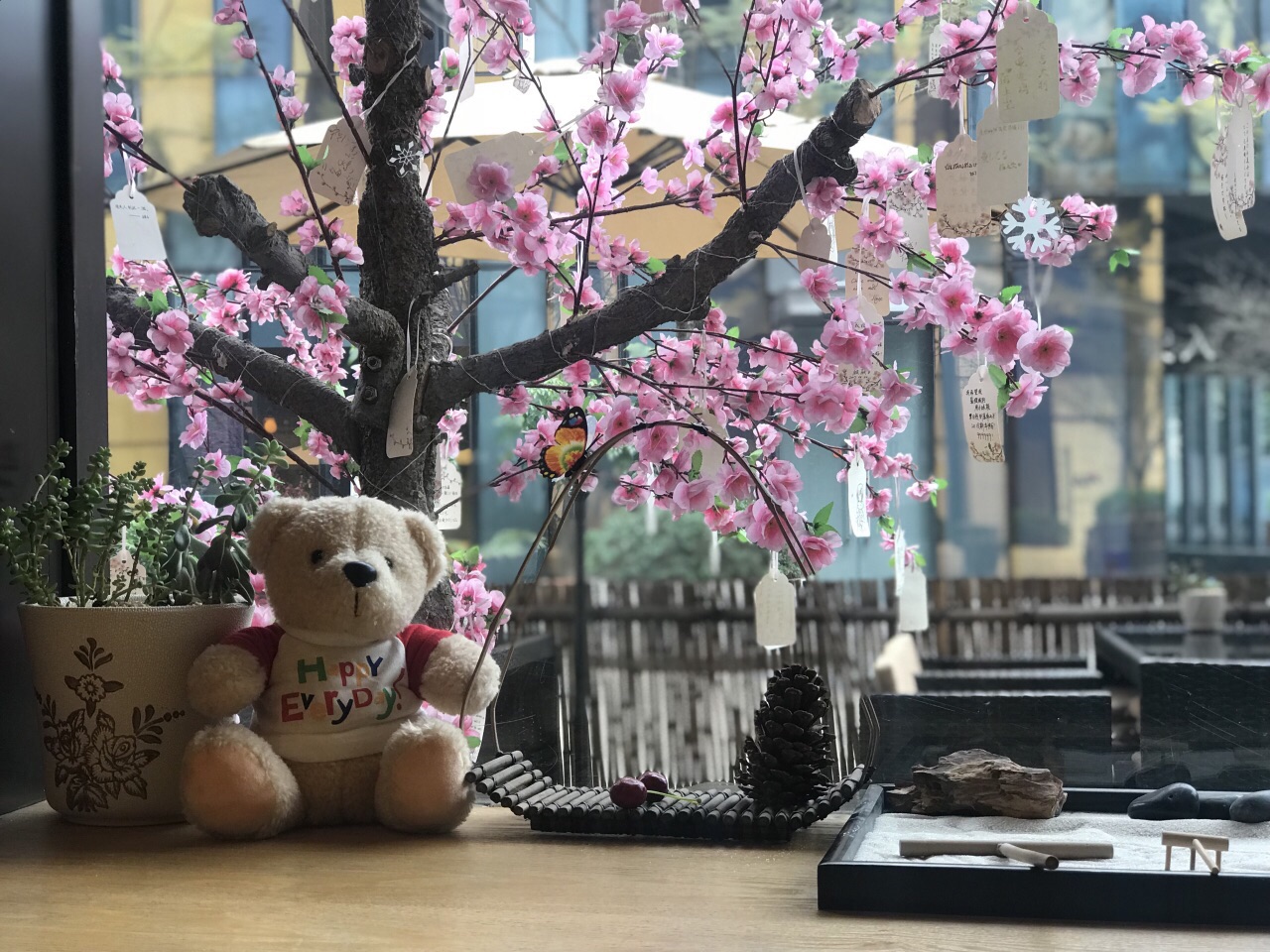 年三十中午聚完餐后, 我们没有急着离开, 时代天街难得人少清净, 正好可以随意逛逛消消食。 走了个把小时, 饱腹感基本消除, 也正好是下午茶的时间, 便决定找间抹茶店歇歇脚。 原计划是去另外一间熟悉的店, 因为走错路来到时桔的门口。 既然一切都是最好的安排, 那就选择随遇而安。 若是气温更温暖一些, 室外的卡座更舒服, 不过当天还是偏冷, 我们坐进室内, 座位布置得有些拥挤, 好在没有其他客人, 倒也安静。 四个人, 点了两份套餐, 一共是一壶普洱、一壶烤茶(碧螺春)、四颗和菓子。 厨师放假回家, 老板亲自上阵, 但毕竟术业有专攻, 包出来的造型的确丑了些。 也许是春节的缘故, 老板附送了一份牛奶抹茶点心, 很美味。 清苦的茶和甜腻的糕点, 停留一个多小时, 还有些撑了。 店里还有些日本文化的书籍和漫画, 喝喝茶翻翻书, 感觉也蛮好。 桌上有枯山水的小布景, 无聊时也可以消磨些时间。 门口拴着条贵宾, 叫笨笨, 还挺黏人。