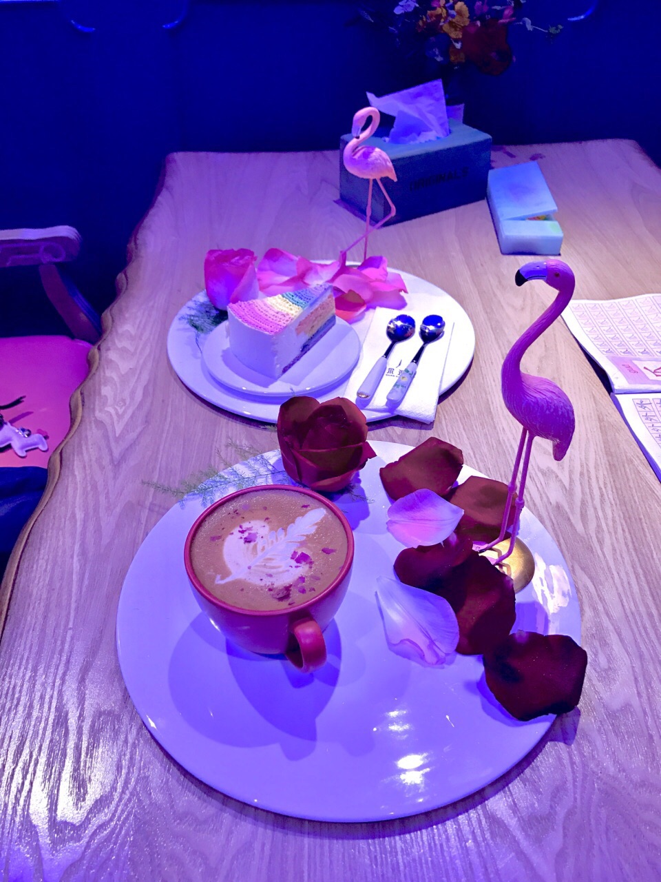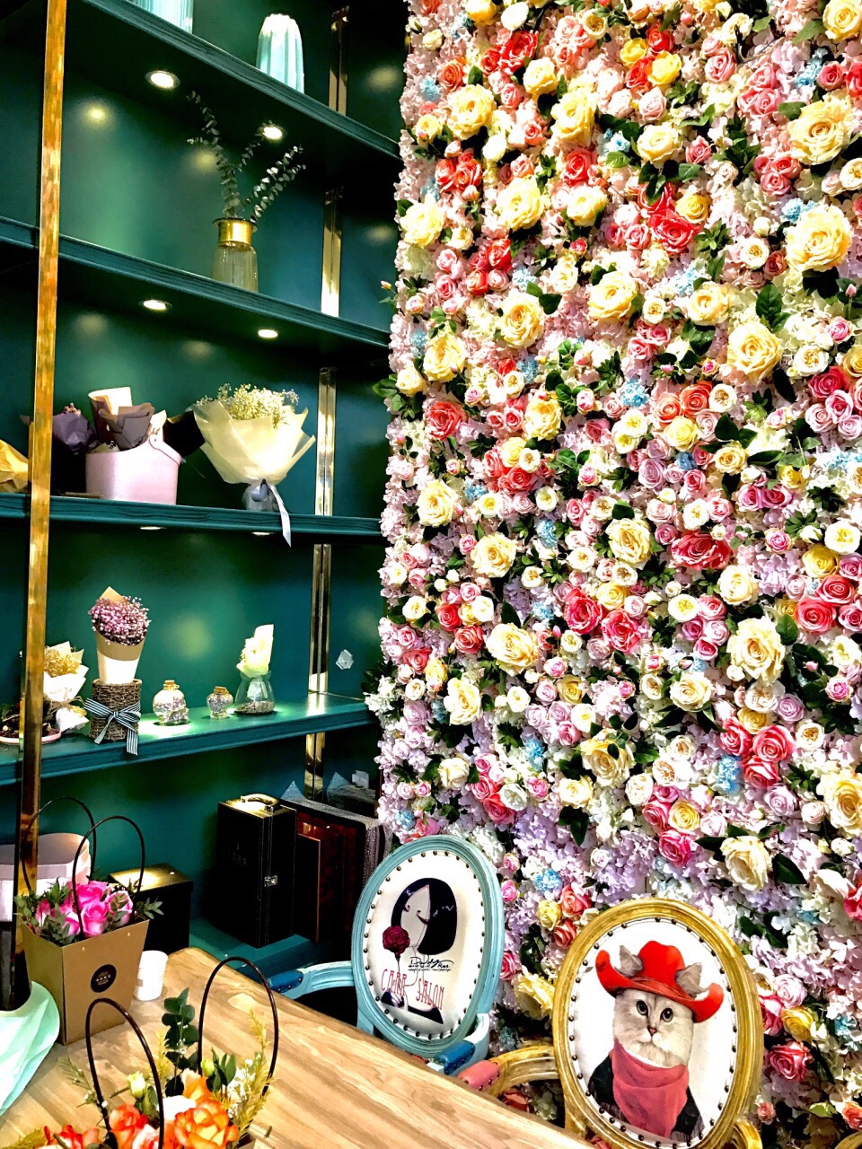 喜欢带着小朋友泡咖啡店 今天闺女提出不要去星爸爸家了,要找一家好玩的 上APP横竖比较,发现八佰伴里竟然藏着一家好有调调的咖啡店,立马赶去 店面位于张杨路上,果然还没进门就被眼前的花花草草吸引,不留意还以为新开了家花店呢 室内被设计成2个区域,门厅处是小清新文艺范儿,背靠巨大的花墙,喝着咖啡翻几页书,拗几个造型,美爆了✨ 小妞更喜欢内厅,蓝色灯光配上印有美女相的靠椅,好梦幻✨ 糕点是外送来的,点了小妞喜欢的彩虹蛋糕,自己点了份招牌玫瑰拿铁-无糖。 摆盘超级悦目,咖啡口感不错 八佰伴周围已经被星爸爸等众多大品牌的咖啡店占据,另辟蹊径的卡尔—愿你能成网红店哦!