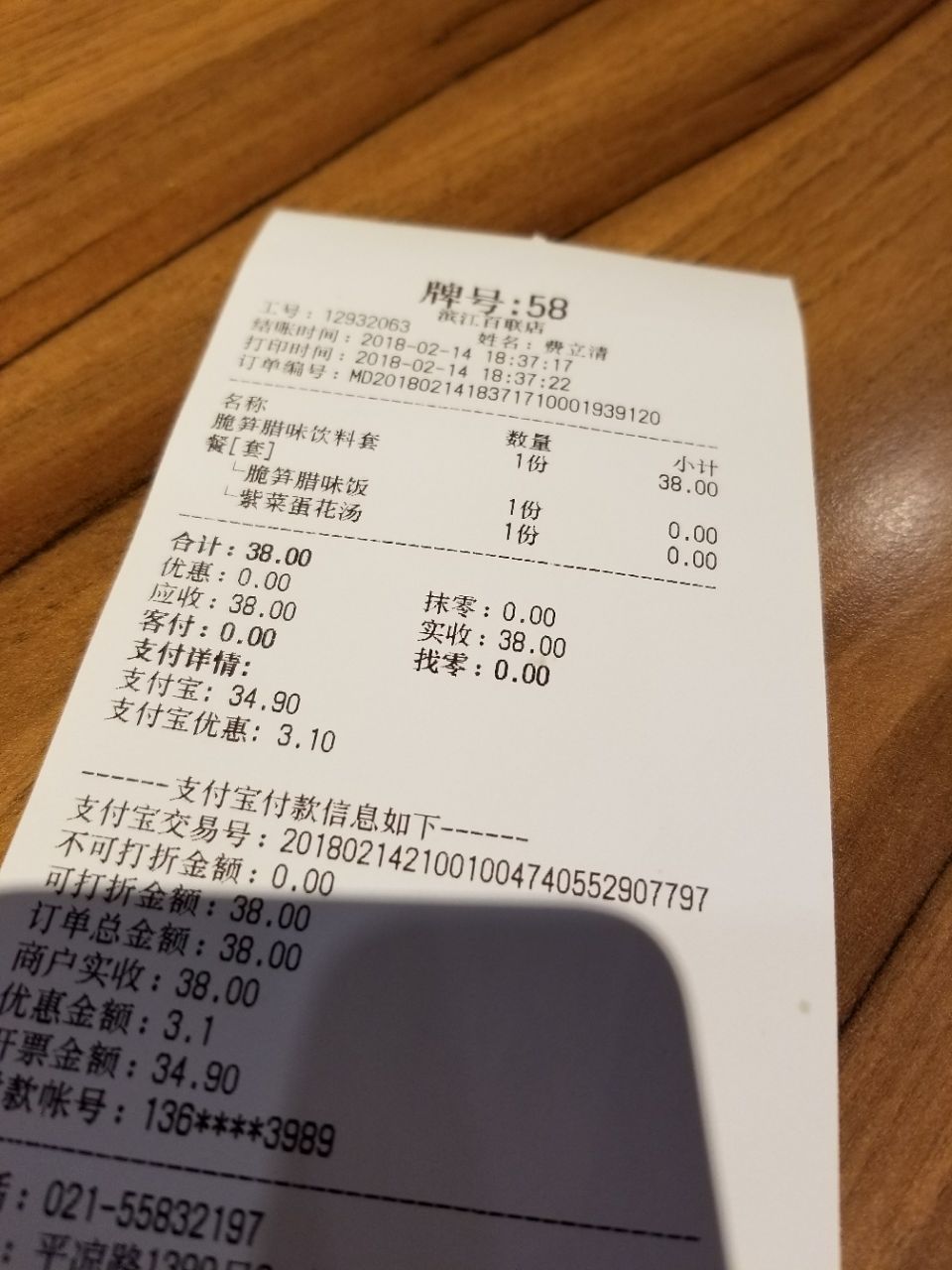 2018-2-14 哈哈哈哈,2018的情人节"大餐",搞笑了 小年夜,本来两个人打算去楼上陆巷喝鱼汤的,结果没座位了,额……因为艾小米白天在外皮了一天,中饭也好晚才吃的,实际晚饭根本就不想吃,所以陪着过来看吃饭! 第一次进来,平常工作日午餐是坐得啪啪满的,小年夜终于可以空荡荡了,色色一一! 好像这里全部都是套餐制的吧,价钱很贵,一般都要30起一套,问题是浇头的量少得来…… 脆笋腊味饮料套餐:38米!腊肉还是香肠大概8片,一点点笋像袋装的口感,一只炖蛋一只大众汤,额……感觉一个正常男生还是吃不饱的,25好像比较合理吧,38这是高铁盒饭价了! 虽然艾小米也没有吃过,但应该也是不会再去的!