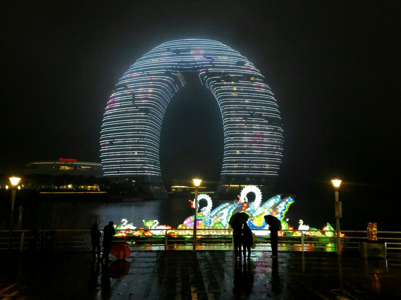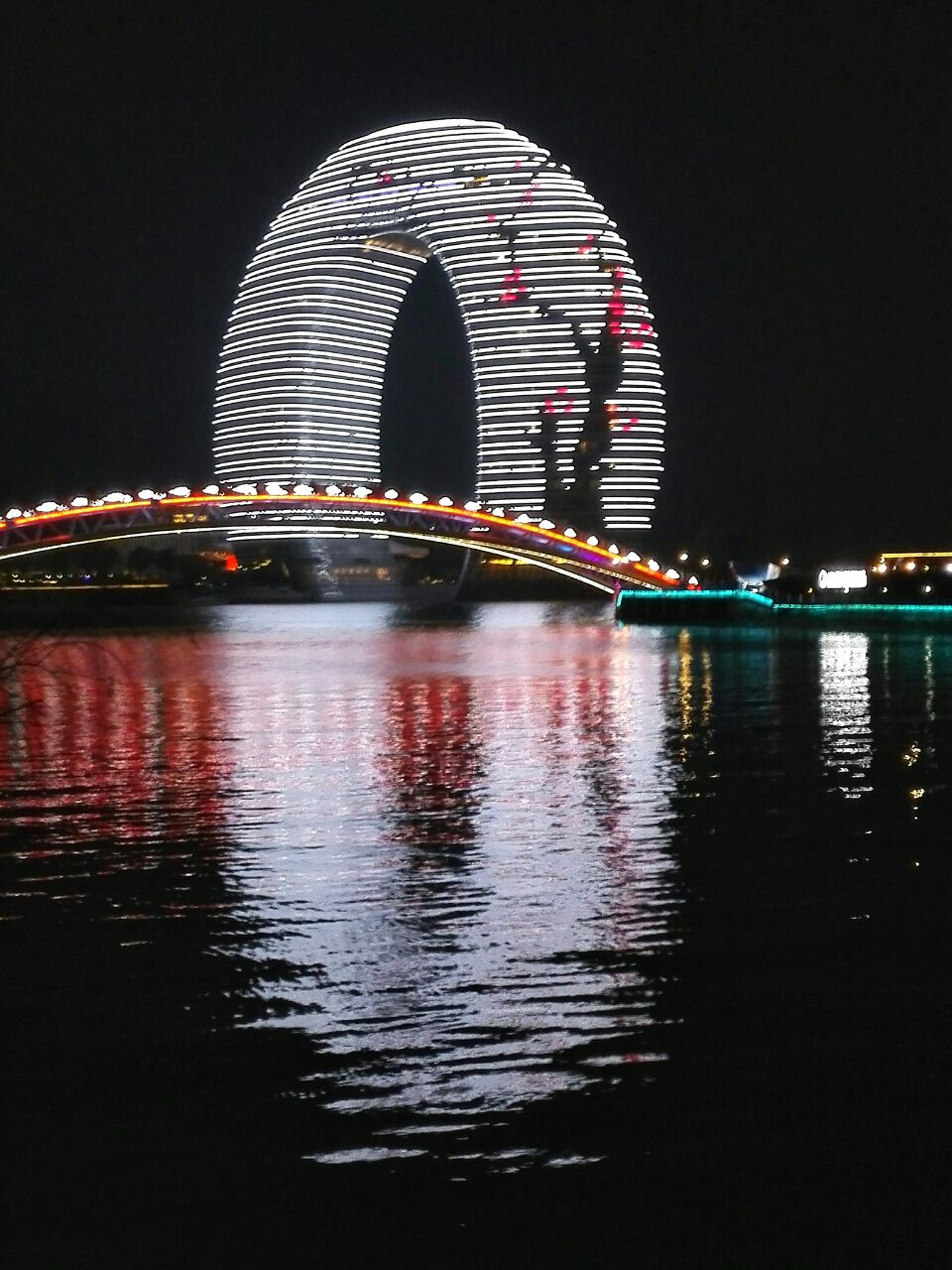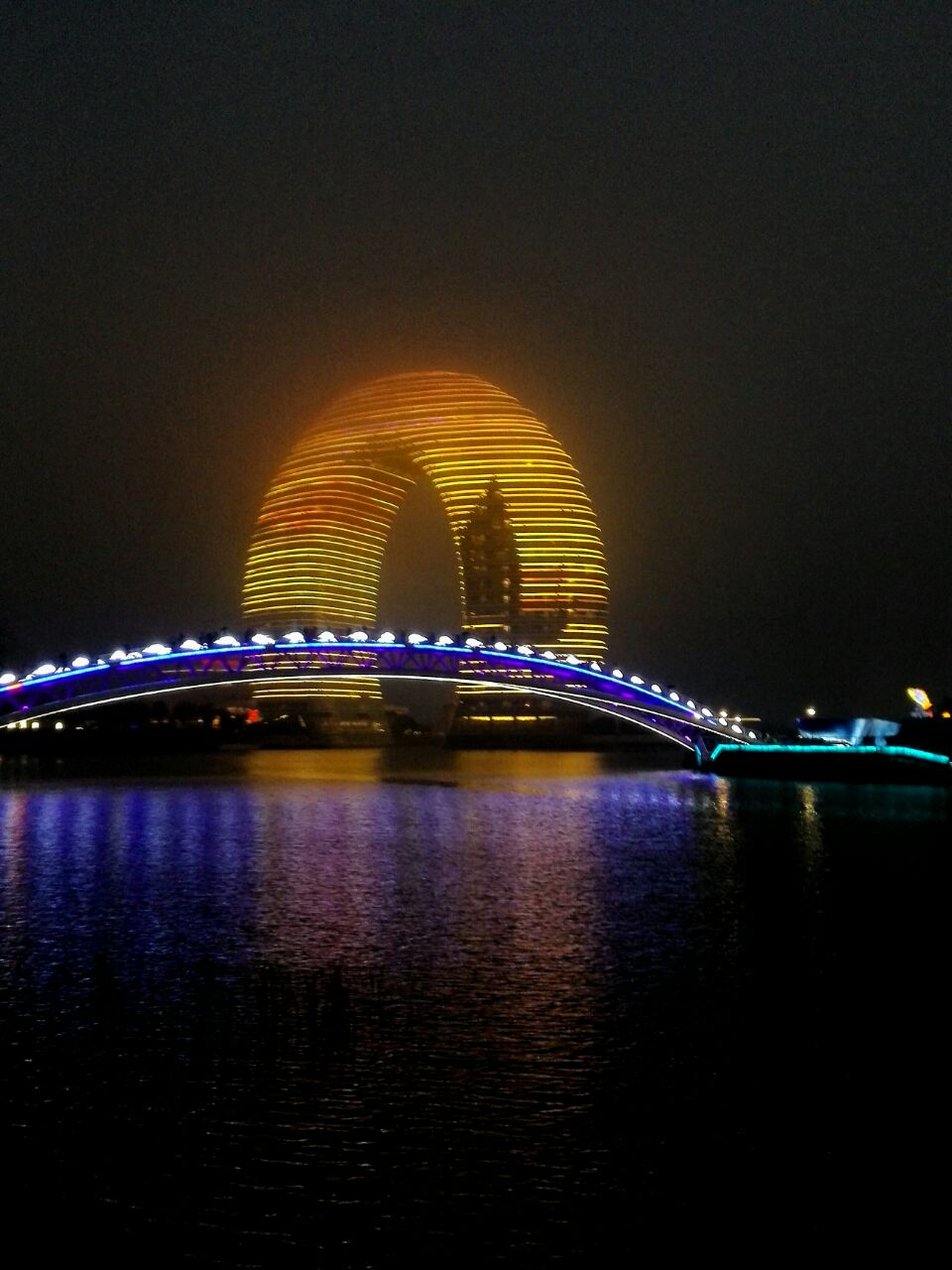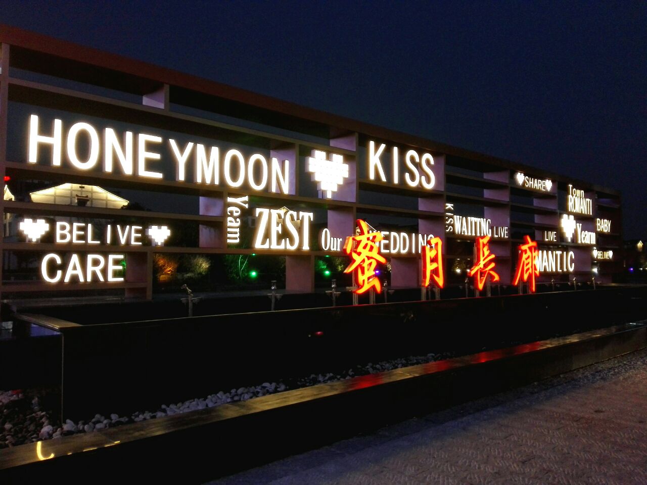 周边有很多宾馆,夜景非常漂亮。离月亮酒店非常近,穿过一个地道就到了。房间空间还可以