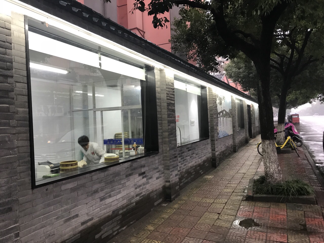 年初五早上沿广济路往南走,经过塘栖大桥,近人民路。临街店面,外墙上有许多风景宣传画。店里墙上有汤包的做法介绍。 既然是汤包店,就选了鲜肉汤包,外加一杯豆浆。 现蒸上来。一笼八个。个大,汤多。吃得很饱。可支付宝买单。