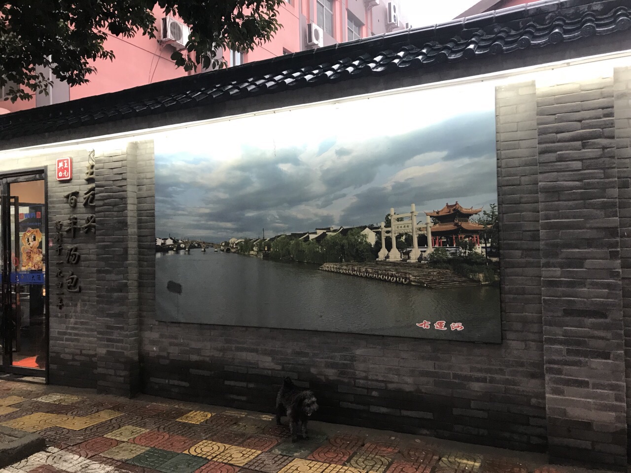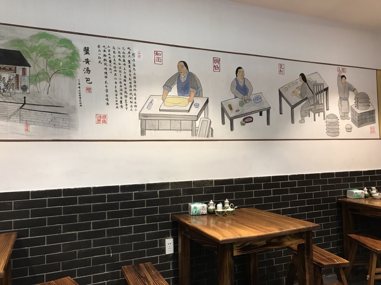 可支付宝买单。临街店面,外墙上有许多风景宣传画。店里墙上有汤包的做法介绍