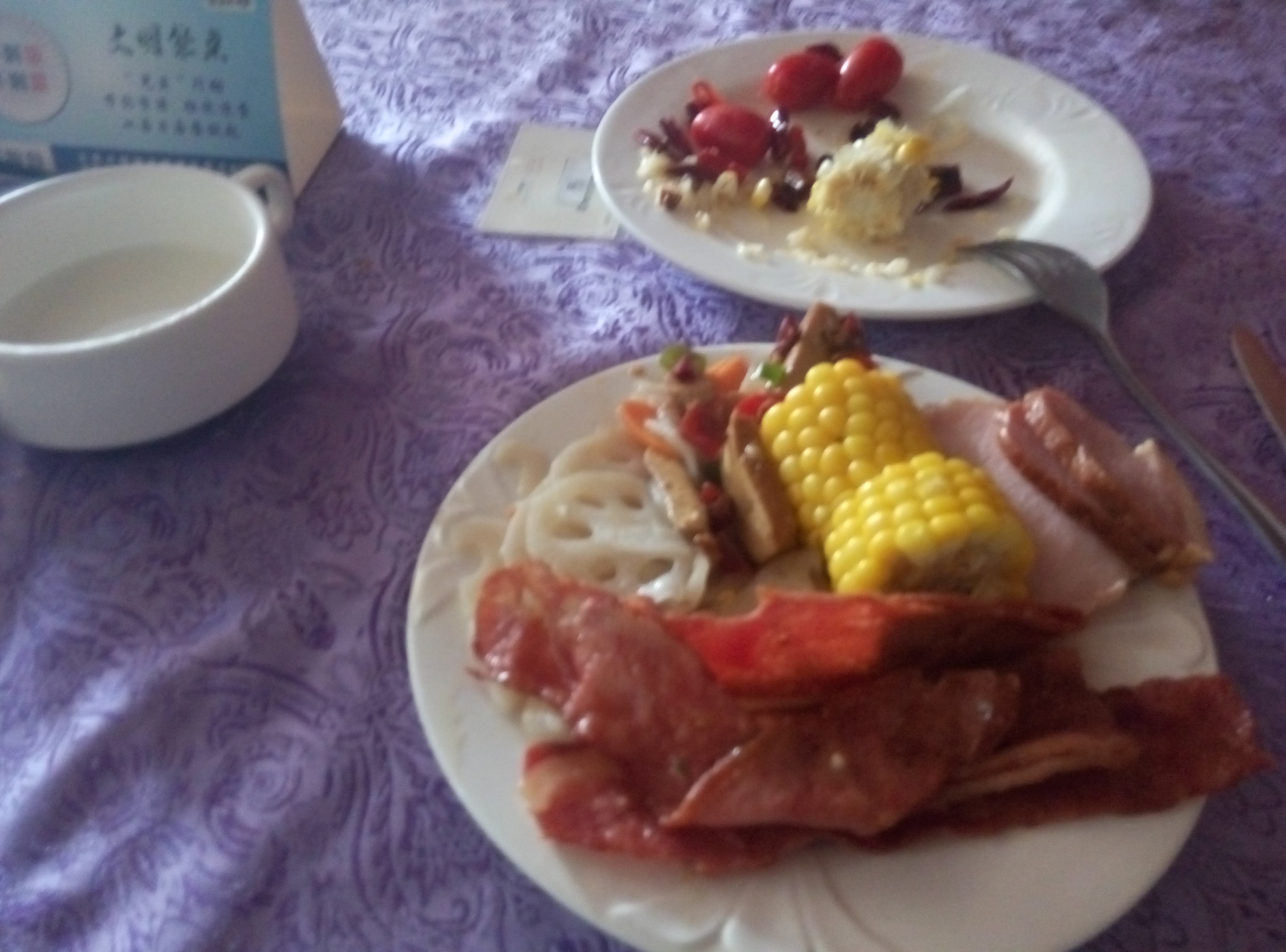 一团火焰记得什么? 如果记得太多,它会熄灭;如果记得太少,它会熄灭。 燃烧的火焰意味着,记忆只能不多不少。 由于前一晚入住了东方锦河大饭店,第二天就在锦河大饭店的一楼法国西餐厅吃早餐,上面不是写的到10.30吗,九点零几分去就没什么吃的了,没看见面包蛋糕点心啥的,还是根本就没有呢,我也不知道。就剩下一点炒饭,菜就只有香干,肉片,还有点土豆丝,藕片,红薯,玉米了,喝的就只有两款牛奶,所剩也不多,没看到果汁,咖啡的,是不是本来也没有的?