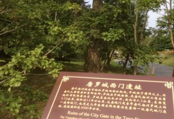 走到瘦西湖公园北门附近,发现这里是唐代扬州城罗城的一道城门遗址,遗址保存得还算比较完好。根据历史资料,唐罗城可能有十三座城门,仅西门就有四座,这处唐罗城西门遗址城门应该就是其中之一吧,从这里往北是一处湖泊,远远望去能够看到的大概是大明寺宝塔吧。