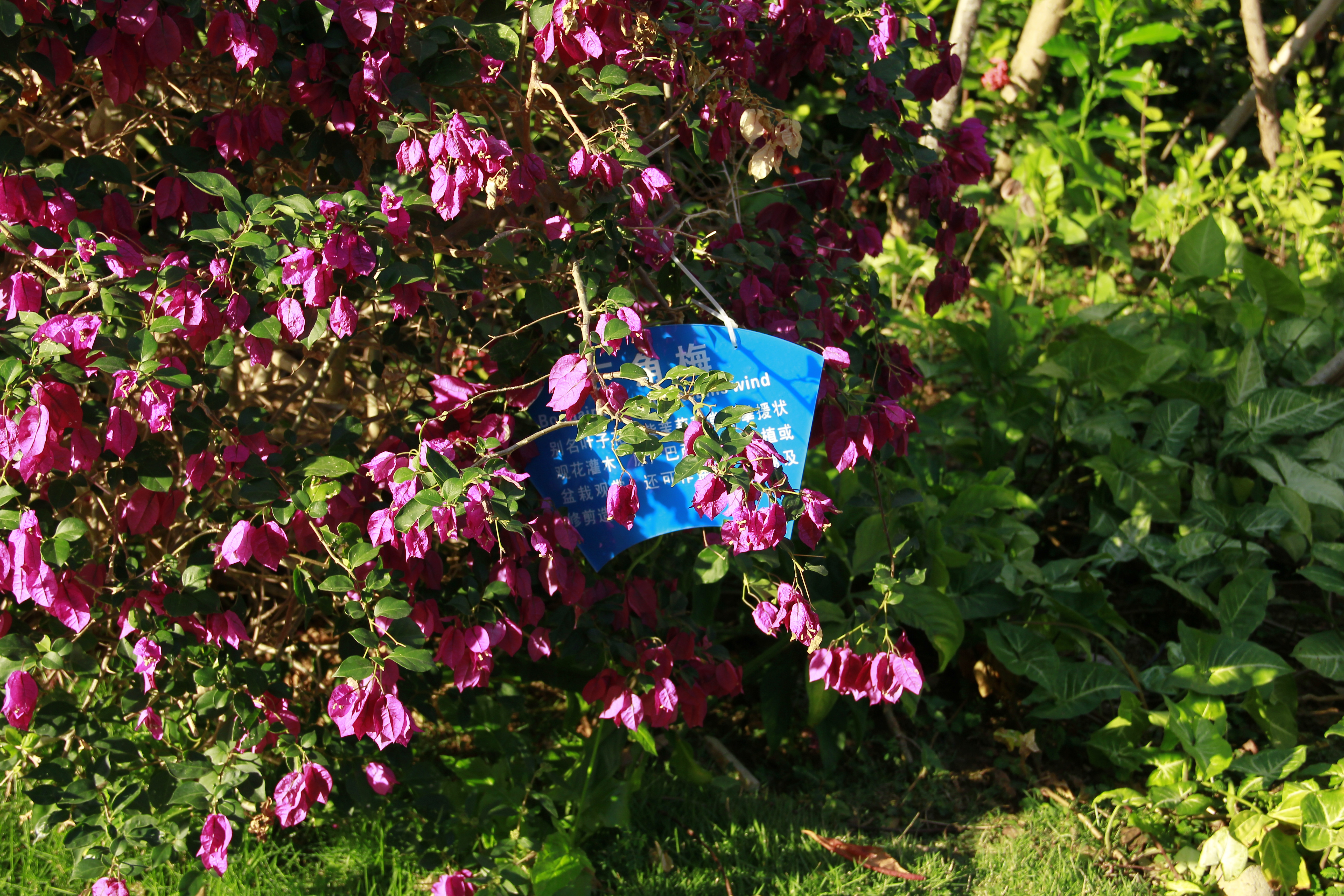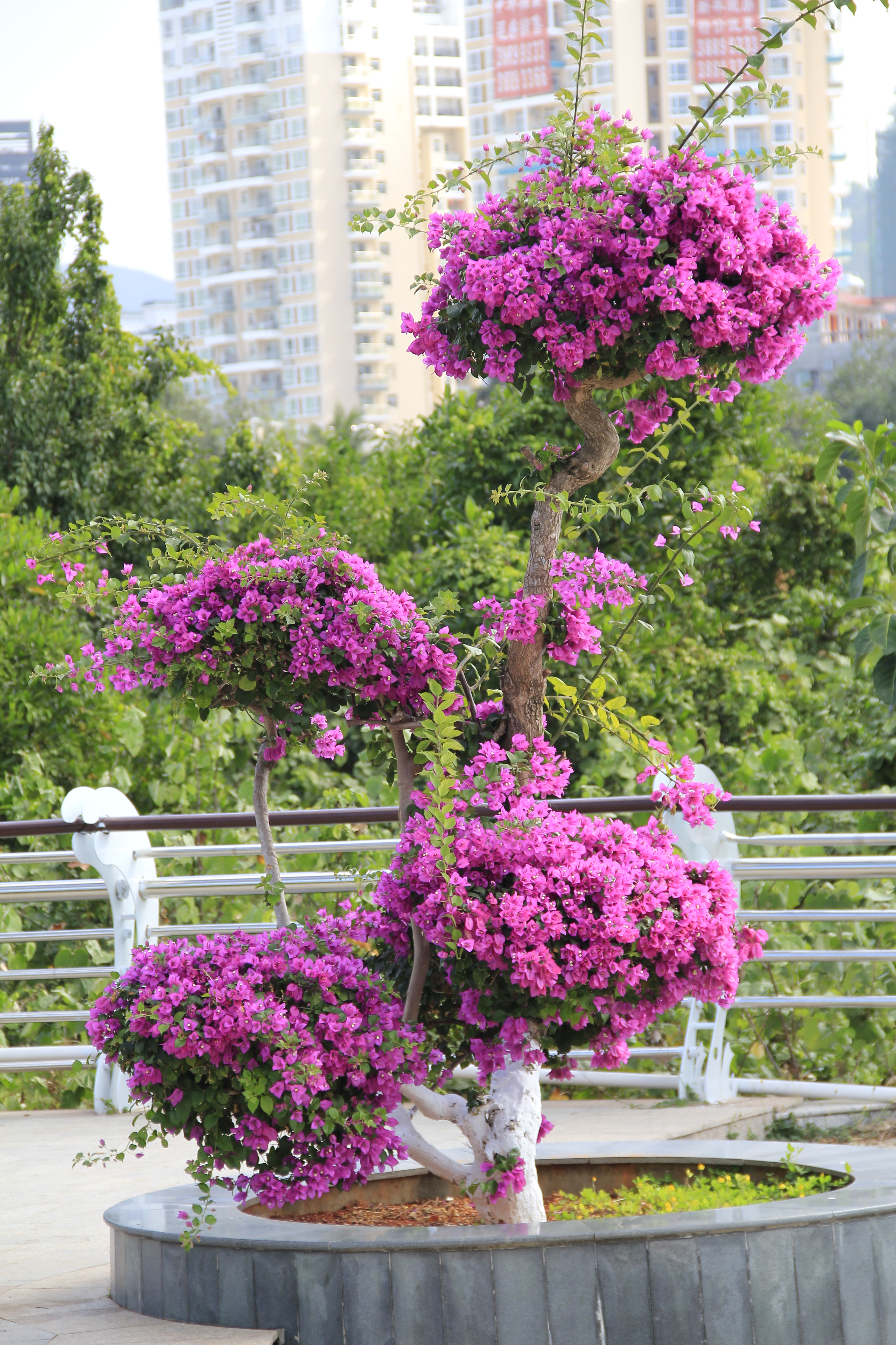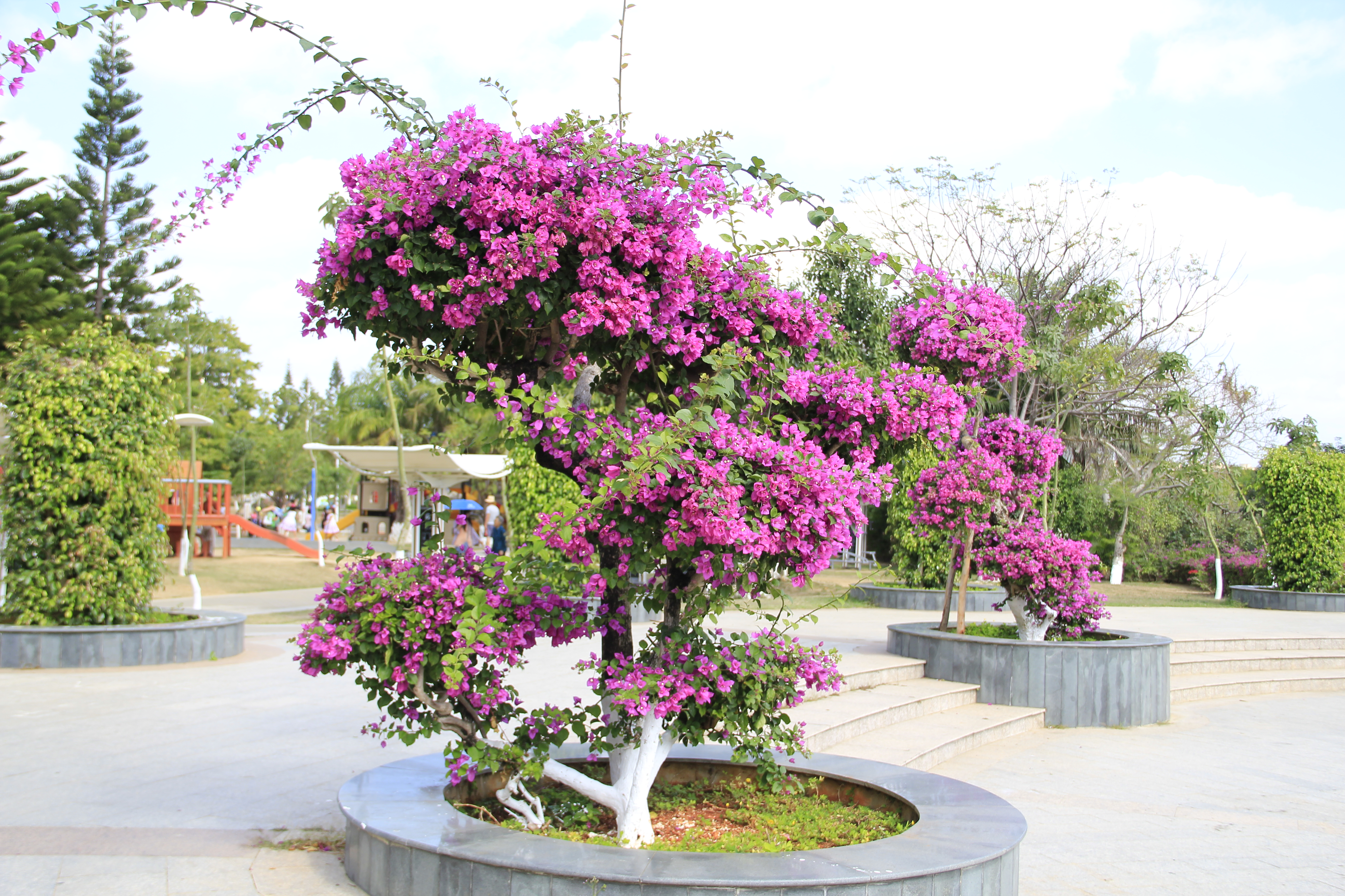 ...,临春河公园为开放的城市公园,在干旱的季节,三角梅盛开的非常好,鲜花茂密,花期开的持续时间较长