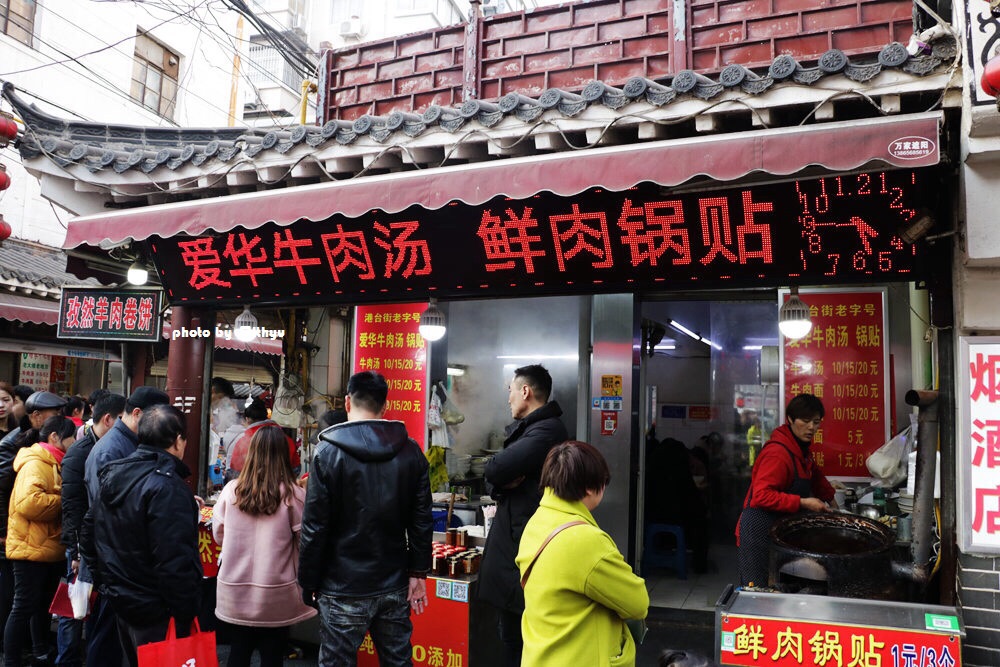 到了蚌埠,大街小巷内都有着牛肉汤,羊肉汤,而对于爱喝汤的人来说,怎么可以错过呢? 在蚌埠百大后面是一条小吃街内有间爱华牛肉汤,可以说是从小吃到大的,一碗牛肉汤加上一份锅贴,那可是最佳的搭配。如今增加了羊肉卷,夏天来吃时还无需排队,如今是每天都排了长队,懒得排队的人就失去了口福,好在夏日吃过,并无太多的遗憾。 店铺不大,很迷你,在这繁华的地段算是不错了,仅有三四张桌子,一进室内就闻到那浓浓的牛肉汤香味,非常诱人啊。 牛大骨加上牛肉炖出的汤头非常浓郁,这里的牛肉汤从10元起,增加一档就多些牛肉,食量不大的人按常规点了一碗10元的牛肉汤,汤内不但有牛肉,还有着粉丝,千张,并加入了香菜和蒜苗。 再加上两元的锅贴,一面煎的香脆,一面软嫩,内里的肉馅咬下去还有汁液,这里的锅贴也是非常有名的,常常来这里不吃牛肉汤也要打包些锅贴。 喜欢吃辣的人,可以加上辣椒、醋在牛肉汤中,味道非常不错,不吃辣的人就喝上原汁原味的牛肉汤吧,那口感也是棒棒的。 10元的牛肉汤内,牛肉不多,但份量也是够了,最爱的不是肉而汤中的粉丝的千张,浸入了牛肉汤的香浓,比牛肉还要来的美味。 一口汤来一口锅贴,真是超级满足啊。这样的一餐,你爱吗?