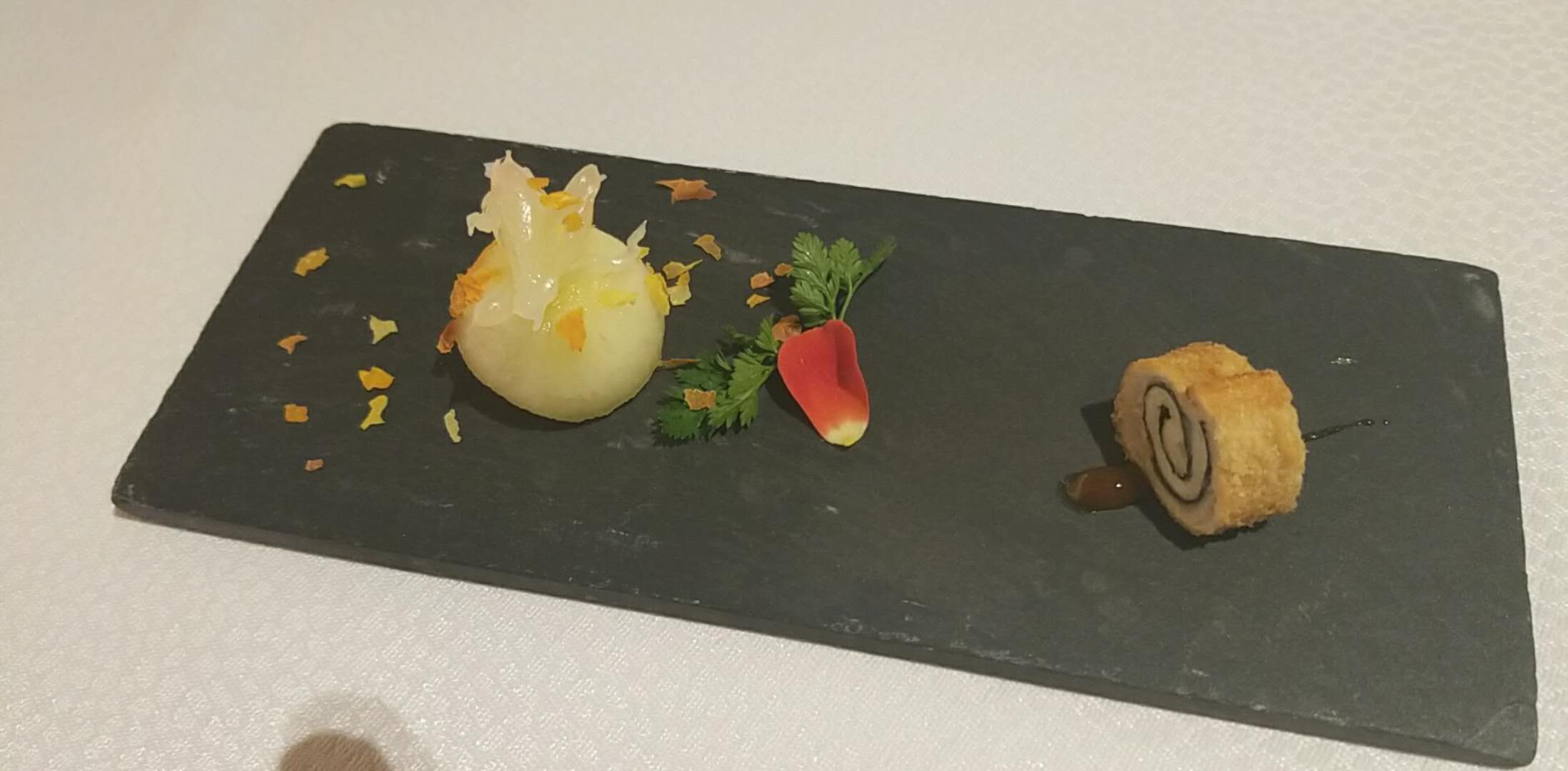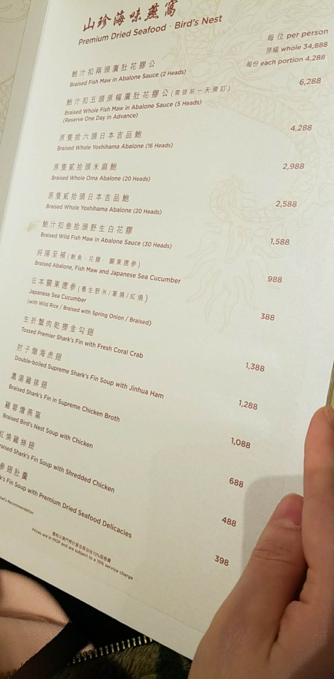 这次来澳门度假,住在新濠影汇酒店,到这个饭店来吃饭,自然是有地利的优势。 高大上的环境,服务又细致到极致,对着一道道美味,先享受一番,才舍得开吃。 当然价位也是可以的。 每道菜都不错。有时间多住,有金钱的话应该把菜单上轮着体验一番。