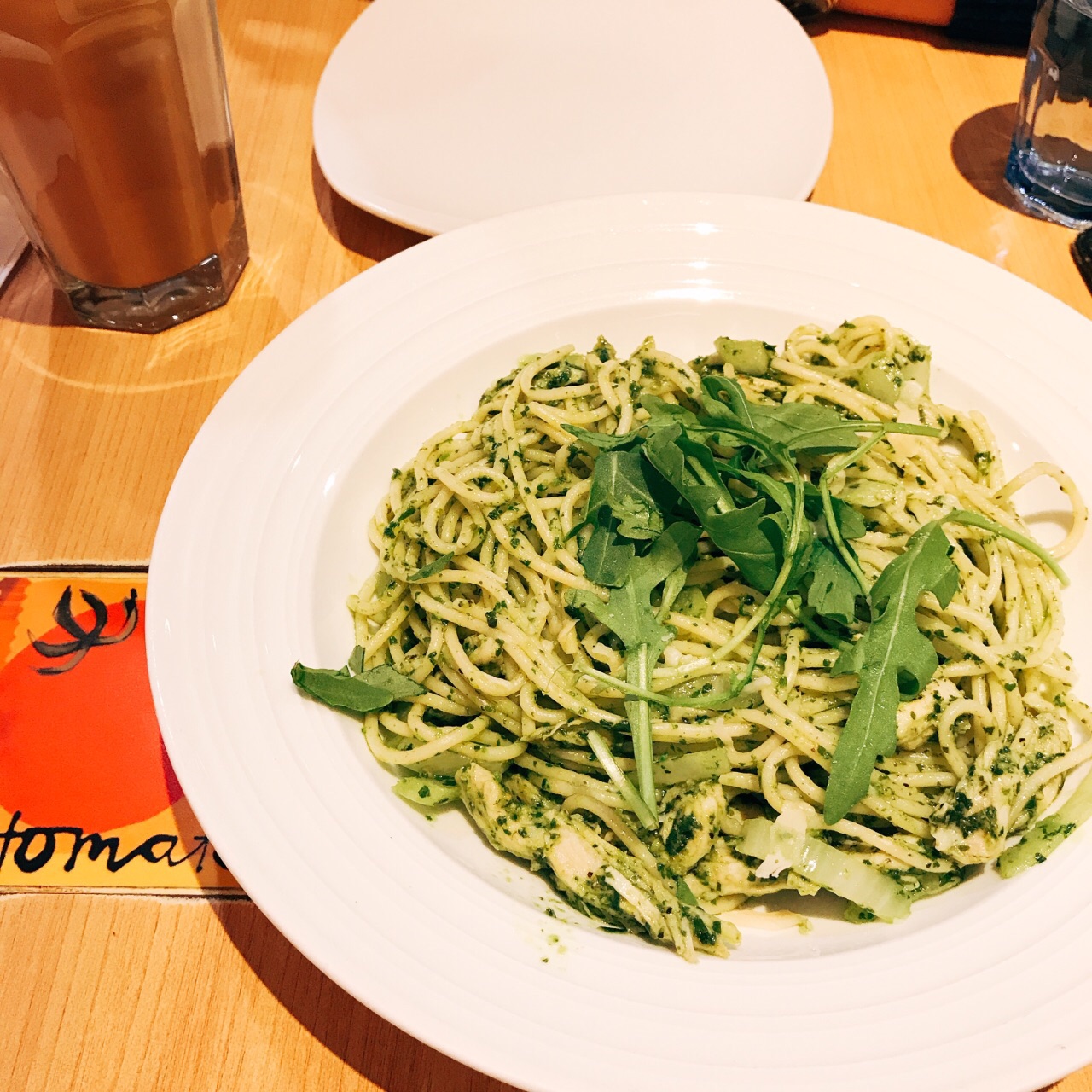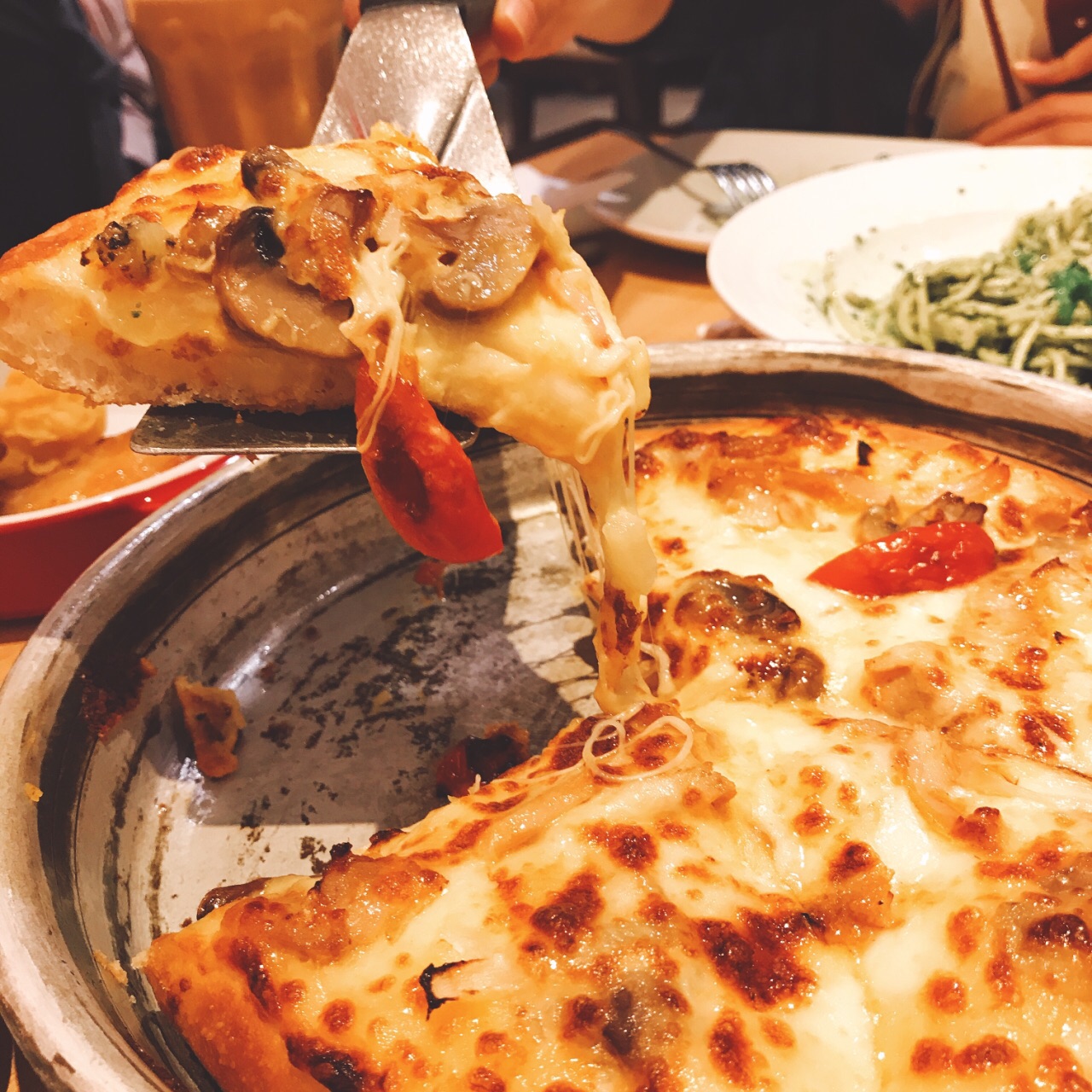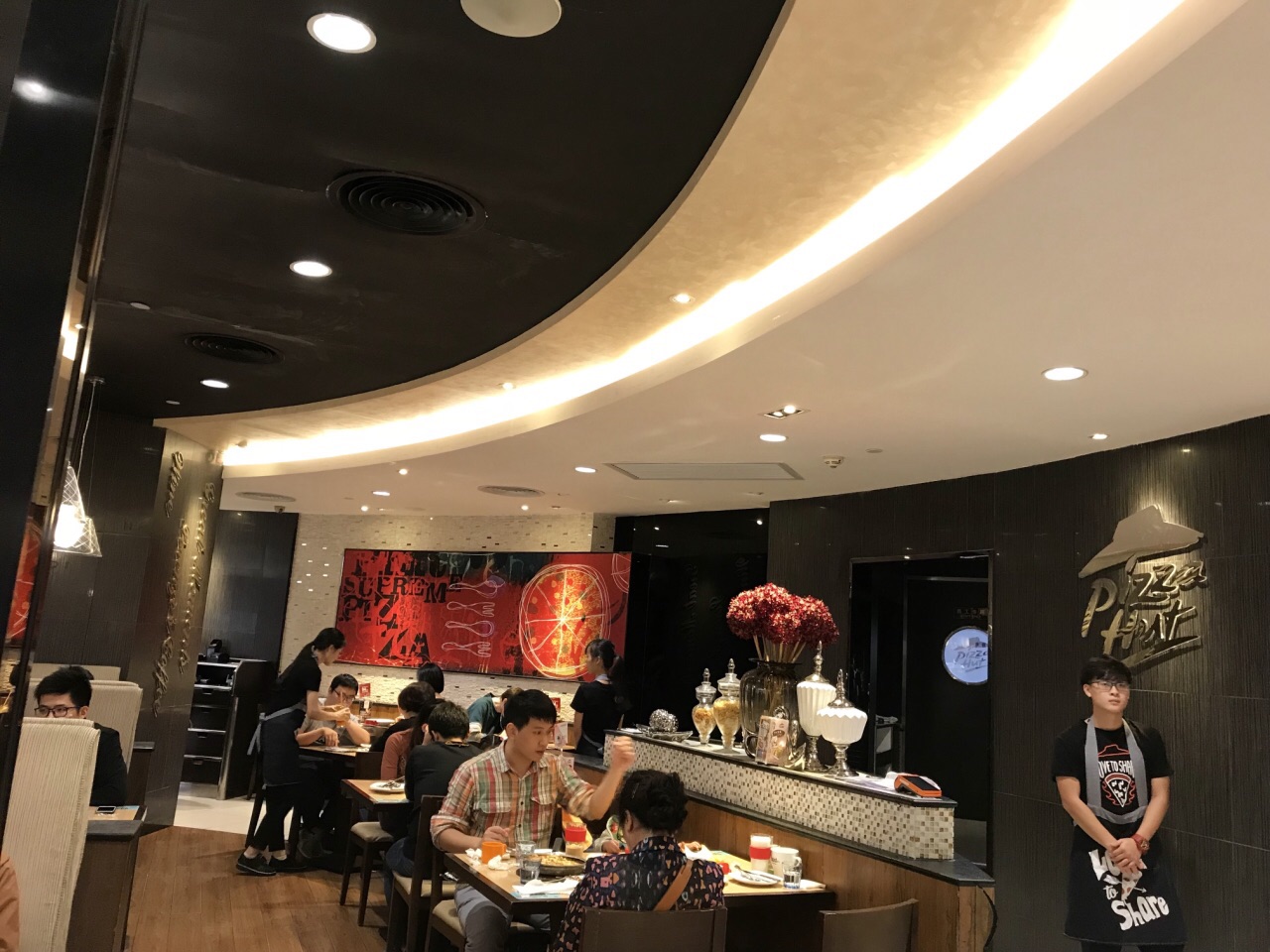 [交通] 在万菱汇负一层靠近扶手梯处,挺好找的。建议早点来排位,一到饭点高峰期就需要排排队,但换桌率还是蛮高的,不用等很久。 [装修+服务] 这就不详细说了,西式年轻化,到时的必胜客都差不多样。感觉服务员们都很忙…柠檬水是自助,套餐下单时服务员们都很熟手~ [出品] 我们是刚好有券就过来吃,但实际上那个是团购券呵呵,商家诱惑顾客来消费罢了~好就好在,我觉得现在出品比以前好一些了。 罗勒意面:觉得罗勒的味道还好,不会太重,总体比较清爽,但一盘绿的我觉得可以加点小番茄点缀一下啊,不然会有点让人缺乏食欲… 鱼籽酱虾球+浓情烤翅配千岛酱:套餐里的小吃拼盘,感觉还好,烤翅比较入味,虾球个还算大,虾肉有点松,味道还好 pizza:我们点的忘了哪款pizza了,看起来像超级至尊的,可能因为人多所以上得比较慢,烤得还不错趁热吃会有拉丝,但底比较厚…很饱肚