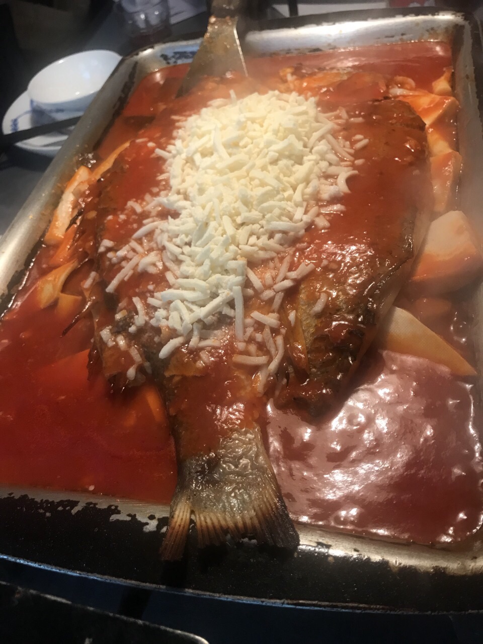 是一家很有特色的烤鱼,环境令人印象深刻,与吃过的很多烤鱼店不同,他家的口味很多,而且很独特。点的番茄芝士的烤鱼,味道虽然一般,但是肉质绝对是上佳的,以下三个单点的菜品还需加强!奶香小馒头没有了炼乳缺少太多味道,手撕鸡味道不够!