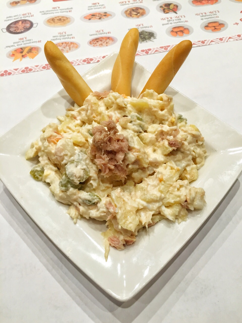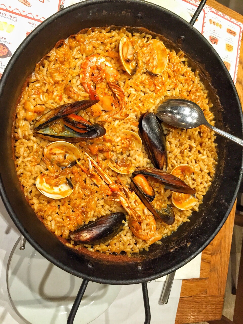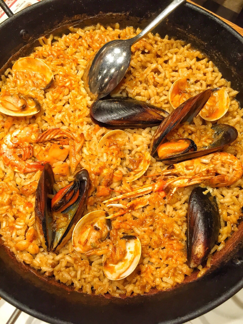 总评: 这家店在网络上口碑挺好的,tapas品种很丰富,选得眼花缭乱。 分店比较多,生意都不错,店面装修比较简洁,环境还可以吧。 菜品统一都不会太贵,在当地算是大众消费了,可以说是价廉物美吧。 服务我觉得一般般,不太热情。 上菜比较快,海鲜饭稍微慢一些。还不错,可以试试。 评分:80分 性价比:❤❤❤ 他们家的海鲜饭就比较软,我相信国人都会很习惯很满意的。 平日出去旅行,都习惯错开饭点吃饭,因为时间很灵活嘛,走到哪儿吃到哪儿,没必要在饭点的时候去跟着排队,多浪费时间。 这家店是我们逛街的时候路过的,看店里空位比较多,就进去了,反正吃多吃少尝尝嘛。 【土豆青豆金枪鱼沙拉】3.65欧 这个沙拉我觉得蛮好吃呢,只是造型挺搞笑的,差了三根硬硬的面包棒,意义不大嘛。 土豆和青豆都很软绵,而拌匀的金枪鱼罐头肉碎在里面特别香,调味的沙拉酱也很增香。 很开胃的一道小菜。 【烤牛肉串配小蘑菇】6.05欧 牛肉切得比较大块,嚼起来很有嚼劲,看肉质的纹理觉得肉还是多不错的。调味比较简单。 旁边搭配得小蘑菇比较白味。 【西班牙海鲜饭】12.5欧 看起来很大一锅其实份量我觉得还好,两个人吃绰绰有余。 因为锅虽大,但是是平底的,并且这个米饭铺得比较薄。第一勺下去就晓得它的实际内容了。 海鲜饭的颜色很好看,金黄金黄的,汤汁比较充足,米粒比较软糯,吃起来有点盖浇饭的那种感觉,黏糊黏糊的。 海鲜包括青口、小贝壳、虾、鱿鱼颗颗。味道我觉得不错,虽然有点咸,但是很入味。 我们把这一锅吃得干干净净的,一点儿都没浪费。 简单的一餐,吃得饱饱的,继续逛+买+吃。