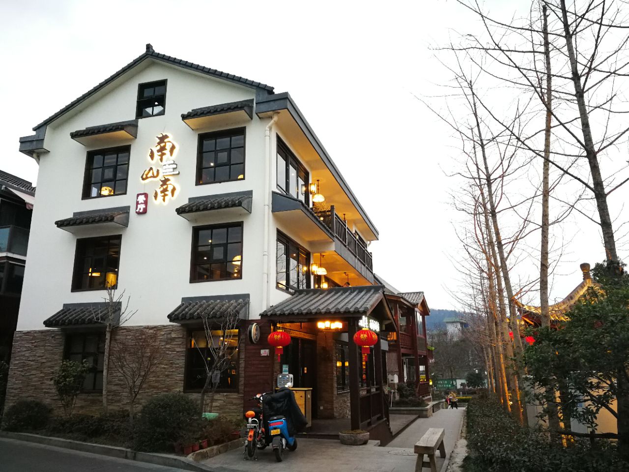***【环境】*** 青芝坞的这家南山南就在青芝坞路和玉古路交叉口的西北角,紧挨着路口的这个公园。晚上的灯光亮起,原来这里还是支付宝示范街区。亭子的角上,大红灯笼高高挂起,年味儿真是越来越浓了。 白墙黛瓦,青芝坞一带统一的着装。门口一排银杏树,秋天的时候一定美翻了。 玻璃窗很大,靠窗的位置可以看到外面公园的夜色。 餐厅内装修古朴雅致,随处可见书籍、光碟,还有些老底子的器件,是要把文艺小清新进行到底的节奏。 ***【菜品】*** 团购了工作日可用的套餐,又点了些别的菜。 南山元宝虾,58元。端上来就鲜香四溢。一份近20只,色泽红亮。虾肚子开刀烧制,虾肉很入味。虾肉新鲜,肉质Q弹,虽是油炸烹饪,却吃不到油腻感。 木瓜炖桃泥,28元。这个菜应该算是个糖水,或者水果羹之类的东东。用的食材倒也丰富,有木瓜、猕猴桃、菠萝,还有桃胶(应该就是菜名里的桃泥)。不是很甜,喝起来很清口,还不错。 南山南烤鸡,58元。招牌菜,摆盘够霸气!看惯了身体缩成一团的烤鸡烤鸭,他家的烤鸡倒是大方,扒开这双腿,头朝天空,感觉在向天歌,又像是要展翅欲飞。配了一次性手套抓着吃,不过刚烤好的整只鸡非常烫,手动分解可得小心了。爸妈不吃辣,觉得吃原味的就很香很嫩很入味。我蘸点辣椒粉吃,感觉会更过瘾一些,吃起来不柴不腻。 手捏菜蘑菇,18元。点缀了一点红色的干辣椒,卖相挺不错。菌菇有两种,叫不上名来。整个菜咸鲜味,做的OK的。 干锅包心菜,10元。这个是加点的菜,卖相比较乡土,好像跟文艺没啥关系了。手撕包菜配五花肉,挺香的,但也比较油。问题是,这菜居然是辣的(很辣),点菜系统里还没标注,服务员也没提醒。我和爪子吃是没问题,但我不会吃辣的老妈吃了喉咙难受。 西湖酱鸭,32元。老妈不是很爱吃鸡肉,于是就点了她喜欢的鸭肉。酱板鸭也是杭州特色菜了。他家的一份半只,带着点烟熏味,咸度适中,肉也比较多,我和爪子也都比较喜欢,推荐! 饮料点了玉米汁,甜度适中,中规中矩。 ***【服务】*** 上菜速度快的,可能我们去的还算早吧,嘿嘿。 作为支付宝示范街区内的店铺,他家也是示范的无纸化餐厅。点菜扫二维码就可以了,收银更欢迎使用支付宝。 提供的纸巾也是本色的,感觉很健康。