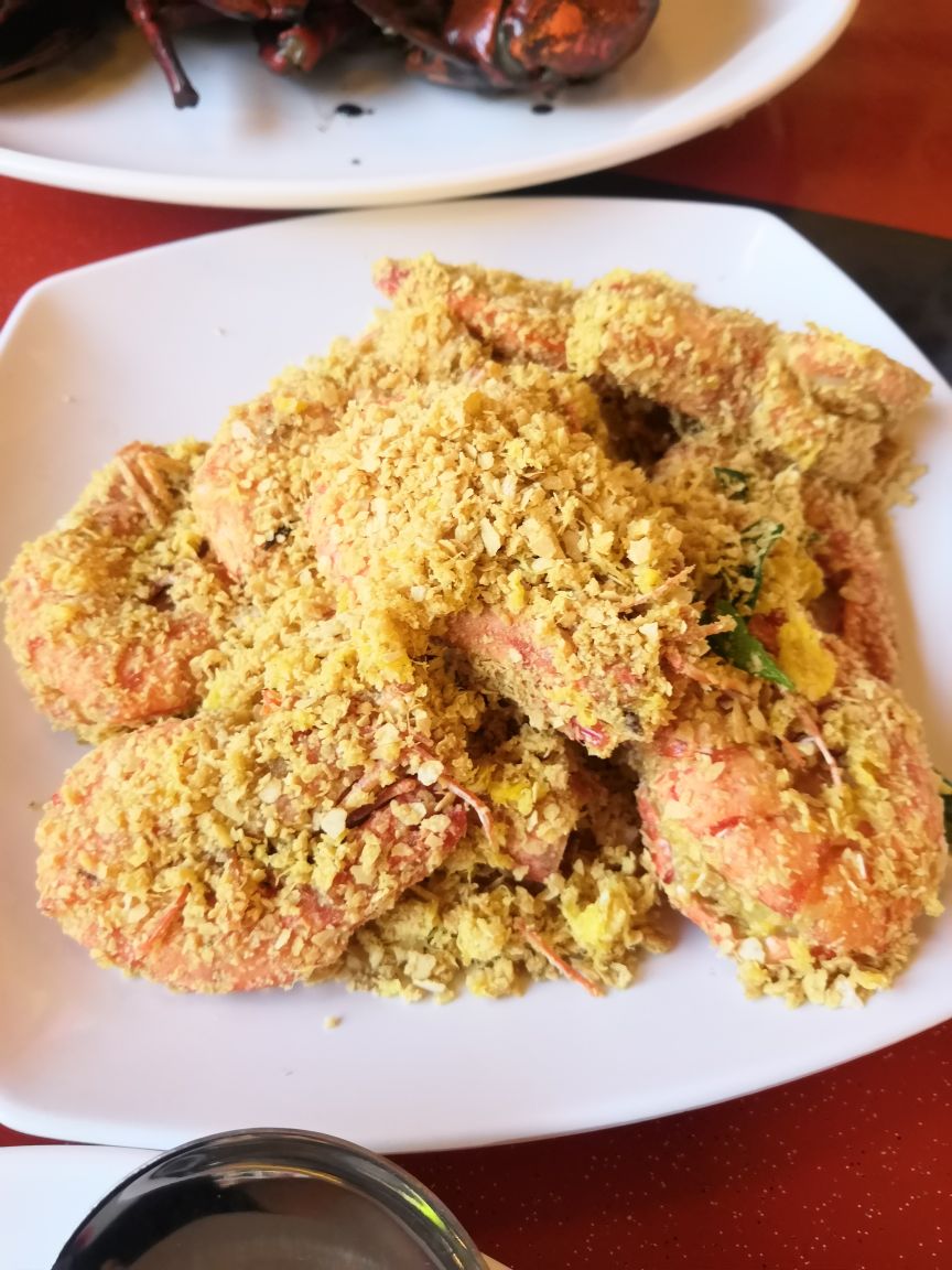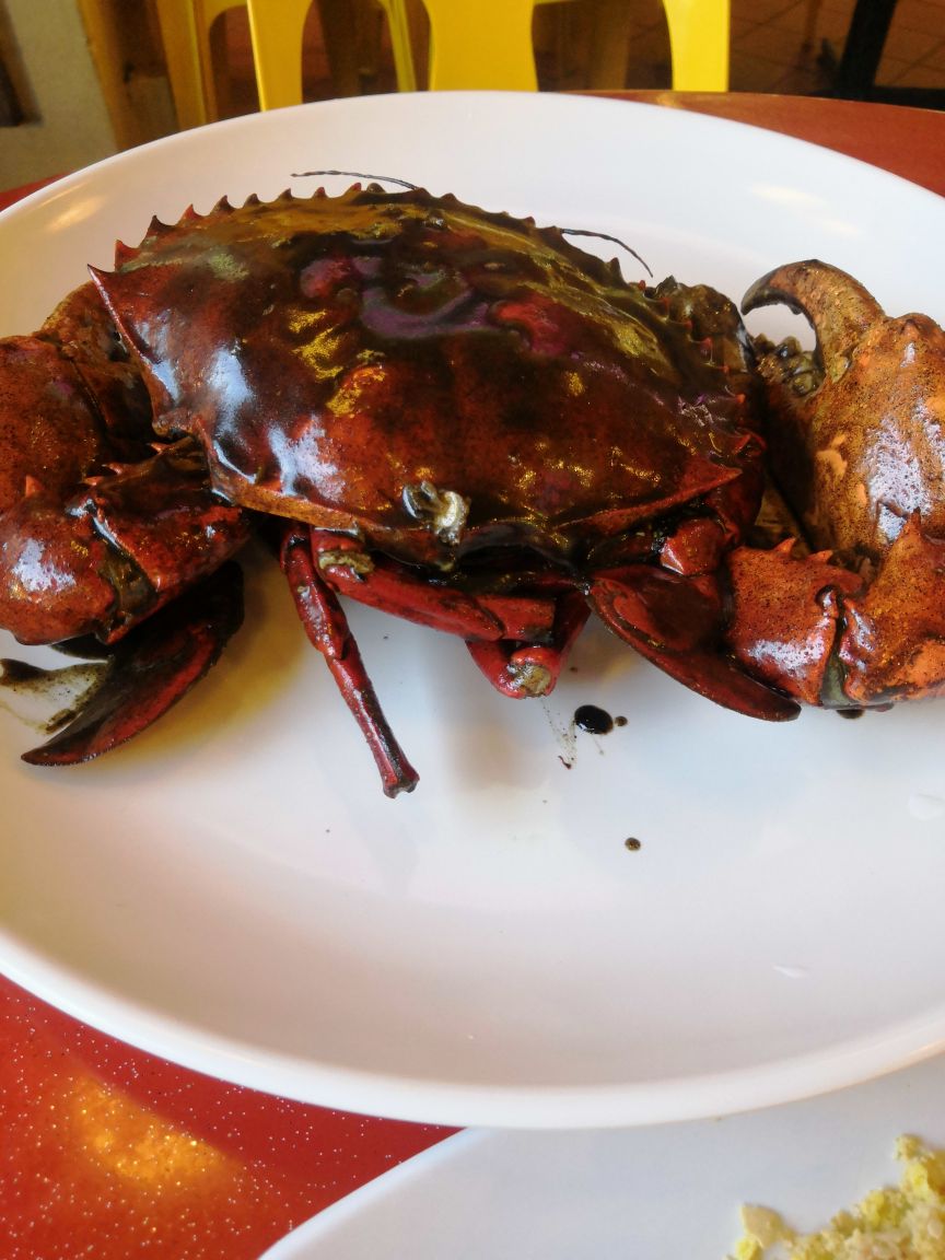 来牛车水,熙熙攘攘的人群让人摸不到方向。又是饭点,就在附近觅食,似乎这家还行,开起了坡县第一顿蟹餐! 黑胡椒蟹:黑胡椒酱汁味道不错,蟹壳好厚好硬。 麦片虾:稀饭外面那层香甜脆的麦片。 空心菜,感觉好久没吃到蔬菜啦!赞。 莱姆水很好喝。 大排档的环境,服务热情。