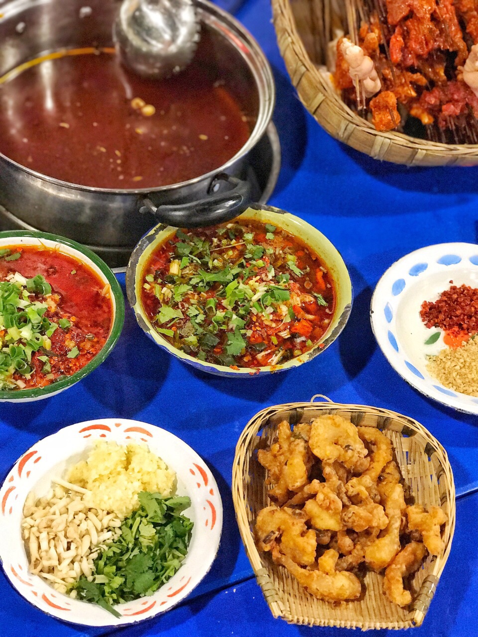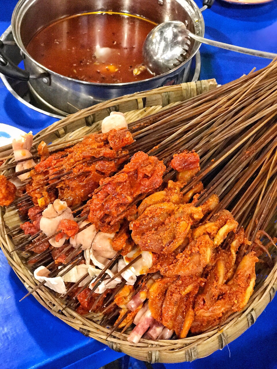 这是一篇应该写在天府四街店的点评,但是因为那家我已经写过了,所以就放这儿吧。 都是一家店,口味肯定也都差不多,也就是环境和服务还有火爆程度的差别吧。 如果你不想排队等太久,也不嫌天府四街太远,建议去四街的那家店吃串串。 5点去,肯定有位置,绝对不排队。 同一时间点,也肯定比其他店要人少一点。 2018年截止今天吃过两顿串串,两顿都是马路边边。 主要是他们家太火了,而身边的小伙伴都是喜欢凑热闹的人,所以不同的圈子选了同样的串串店。我恰好都参与了。 串串锅底有两款。一款比较香但是不辣的,另一款是更麻辣一点。 不辣的锅底适合不太吃辣椒的人,整体很温和,可以毫无负担的吃开心。 麻辣锅底其实我觉得也不辣,只是看起来辣椒花椒更多,牛油更重点,颜色更深点。 干碟,是他们家的重要灵魂伴侣。反正我是要吃5个干碟的啦。 干碟的辣椒分两种,都不会很辣。黄豆花生粉很香很重重要。根据喜好可以加香油、香菜、葱花、蒜泥、折耳根颗颗,调一碗油碟。 【串串】上一篇已经详细写过了,大概写一些吧。麻辣牛肉、香菜牛肉、猪皮、儿菜头、折耳根、嫩牛肉、鸭掌、掌中宝 。。。。。 都还不错。 【冒脑花】脑花还是比较入味,建议夹小块之后,拌一拌再吃更麻辣哟。重口味的小伙伴可以考虑,直接用这个碗里的调料当油碟,绝对比自己调的巴适! 【冒牛肉】 牛肉片很嫩很香辣入味,可惜量太少,一人一片就没了,垫底的是土豆片,略带脆口的那种。 【冒宽粉】 建议一次性至少点两份。份量不大,而大家都很爱它,所以根本不够吃啊,特别吸味,里面的豆芽也很脆嫩,宽粉的软硬度也很适宜,晶晶亮的透明状态哦。 【冒千层肚】 有种吃火锅千层肚的错觉,牛油味很浓,味道还行,比较香 【酥肉】一条一条的比较短,炸得有点太干了,并且肥了些,看起来都是半透明的。 【兔腰】是那种干拌的兔腰,纯粹的干辣椒干拌。虽然很嫩,但是因为不太喜欢兔腰本身,所以无感。 还有些什么我忘了。反正串串就是想吃什么吃什么,人多人少都不怕。都尝尝嘛。