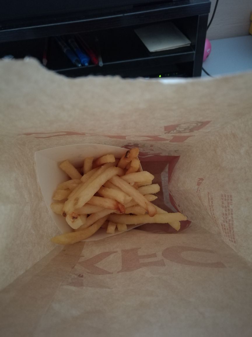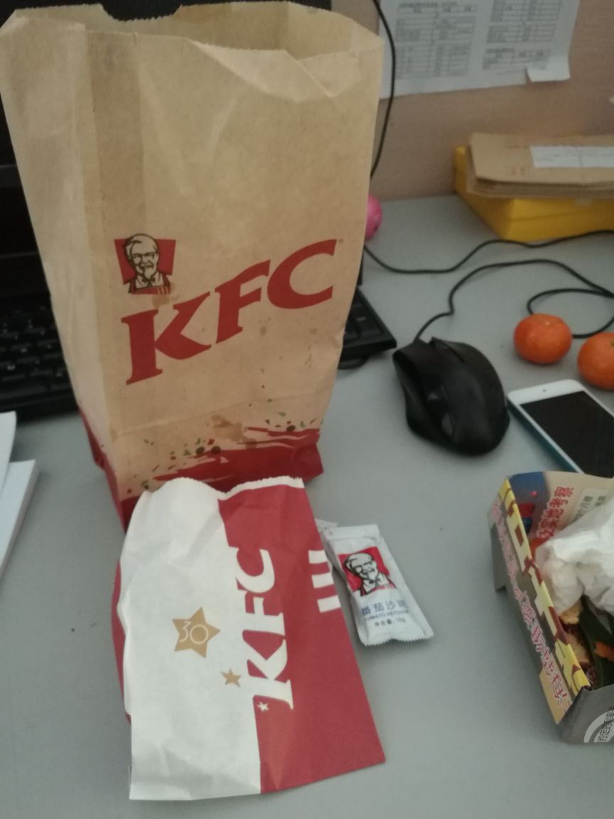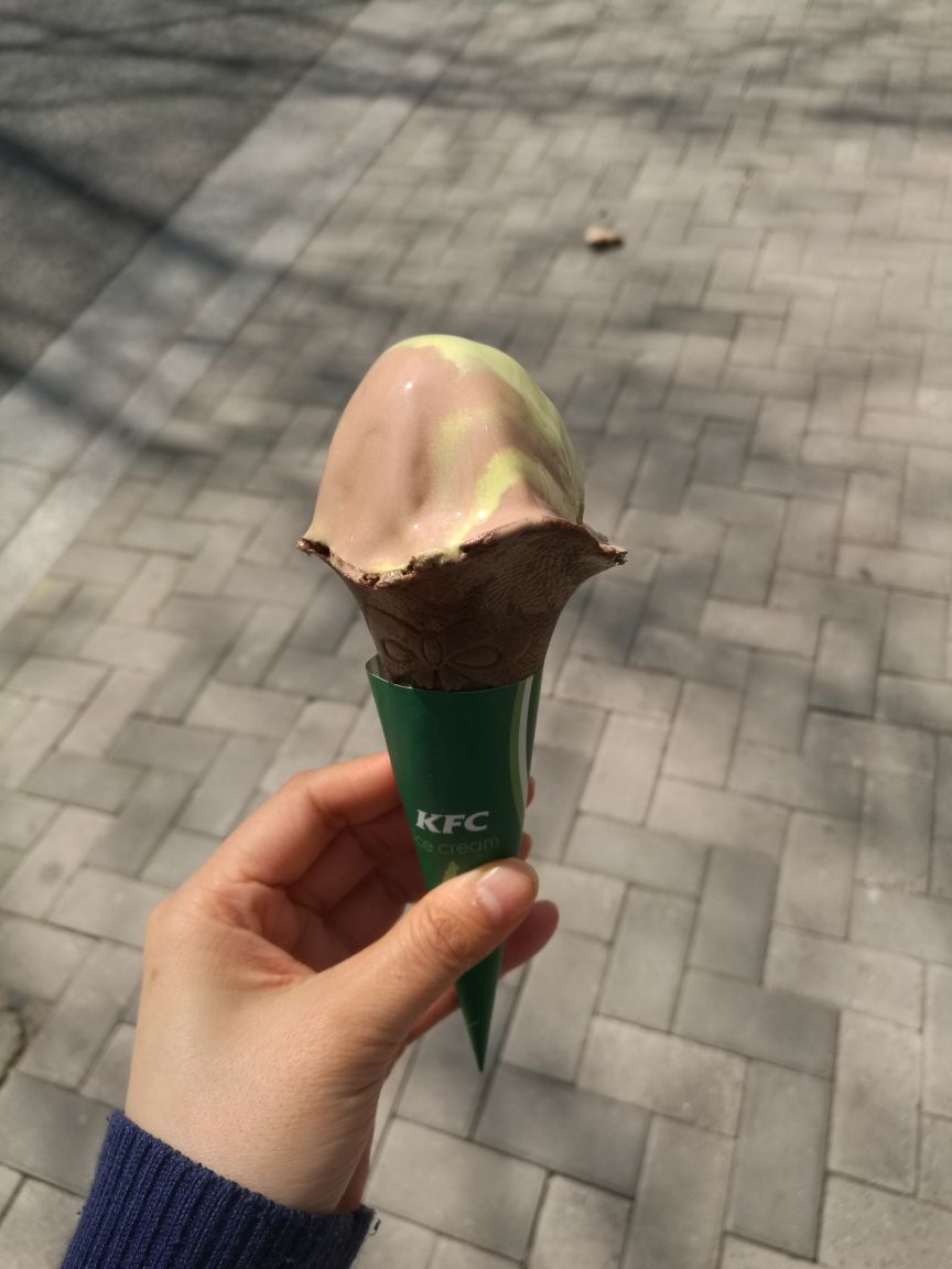单位午饭真的不好,趁着阳光明媚,去昌平路地铁站的肯德基买了点午餐,手机点餐,还没到点就点好了,到店以后立刻就能取走,到店以后发现冰激凌也不错,又网上加了一单,抹茶巧克力冰激凌只要8元一个性价比好,而且真的好好吃,其他就买了辣鸡翅2对薯条一份还有个新品避风塘鸡腿反正只要10元
