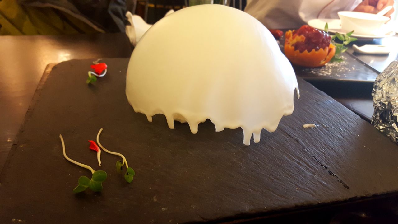 名字很美…可以說事實是一道甜品,白巧克力球裡面牛奶小方,配上淋上的巧克力醬牛油果油條蝦,和含苞...