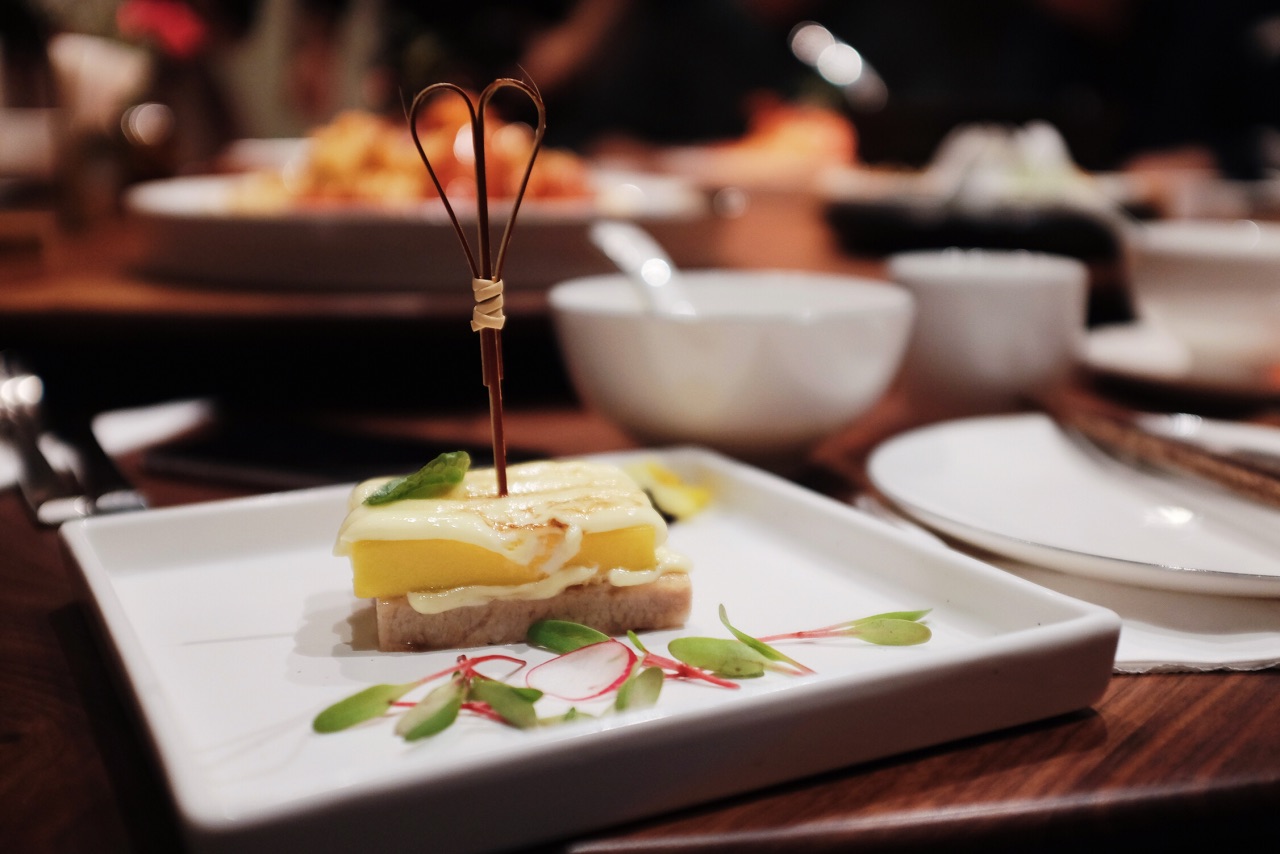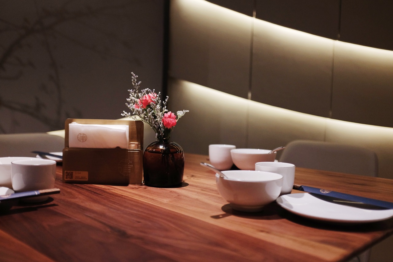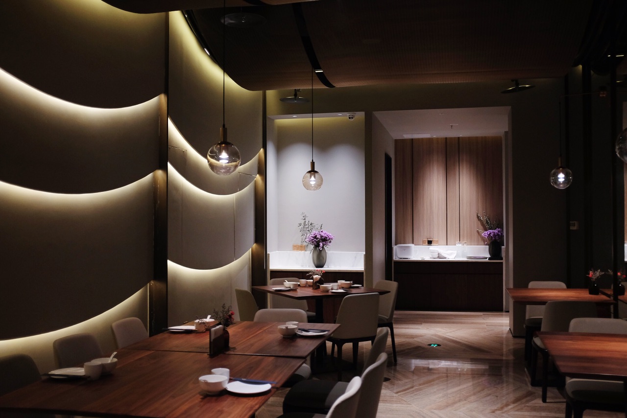 今年新开的美岁城,公交车坐到金融中心站下车就能看到,边上依次是朗豪酒店和万达。大致是因为新开的原因,很多商家还没装修好,虽然是周末,但是商场里还是略显冷清。搭扶梯上三楼很容易就能找到这家店了。出人意料的是,这家店的上座率很高,可以说是基本上满席的状态,和商场形成了有趣的对比。 进门迎宾就会热情的迎上来引领座位并且对餐厅做一个简单的介绍。遇见的每一位服务人员都素质很高,彬彬有礼。 整体装修风格高雅,简约,走的暗色调。很舒服。 做的是精致创意粤菜,所以菜品也是出人意料的可人。 首先端上来的红酒鹅肝佐干提薄荷酱就让人眼前一亮,拔丝的麦芽糖缠绕出一个小圆圈,罩着鹅肝。上面装饰着可食用的蝴蝶糖纸、鹅肝入口微凉,配着薄荷酱,非常特殊的体验。很喜欢。 广式爽口四位,好像这家店很喜欢用薄荷酱哦,薄荷酱配牛肉,吃过得都说好,哪怕是萝卜干和花生米调味也是非常棒了。 港式波龙焗伊面,很喜欢的一道菜,面条很爽滑,慢慢的吸收了焗波龙的汤汁,逐渐变得有味。即使放久了也不会软踏踏的失去口感,我真的是一个人光面条就吃了3碗了吧,波龙的味道就更好了,肉质紧实Q弹,能够感受的到食材的鲜美,强烈推荐这道菜。 黑猪肉芒果烧,非常有层次感的一道菜,最上层覆盖的是奶香浓郁的芝士,然后芒果,接着是黑猪肉。个人感觉十分有创意。摆盘也是精致美好。 黑蒜螺头炖排骨,黑蒜汤一直很喜欢喝,他们家的不油腻,汤汁清亮确回味无穷,很喜欢。 芝士焗薄荷肋眼皇,非常非常有味道的菜,调味很好,而且芝士与薄荷酱的搭配真的很奇妙啊。 太阳果辣味焖饭,超级可爱的一道菜哦,或者说算是主食呢?可爱的小南瓜挖空,装上焖饭,把甜甜的南瓜挖下来拌着米饭吃,光是这样吃,就已经觉得又有趣又满足了~