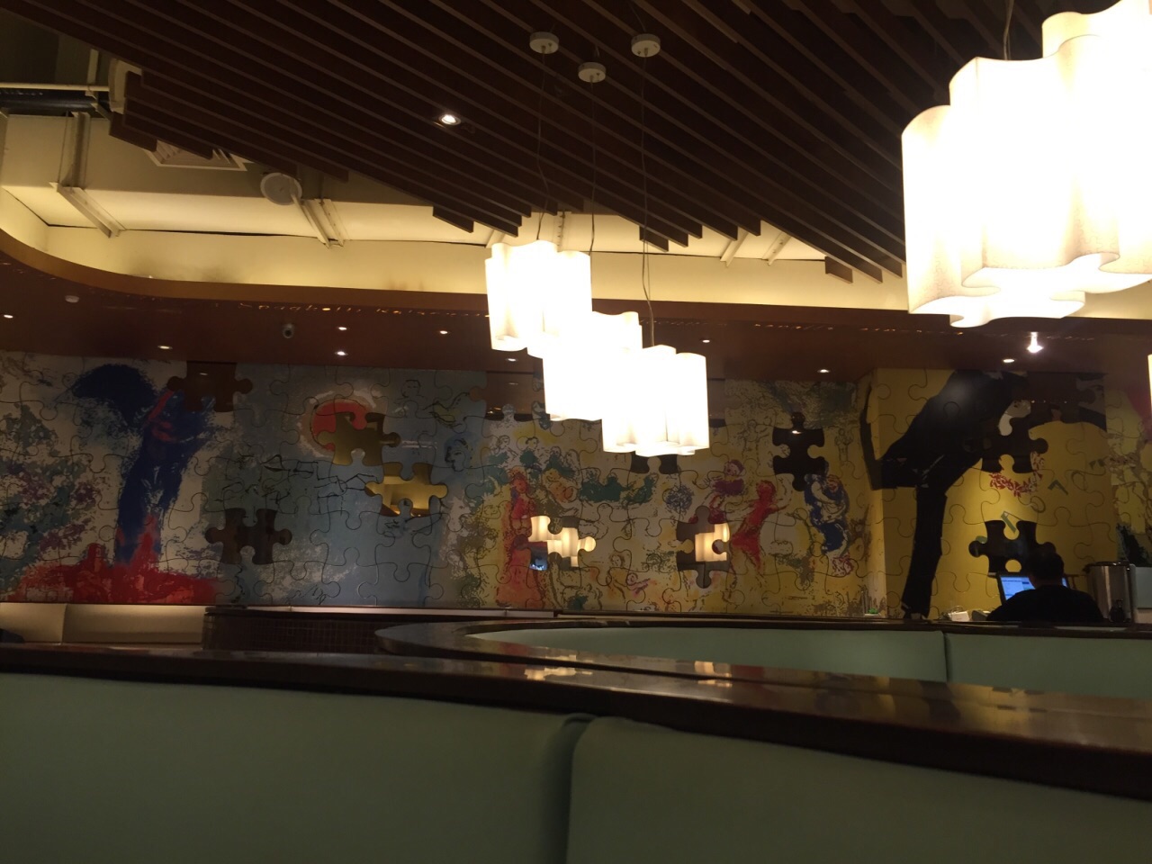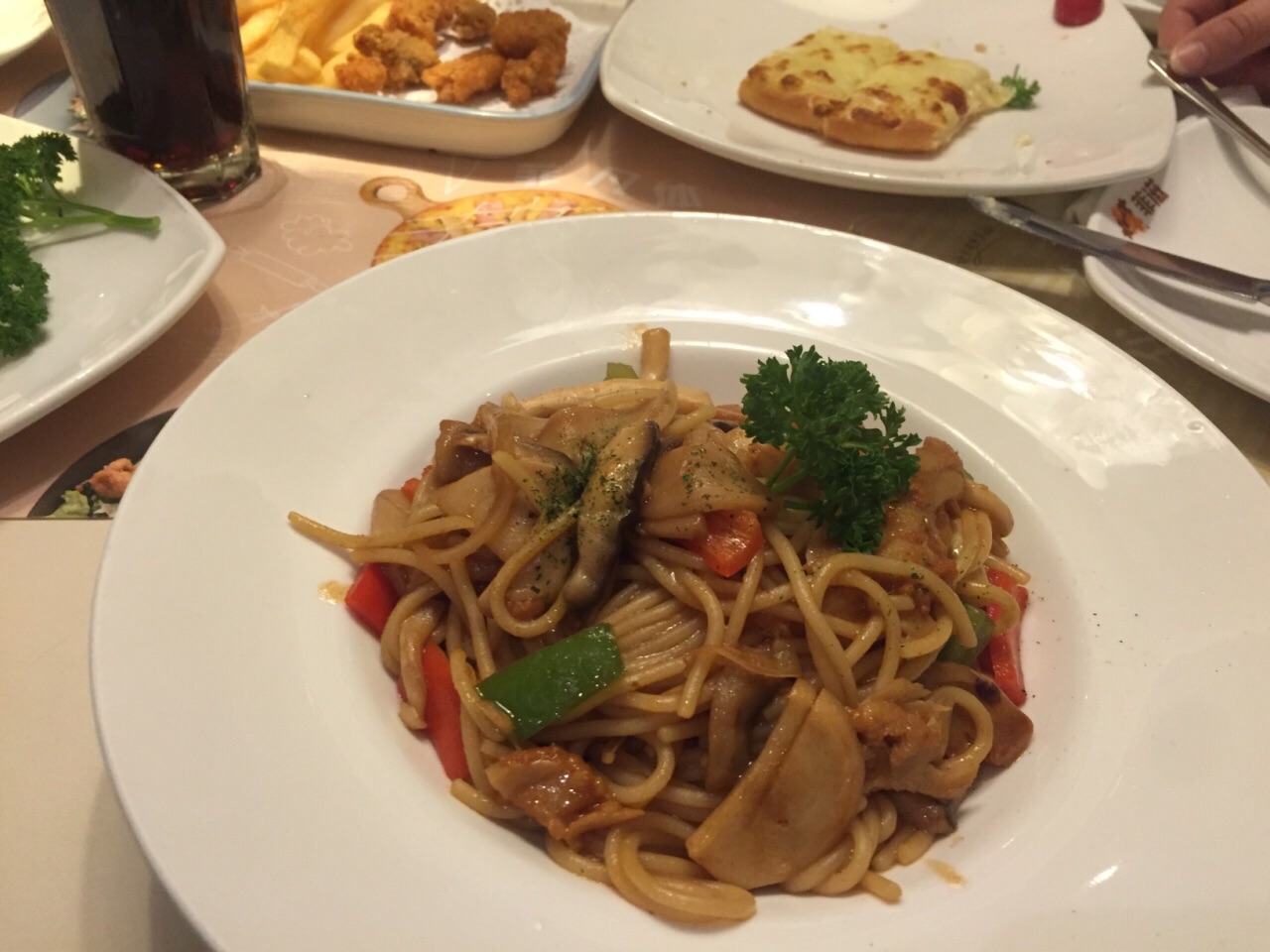 中午跟同事一起过来吃午饭,本来想点菜单上的3人套餐,看着很划算,但是服务员说套餐里的蛋糕没有,也不允许我们换等价的其他产品。只好每人点一份工作日午市套餐,再加了份芝士条和小吃拼盘。我的野菌鸡肉意大利面,微辣,味道还不错。芝士条很好吃,一份不够分,又加了一份。