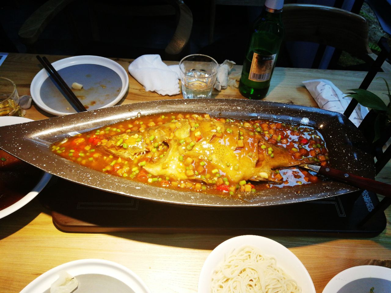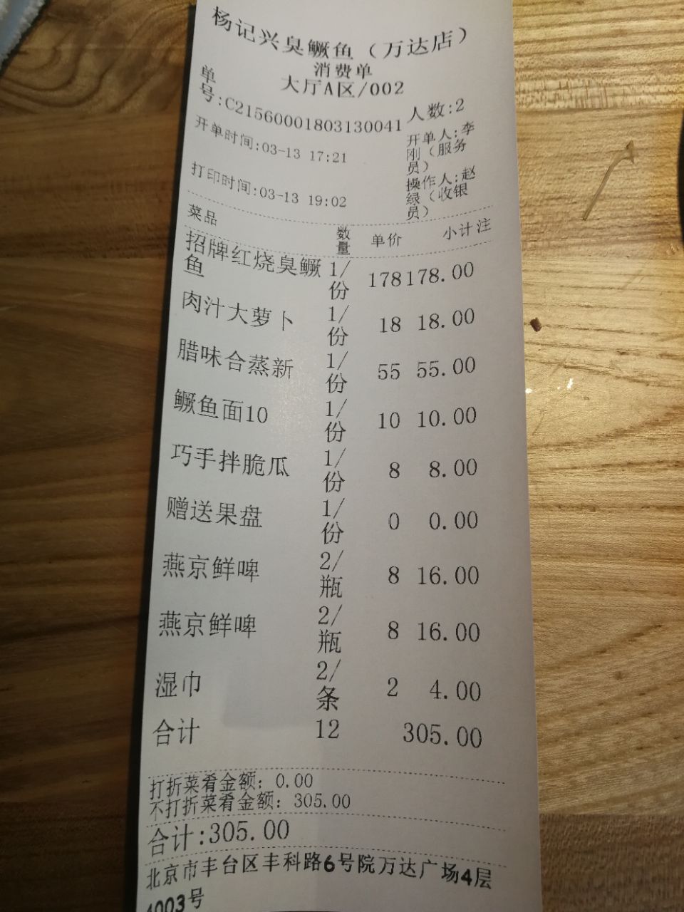 【杨记兴·臭鳜鱼】,我三年前在他家的(北交大店)第一次吃臭鳜鱼,徽菜的经典菜,印象很好。 今天和朋友约好,晚餐来他家(丰台万达广场店)。 【环境】有小桥流水人家的感觉,盆景、纱幔隔离带,雅致。桌距合理,就餐环境没有丝毫的嘈杂感。 【服务】刚刚坐下,服务员就送上准备好的菊花茶水,就餐过程中服务热情、细致,餐后主动询问就餐感受、征求意见,遗憾的是,没有奖品 【招牌红烧臭鳜鱼】178元/份,带一份鳜鱼面,(三年前好像没有面),鱼盘下方有酒精炉加热,保证了就餐过程中菜品的热度。这“招牌鳜鱼”气味馥郁,难言有臭味,但吃起来确实鲜香,蒜瓣状肉质鲜嫩紧致、醇滑爽口。拌面口感爽滑筋道,蘸有鱼汤之后,口味鲜香四溢,一碗不够,再加一碗。[不足]酒精炉持续加热,寖泡在鱼汤里臭鳜鱼的另一侧,等翻过来吃时,咸,口味明显加重,有点齁。 【腊味合蒸】55元/份,菜量少。我以为通过蒸制,提温,增加腊味咸香,但眼前的这盘腊味合蒸火候大,口感软,嚼劲、咸香味明显不足。这道菜,质量与性价比,差评。 【免费凉菜】大堂有免费凉菜自选区,泡菜、海带丝、芹菜段、糖蒜四样凉菜自取。个人感觉,没必要再点“拌脆瓜”之类凉拌菜。 【评价】环境:五星; 服务:四星; 菜品:口味咸、价格贵,性价比差。 与我三年前在(北交大店)消费体验,差距很大呀。