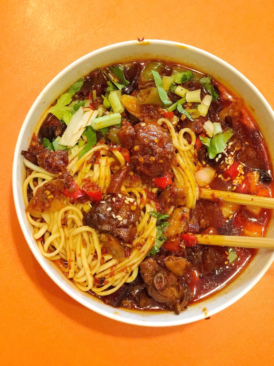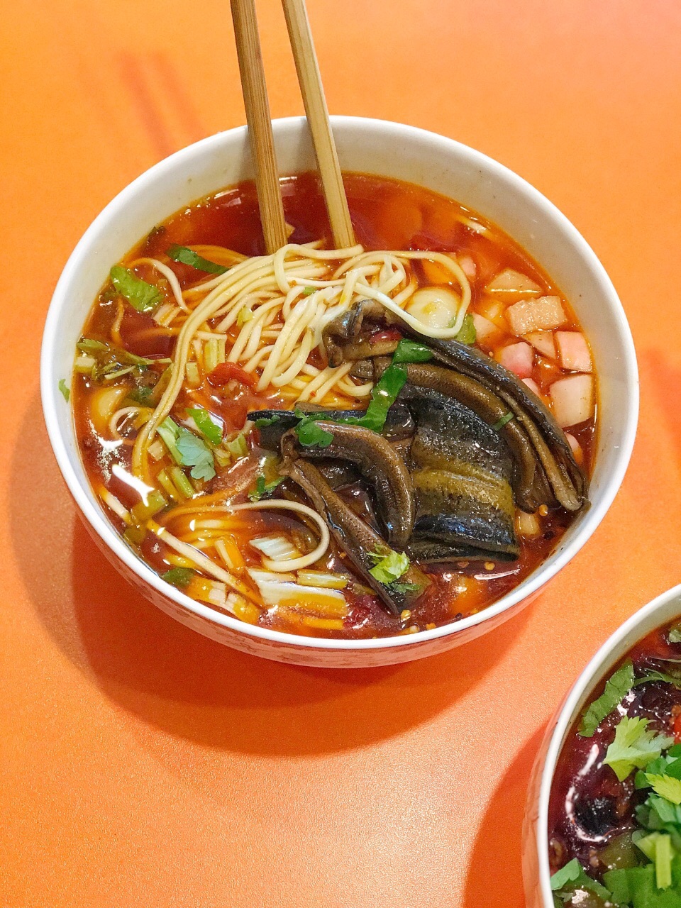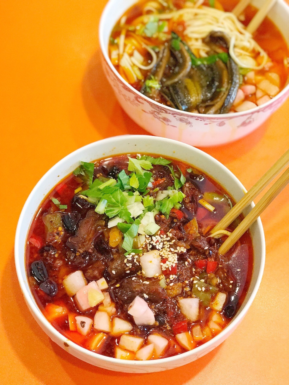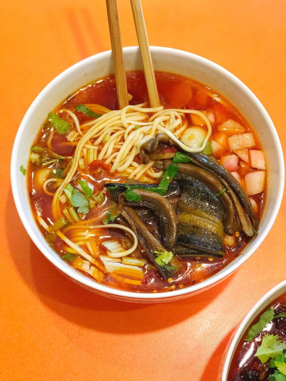 总评: 很多人给我说,他们家只是贵,味道不怎样,生意还好。 哈哈!好奇心嘛。所以我还是去了。 咦~~!怎么我觉得还不错呢。鳝鱼面我只尝了两口,觉得清淡了。 多椒兔子面。哇!好辣好爽好过瘾哦!吃完整个人都热腾了。爽! 价格贵,这点,我觉得还好吧。毕竟那么大碗,况且绍子还是足。 难得一碗面吃得我这么畅快!我表示满意! 评分:82分 性价比:❤❤❤ 每一个人的口味都是有差异的,所以啊,即便是那么多人说他们店味道不怎样,但是价格贵,不会再去第二趟。 但是人家店里生意还是不错啊,饭点的时候,桌无缺席。 那么,个人口味,个人评价,仅供参考哦! 【多椒兔子面】28元 一上桌,那种复合型的辛辣香味扑面而来,各种辣椒混合融入这一碗兔子面之中。 兔肉煸得干香入味,麻麻辣辣,是还没什么骨头的尽肉哦。 面汤基本上是红油,所以啊油比较汪实,辣刺激了味蕾,反而 不会觉得油腻。 第一次吃面吃得我额头微微冒汗的,这寒冬腊月吃得我全身都暖了。 现在想来都不禁吞了下口水。 【鳝鱼面】42元 相对于兔子面的调味这个太温和了,微微一点点的丝丝泡椒酸辣而已。 店里的面条用得不太好,虽然是小亚喜欢的粗面,但是口感不是带着嚼劲,而是导哥说的脆硬。只能说不软耙而已。 鳝段还是不算少,我觉得够吃了,或许相对来说价格是偏高了一点点。 调味比较妙的地方是加了很多的泡萝卜,一点点的酸爽很开胃,可惜还是不足以让我吃完这么一大碗的面条。 建议啊,整个小碗嘛。任何东西多了都是负担,要少少的留一些念想,才是最美好的。 有说店老板很傲骄,态度不是很好,但是我这次是一位男服务员接待的,我觉得没什么问题哈,正常范畴内。