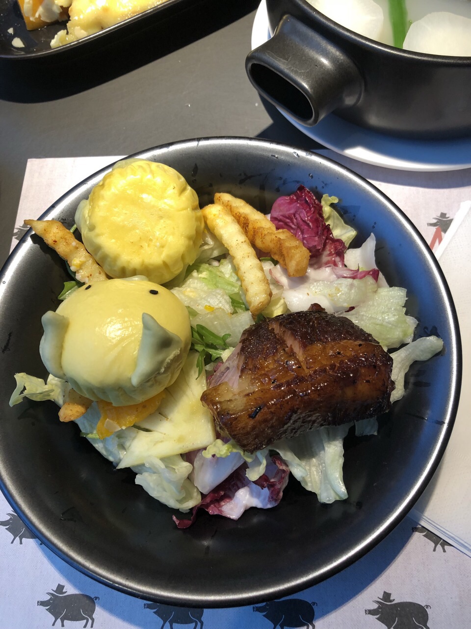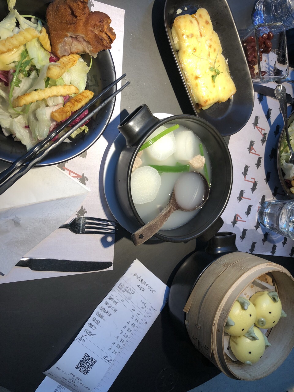 菜都好吃,招牌红烧肉肥肉入口即化,焗南瓜南瓜甜甜汁咸咸,猪肺萝卜汤猪肺嫩嫩萝卜有嚼劲,松茸猪包有点咸咸,烤肋骨不是最喜欢有点干干的,口感不丰满。另外红烧肉配的馒头上太慢,上来我红烧肉早干掉了。11点开席,11:46左右外面就要排队了,生意不错,上菜快,服务好,一直看需不需要撤盘。有情调的可以喝茶或者红酒,然后带香肠回去。