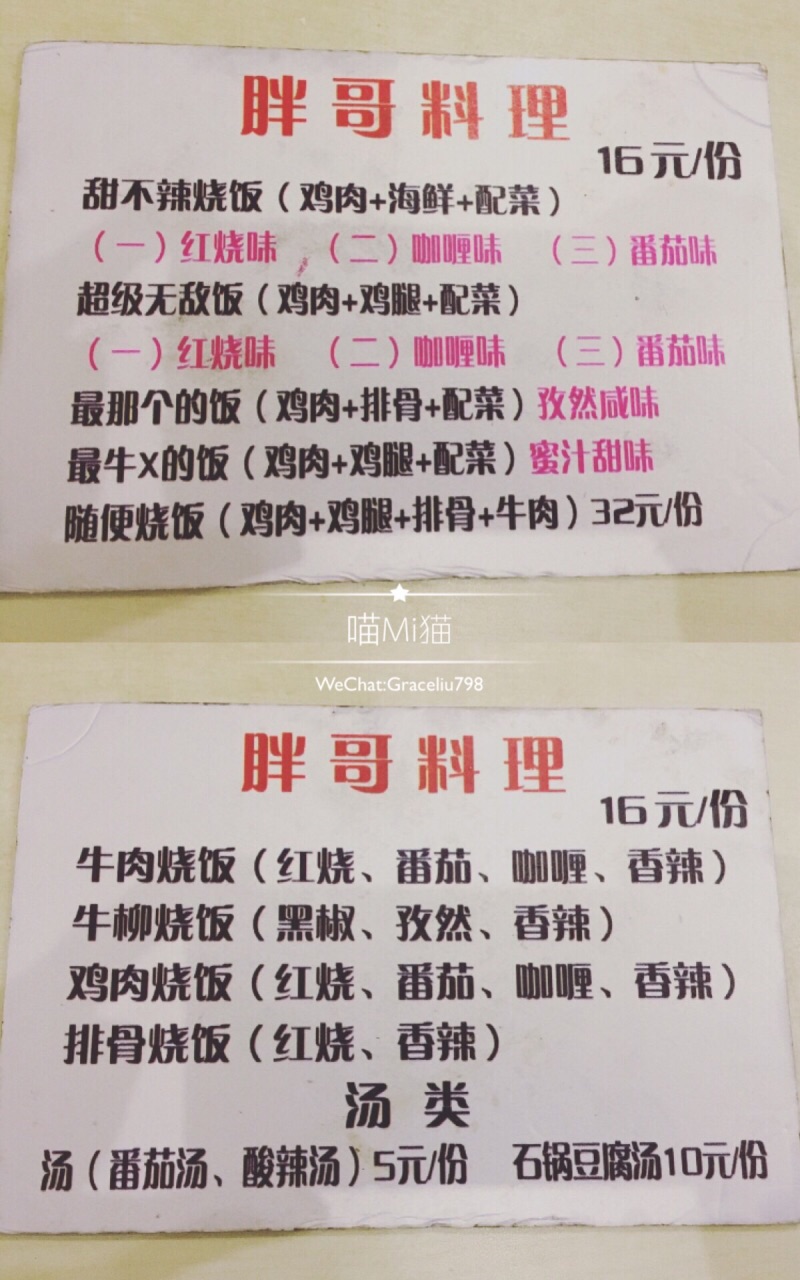 胖哥料理 兆丰路5号 近乐宾百货 一家藏在巷子里的小饭馆 主打:盖浇饭 生活在和平区的人应该都知道 从上学一直到现在 后来迁址至此 那时候胖哥还年轻 盖饭5块钱一份 同学们都爱来这吃 量大味道好 关键胖哥还给每种饭都起了个有意思的名字 比如: 【最牛叉的饭】 16 蜜汁甜味的盖饭 里面有鸡肉 配菜 还有一个鸡腿 这也是我经常吃的一种盖饭了 【最那个的饭】 16 孜然咸味的盖饭 里面有鸡肉 排骨和配菜 也是我喜欢吃的一种 甜味咸味各有各的特色 几乎每种都是16元 还有牛肉 牛柳 鸡肉 排骨 烧饭 可以做成红烧 番茄 咖喱 香辣 黑椒等口味 当然你也可以告诉胖哥喜欢什么样的 让他作出只属于你的盖浇饭 还有汤和饮料 冬天喜欢喝汤 夏天来瓶汽水 完美 环境来说 胖哥追求纯天然 完美没有重新装修 坐落在一幢小房子的二楼 门口有醒目的招牌 虽然在小巷子里 还是比较好找的