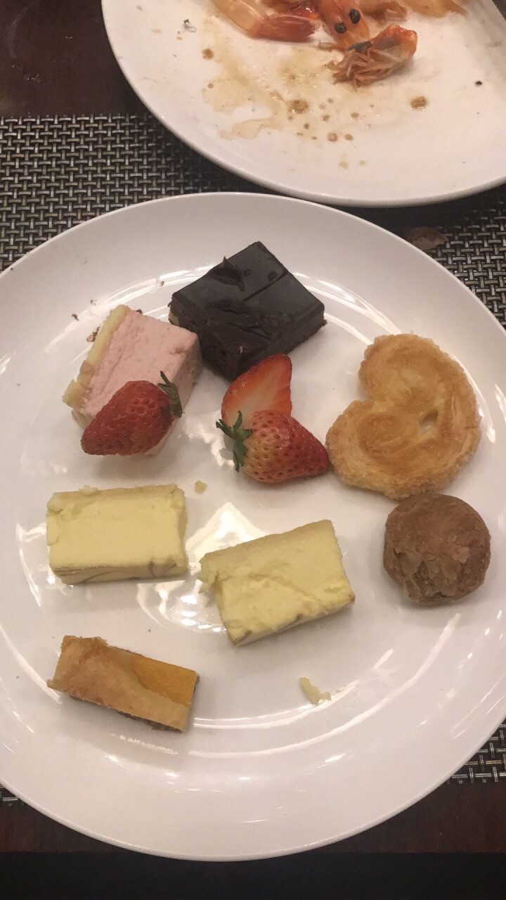 海鲜有虾,贝类,还有烤肉串之类的,三文鱼刺身比较好,因为人不太多,吃起来不着急,蛋糕不错在酒店大堂后面,直对着门口,有点冷。菜品不是很多,菜就是几种。海鲜有虾,贝类,还有烤肉串之类的,三文鱼刺身比较好,因为人不太多,吃起来不着急,蛋糕不错!