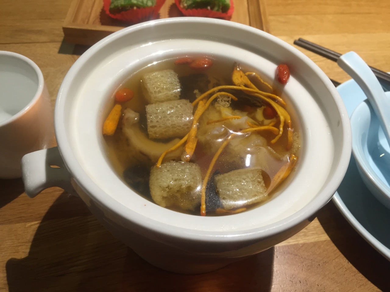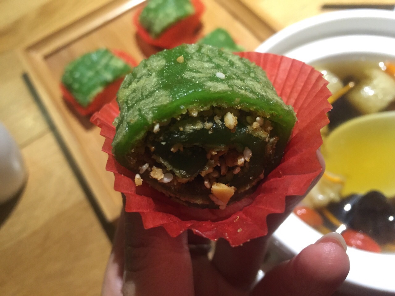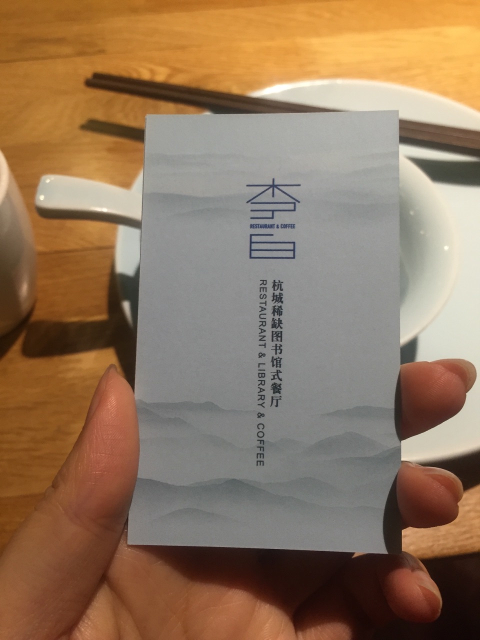大众点评年会发的50元代金券还有10来天就要到期了,抓紧时间过来用。 李白餐厅一楼类似于书吧,满满的书架上都是图书,有沙发座供客户一边看书,一边喝咖啡吃蛋糕。走环形楼梯上二楼餐厅,代金券只能在二楼使用。 晚餐时间,店里生意很好,可能是我一个人过来的,服务员不大在意,每人招呼我,自己找座位,跟服务员要菜单,给了我一张餐厅的名片,扫背面的二维码点菜。 点了一碗云南野菌汤,下面放了蜡烛加热,热乎乎的野菌汤很鲜美,里面有好几种菌菇。 本来还点了2个红糖菠菜麻糍,2个葱包烩,提交菜单后,服务员过来说点心只能4个起点,那只能舍弃葱包烩,选择推荐的红糖菠菜麻糍了。 绿色的麻糍第一次吃到,里面放了红糖,花生碎和芝麻等,很香很软糯,缺点是端上来的时候,麻糍就不热,可能是早就做好了端出来的。