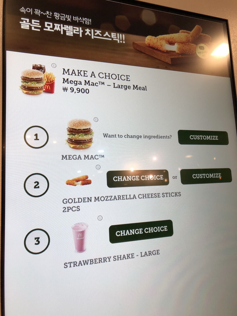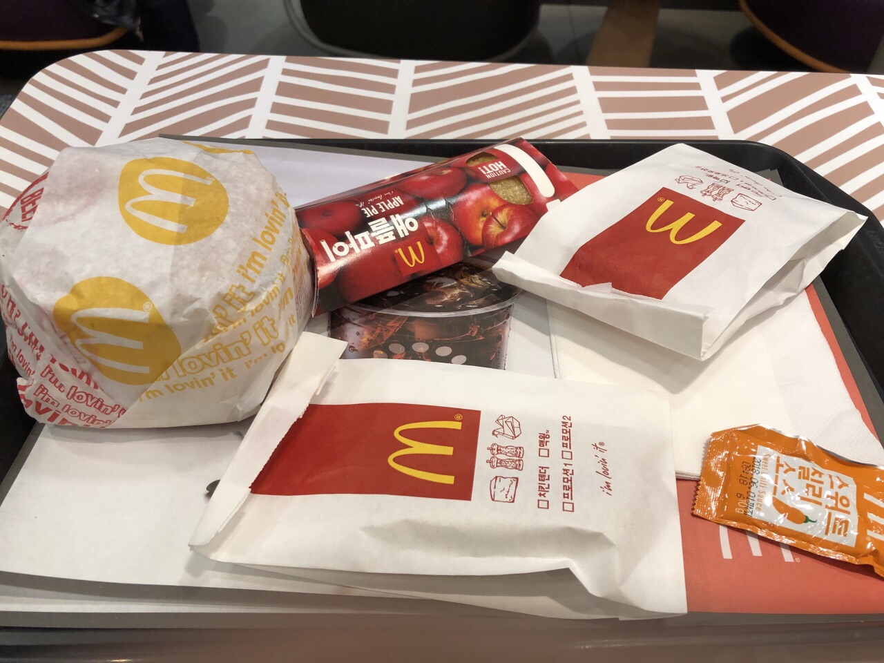 在济州的第五天下起了雨,外面温度挺低的,为了解决晚饭我们就到离酒店不远的麦当劳,这家店楼上楼下共两层。我们先在自助点餐机器上看了一下要吃的东西,用手机拍下告诉服务员,(自助点餐要用当地银行卡支付),老公点了一份巨无霸套餐(将可乐换成草莓奶昔)芝士炸鸡条、一对鸡翅和一个苹果派,一共13600韩币。跟我们帝都比起来价格不便宜啊,呵呵呵呵!不过话说回来济州麦当劳的味道真是挺不错的,奶昔现在帝都已经没有了,他这里的草莓味道浓浓的,芝士鸡条也是软软糯糯的,真怕回去再吃帝都的麦当劳不适应了。如果这里服务员会说中文就更完美了。