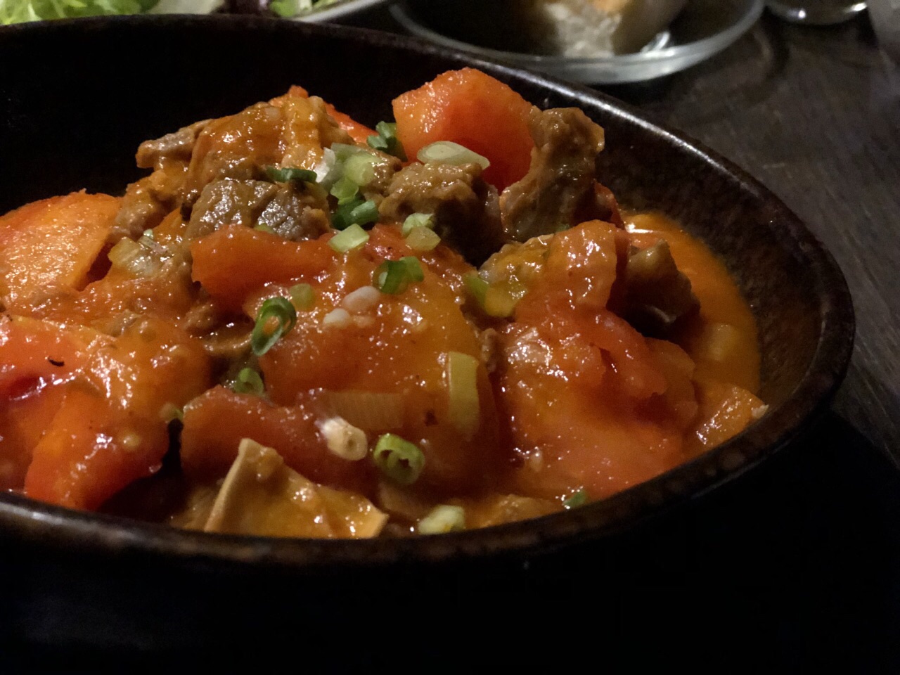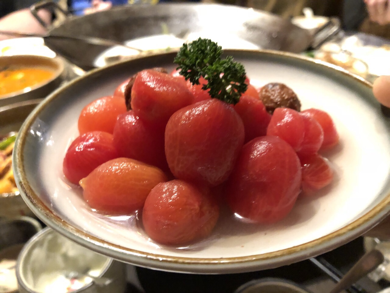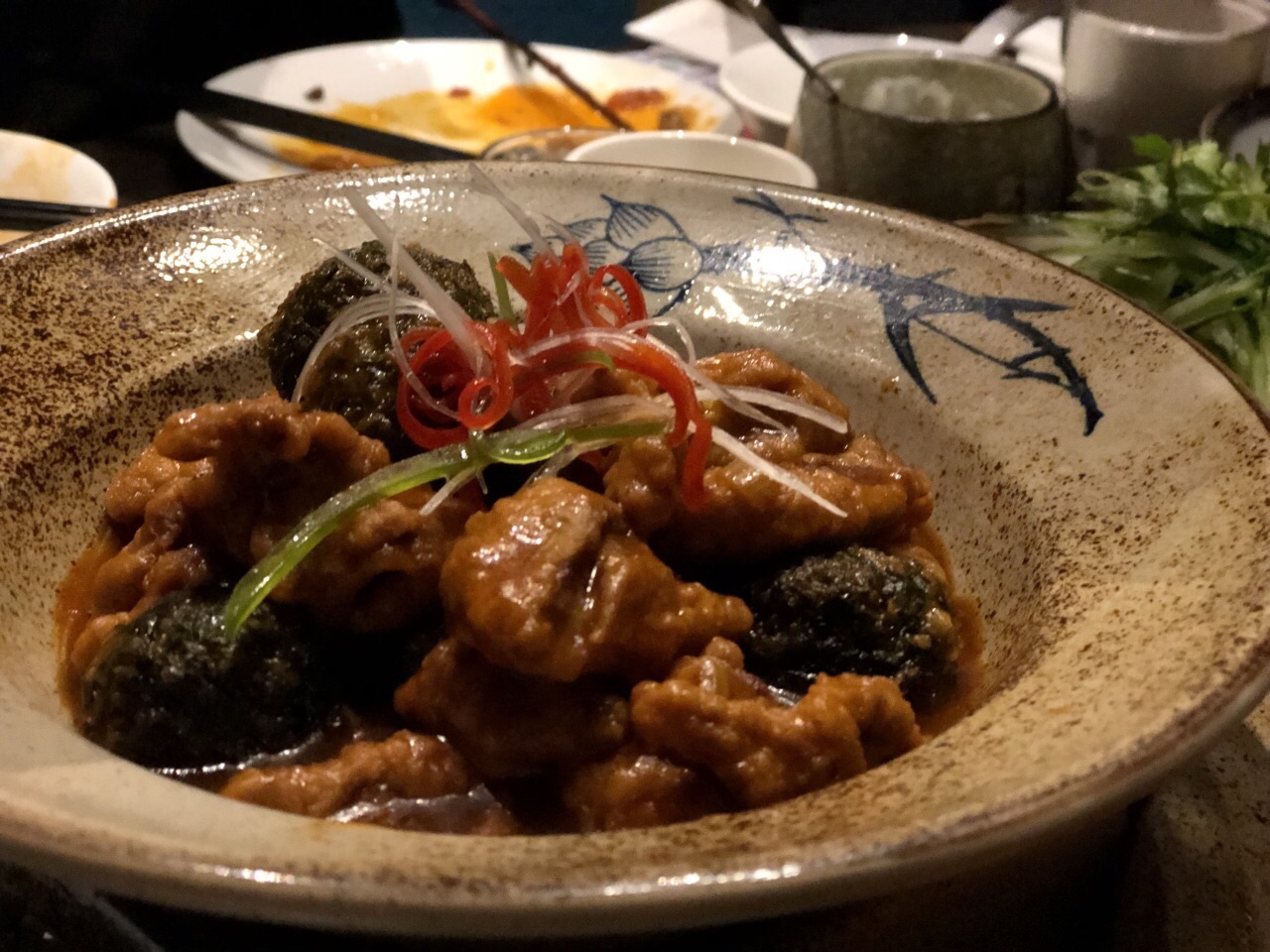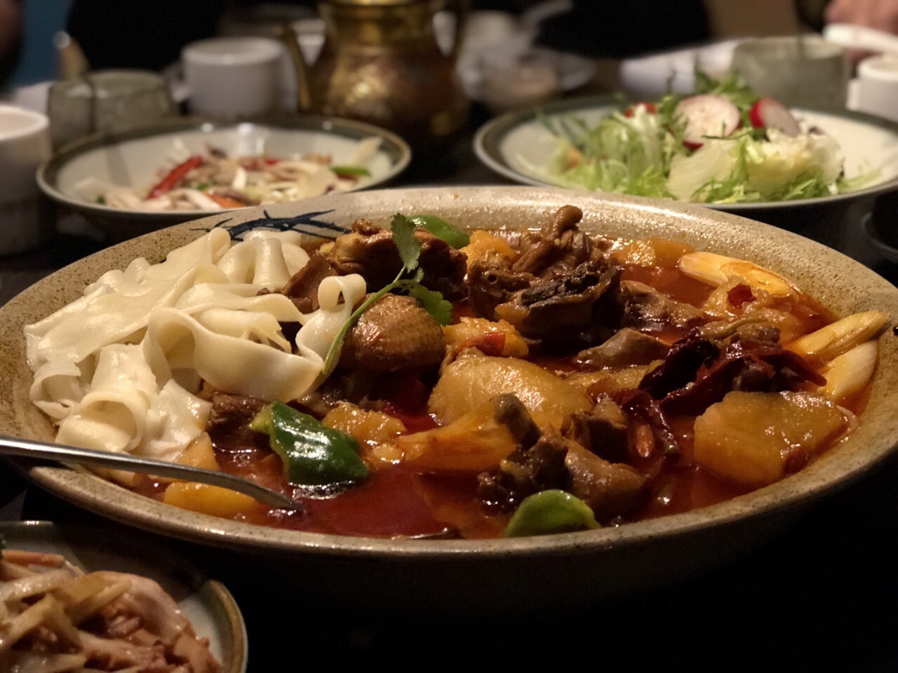 家门口带朋友来吃饭~南丰城5楼,电梯直达,选了小包厢 自从上次吃过乌梅小番茄之后,对这个菜念念难忘,朋友吃了也赞不绝口,番茄去皮,乌梅酸甜的味道渗透其中,开胃降温解腻~~ 主菜还是大盘鸡,辣酥酥的,面皮在里面劲道虽然欠缺了一点,但是味道还是很不错的,建议配白米饭~~ 还点了一个蓝天白云手抓肉,这次是第一次吃这个菜,白汤特别好喝~~羊肉都是酥烂~不膻,羊肉的位置都很好,基本属于羊排了~~推荐~适合人多一起吃~~ 这次没有选羊肉串,而是选了红柳,又粗又香,吃起来很爽~~一人一串足以~~因为还有其他菜要品鉴~~哈哈~ 这次还尝试了 库尔勒香梨炖鱼,超级好吃哈~~虽然分量不大~梨脆的像苹果,但是比较细腻,鱼肉直接吃,口味类似古老肉那种酸甜口感~ 野菜丸子酥肉煲,黑色的是野菜丸子,类似荠菜,有创意,已经超出我对新疆菜的认知啦~~ 番茄炖牛腩 ,牛肉味儿正,适合陪米饭,带宝宝的家长们不要错过这道菜~~ 自制酸奶在饭后如果还能吃的下的话来一份,也是蛮不错的~~