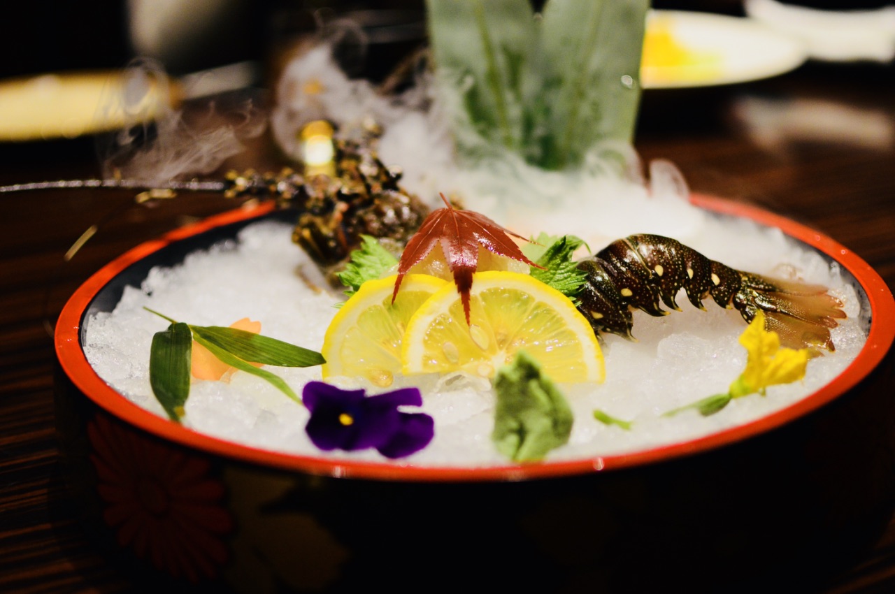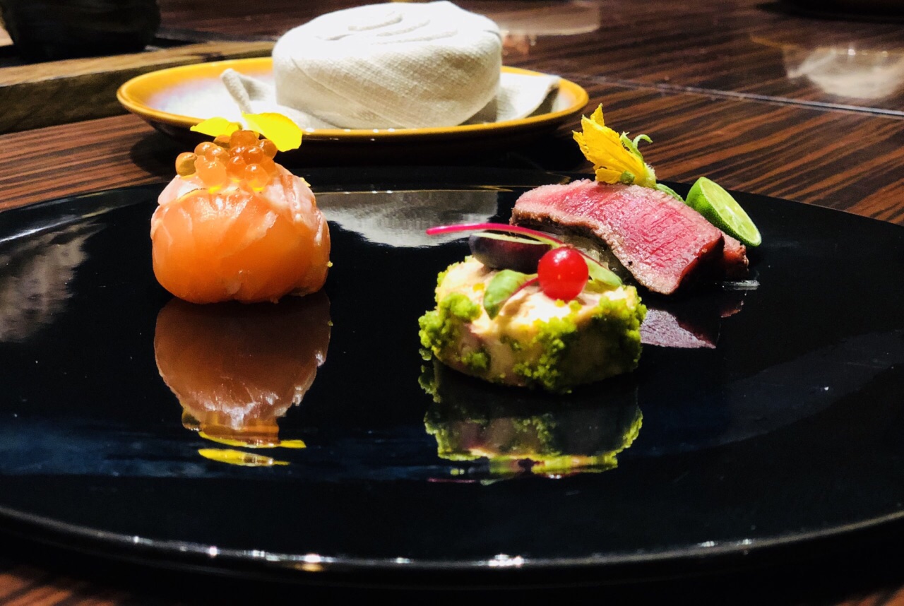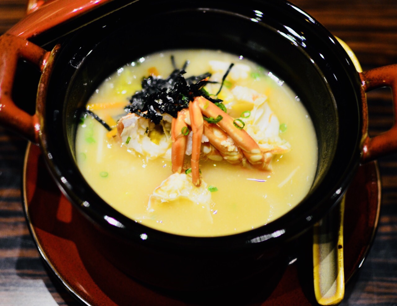 酒店内的锦·日本料理听说刚重装焕新,对于一个喜欢吃日料的人来说要来试试口味。名字也蛮讨喜的,锦鲤寓意美好如意,讨个好口彩。进门就发现玄关很特别,摸了一把,是实木百叶,层叠后很有感觉,实木元素在此运用的很多,给人以线条明朗、扎实之美。空间格局清晰,有下沉式日式榻榻米包房、也有西式的大包房还有铁板烧区域、4人卡座、酒吧区域等,选择用餐区域更为多样化,挺好,个人最爱日式tatami,和风味浓。另外这里的灯光设计很别致,一看就是特别设计过的,背景墙有花纹图腾和餐厅logo交相辉映。主要呈现的是精选的会席料理还有互动性很强的铁板烧,懒得用脑就选了会席料理,套餐形式,也可以根据需求ala carte。整一套 籣·会席料理品尝下来,搭配很有感觉三弦BGM,点个赞。CHEF精选前菜,根据当季食材来,有炙烤三文鱼球星寿司,造型可爱,上面还满是爆浆的三文鱼籽;澳洲菲力香薰牛排,很有嚼劲,点睛之笔是搭配的柠檬醋洋葱,开胃;西京酱法国鹅肝配开心果,开心果碾成碎包裹在鹅肝的外面,酱是日式特色,法式的鹅肝被日式厨师调理一番后呈现不同的感觉,当然鹅肝是同样的绵密。 清口的色拉特别爽口,是牛油果鲜橙什锦蔬菜色拉,鲜橙水分多很甜润。刺身可以选,跟小伙伴可以分享两种不同的选择,盘形很美,鲜活的青龙虾,350g左右的量,龙虾肉很晶莹,吃口鲜弹,头部后来还做了一碗龙虾泡饭,不能更赞。特选刺身拼盘,牡丹虾、鳌虾、金枪鱼、海胆、北极贝、三文鱼,这几个品种都是我的心水,从金枪鱼的部位来看感觉挺不错的。 松茸菌菇海鲜土瓶蒸,吃完生冷的刺身后来一碗汤暖暖胃。器皿很漂亮,挤点柠檬汁喝了好几碗,过瘾,鲜得自然还有松茸浓郁的菌香。 铁板烧姜汁鲜鲍鱼,鲍鱼切了花刀让味道跟渗入,姜味很温和,鲜鲍吃得出的弹牙。 铁板烧雪花肉眼牛肉配松茸酱,M7澳洲上等肉眼牛排,等级颇高,吃起来多汁,还切分成小块,一口一个满足,松茸酱是CHEF特调的,用牛排蘸一下更添香味。龙虾什锦泡饭,我很喜欢吃汤汤水水的泡饭,食材就是前面刺身剩下的虾头,由此汤都呈橙黄色,一碗下肚眉毛差点掉光,鲜!甜品和时令水果作为收尾也是完美,有抹茶布丁,抹茶中带点苦涩,吃上去又绵密无比,可以加点苞米,一起吃非常香。蜜瓜很甜,这份套餐开业净价458元还是值得安利一记,服务很温柔也是日式标准。