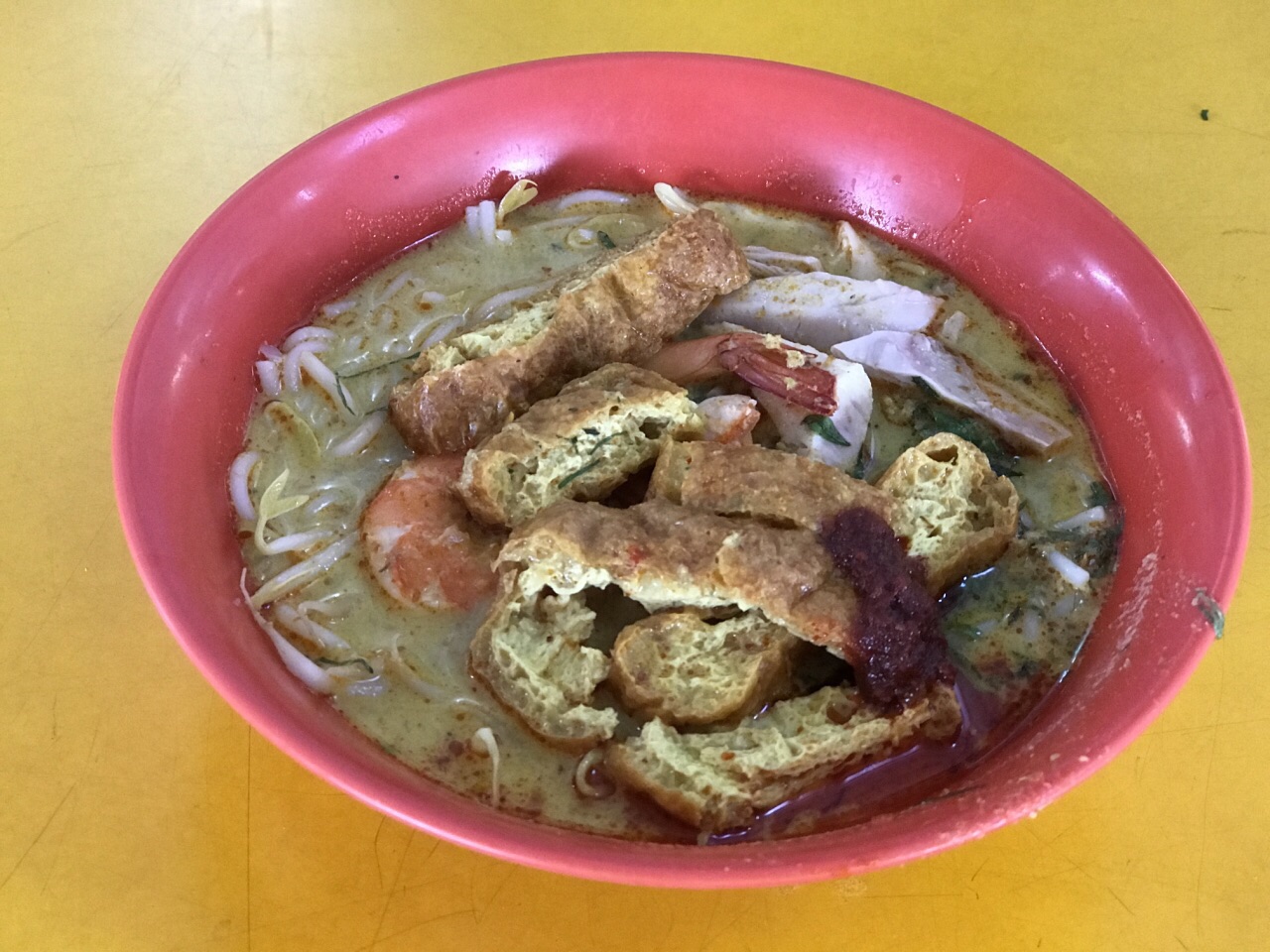 如果周末来这里吃这档的辣沙,必须要有耐心等候。摊位前有长长的队伍,有些顾客还是从很远的北部搭公车来。 这是我第二次光顾。我本人觉得辣沙的汤太薄。不过,新币3元一小碗辣沙,给的配料蛮不错的啦,配料有虾、有鸡肉。豆干吸足了汤汁挺好吃的。
