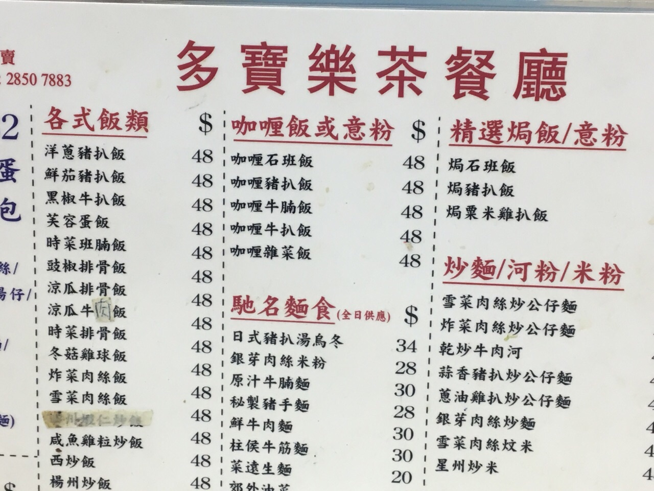 上环的永乐街是香港著名的参茸燕窝一条街,白天的时候就会有不少的婆婆妈妈来这里选购煲汤的原材料。而到了中午的时候,周边的白领午餐时刻,所以多宝乐茶餐厅,到中午的时候一定是排长队的。我都是选择晚上来吃,位置就随便坐,很空。点的是黑椒猪扒饭,有够大块,猪扒的味道不错,酱多汁浓,但是米饭的水准一般般,大米也不是特别好的米。总的来讲平价实惠。