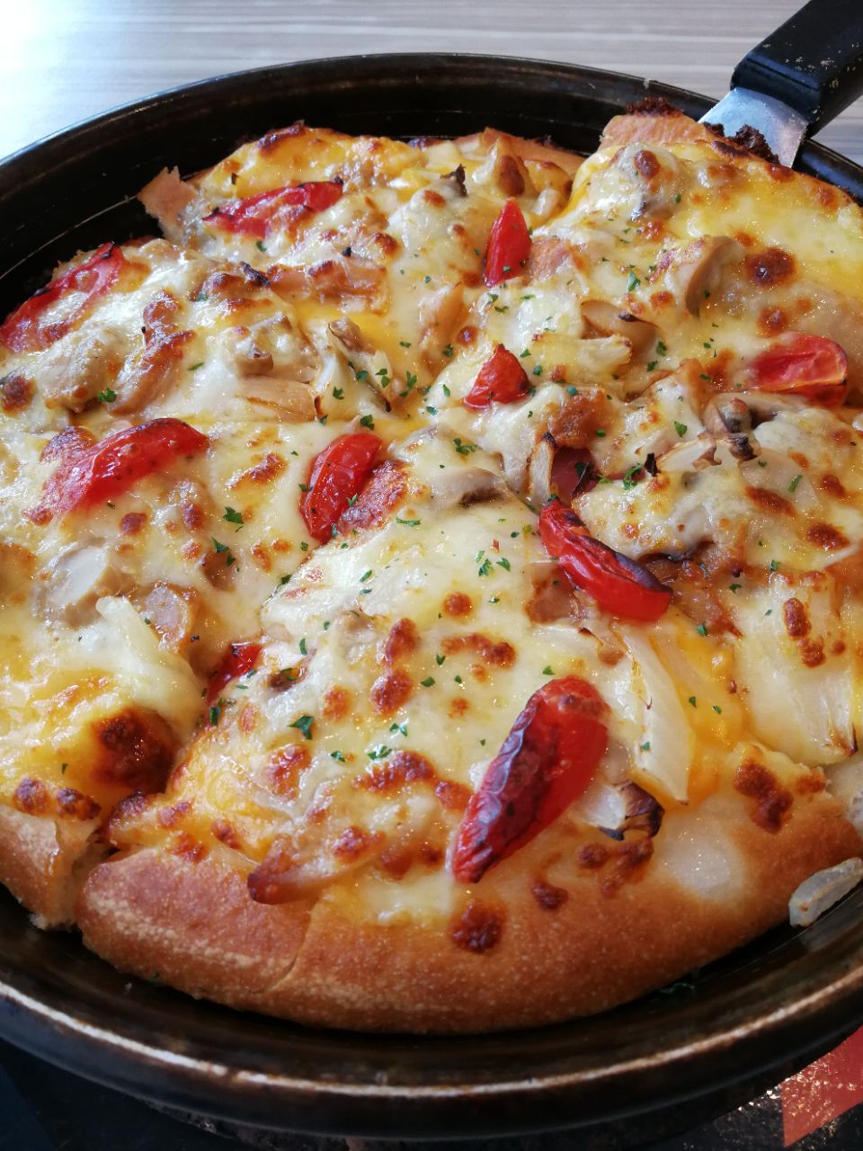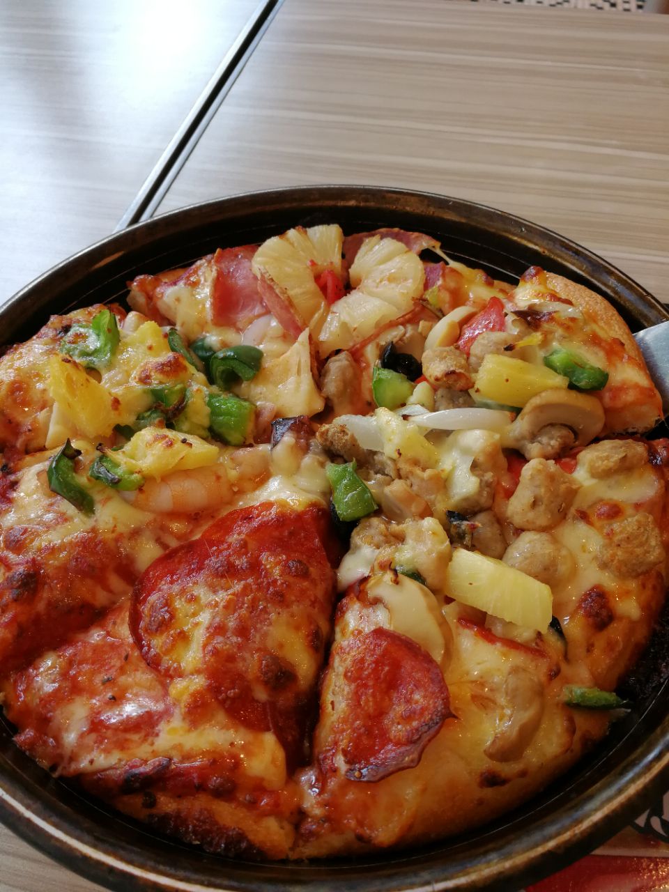 最近它家活动力度还不错,买美式四拼披萨送奥尔良披萨,一次就可以品尝5个味道。芝士添加的很足,明显的拉丝,没有打折。而且饼底很软,我很香。总体来说,奥尔良的好吃,有股特别的香味,美式四拼的味道一般。不过必胜客的披萨一向都挺好吃,比街边小店用料好。