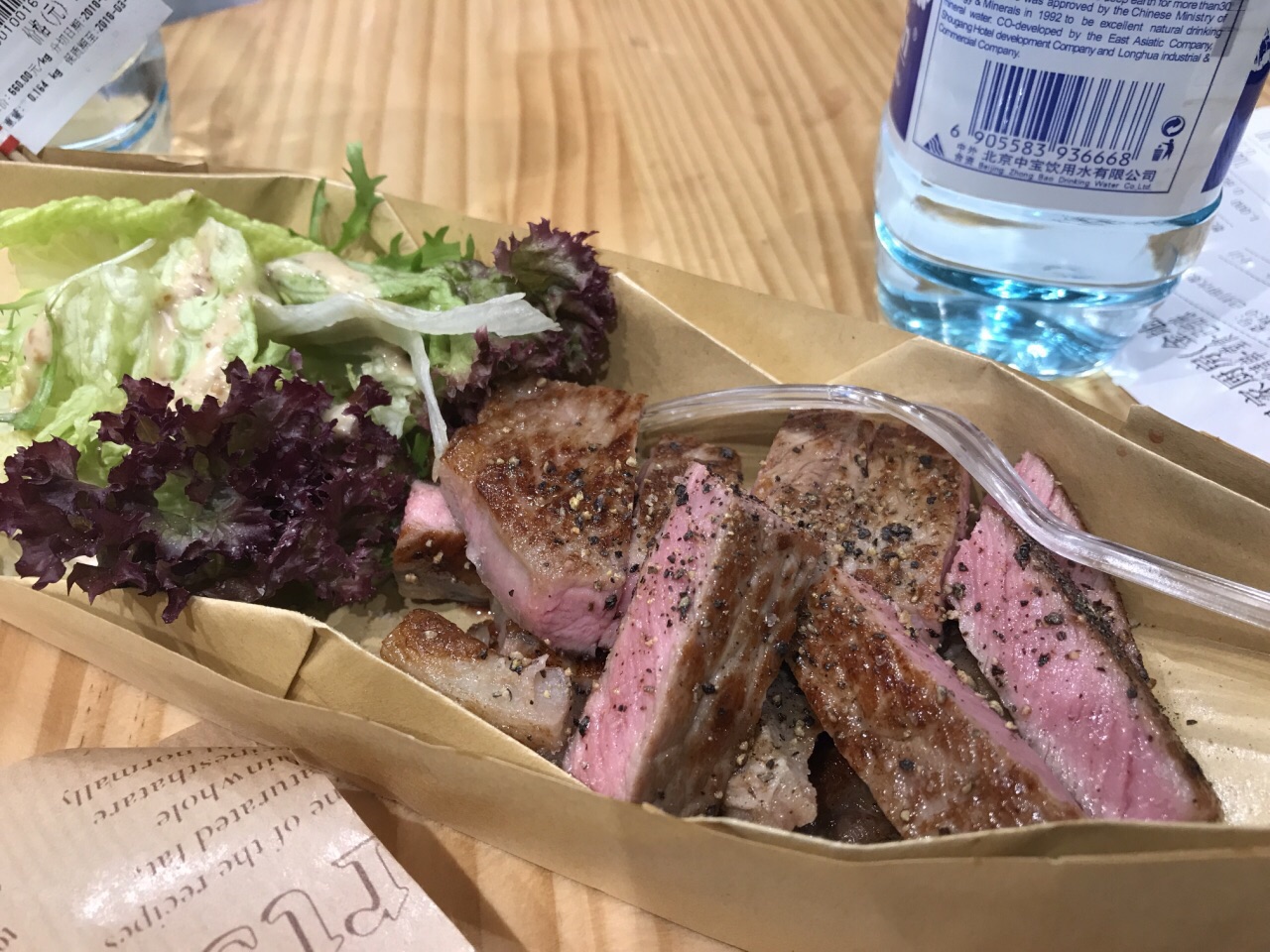 环境挺简餐性质,不过价格不算美丽,作为正餐或者工作餐来说,性价比都不算高。 牛排种类比较多,每块基本200g左右吧,七分熟度口感就比较老了,建议还是三分或五分 牛排配的沙拉和墨西哥卷饼是搭配免费送的,量挺小,一顿下来其实我想说没吃饱,但是已经花了100多大洋。而且就是坐在简单的高脚凳上,配着凉矿泉水。