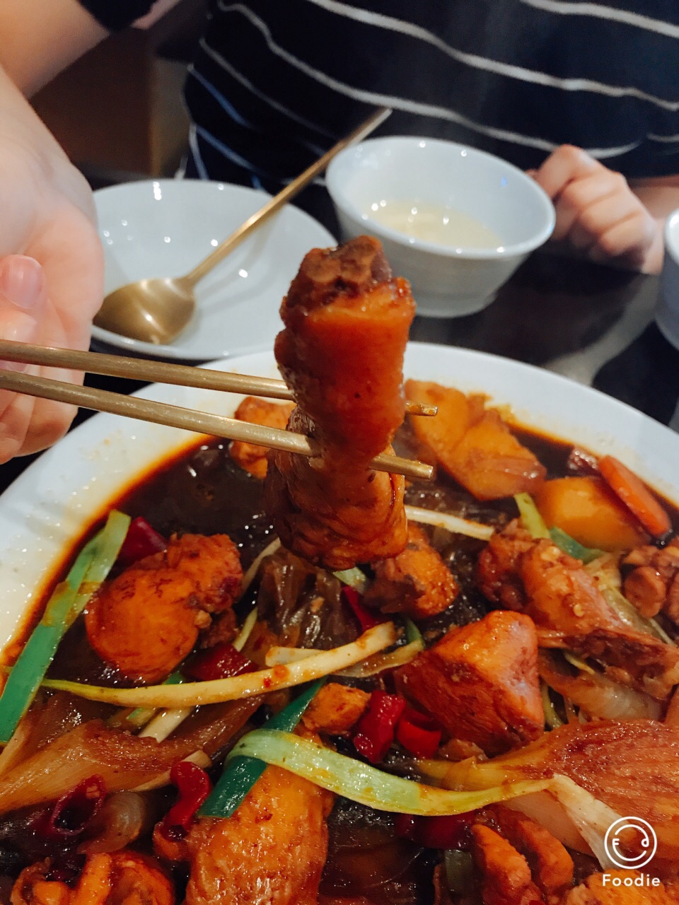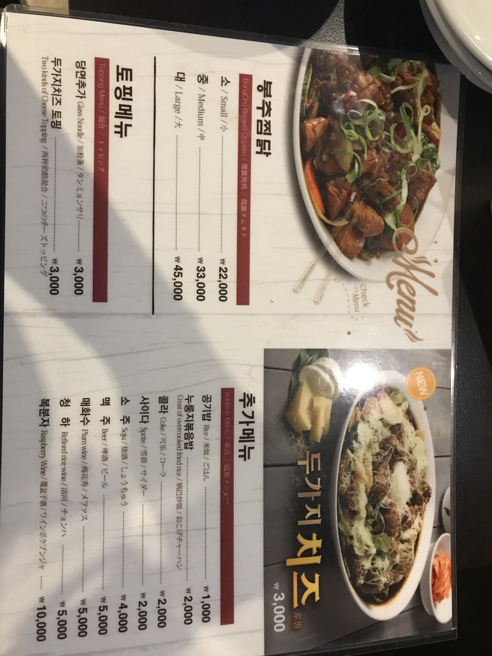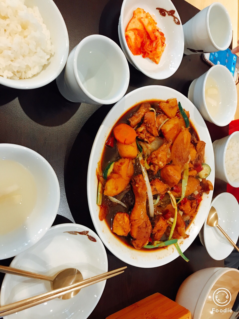 酱鸡作为韩国代表的食物之一 真的是最接近中国人口味的食物了 韩国料理一般都辣中带甜 这个就没啥甜味了 鸡肉炖得很入味~ 里面的配菜都浸透了汤汁 超级下饭 配菜有土豆啊 胡萝卜和粉条 粉条最好吃了 两个人吃一个小份完全够 要是来韩国旅游的话 一定要尝尝