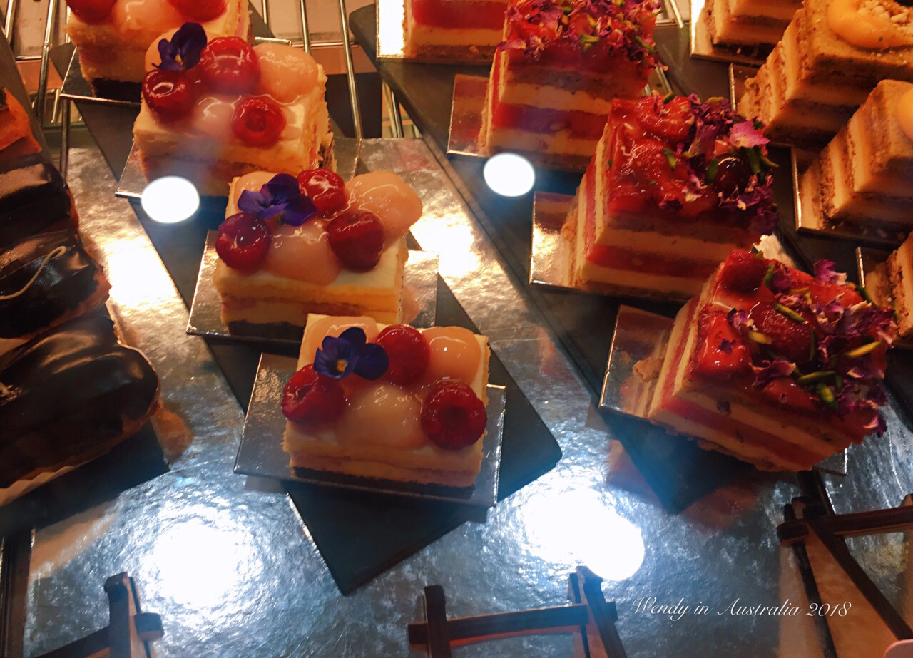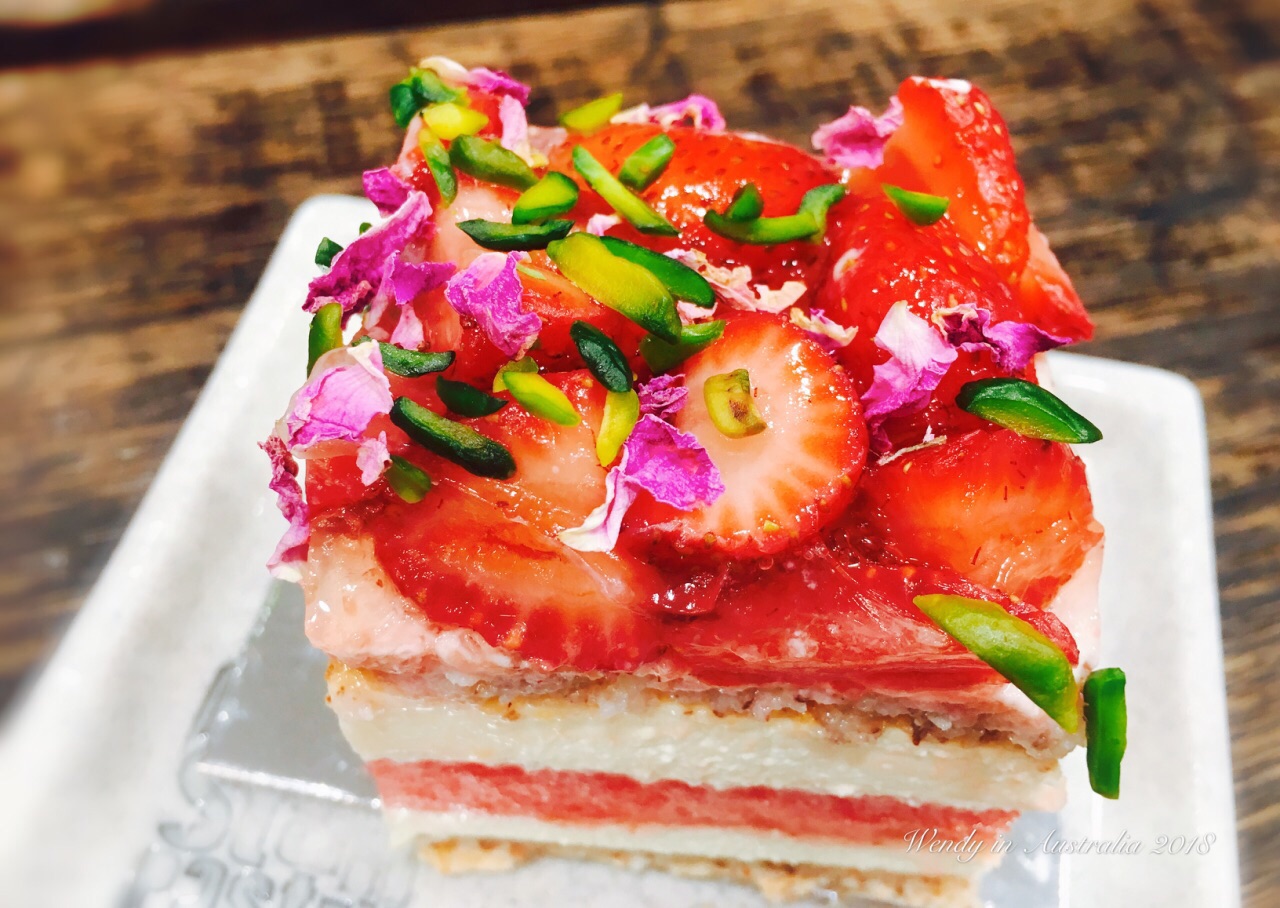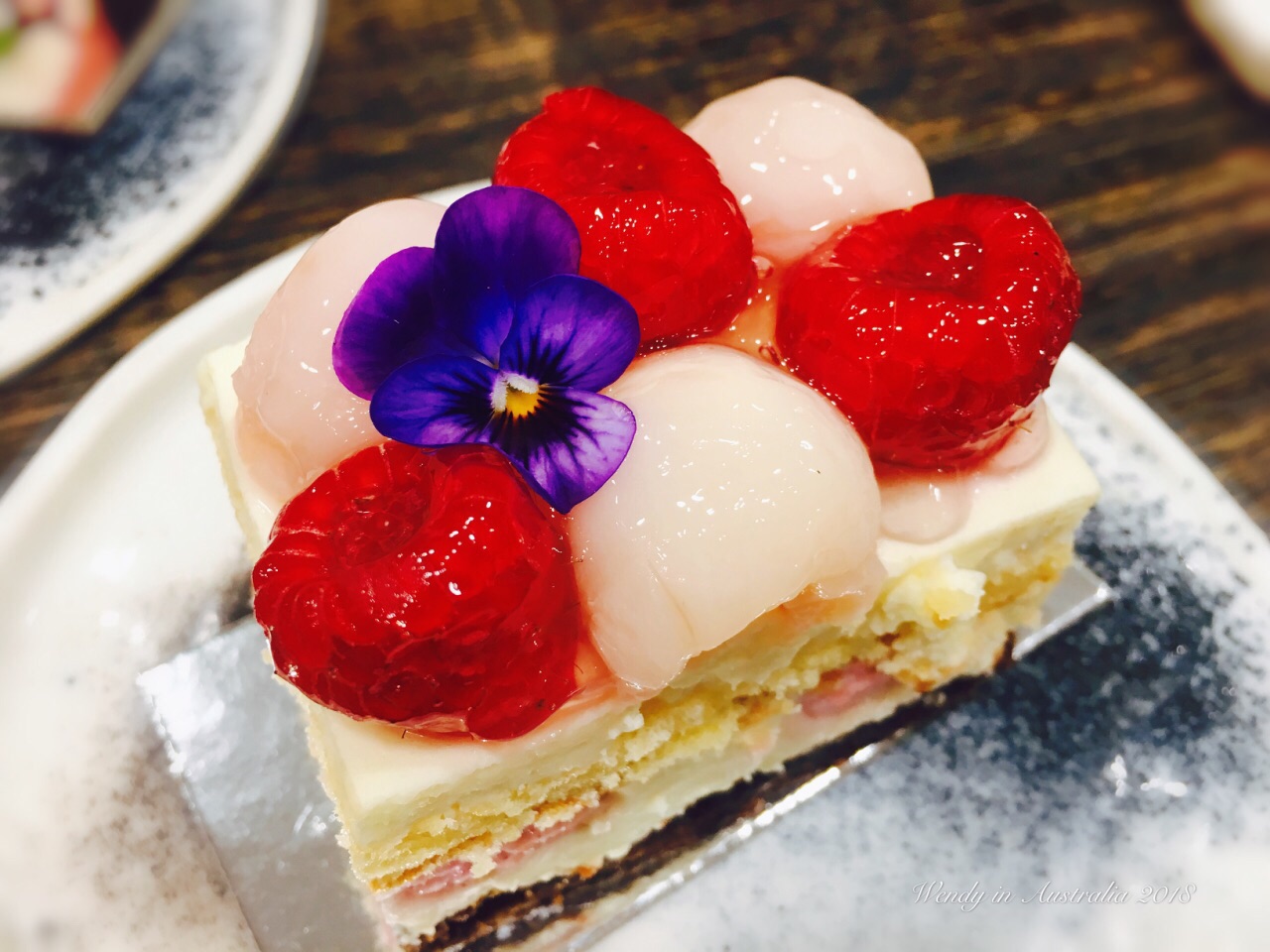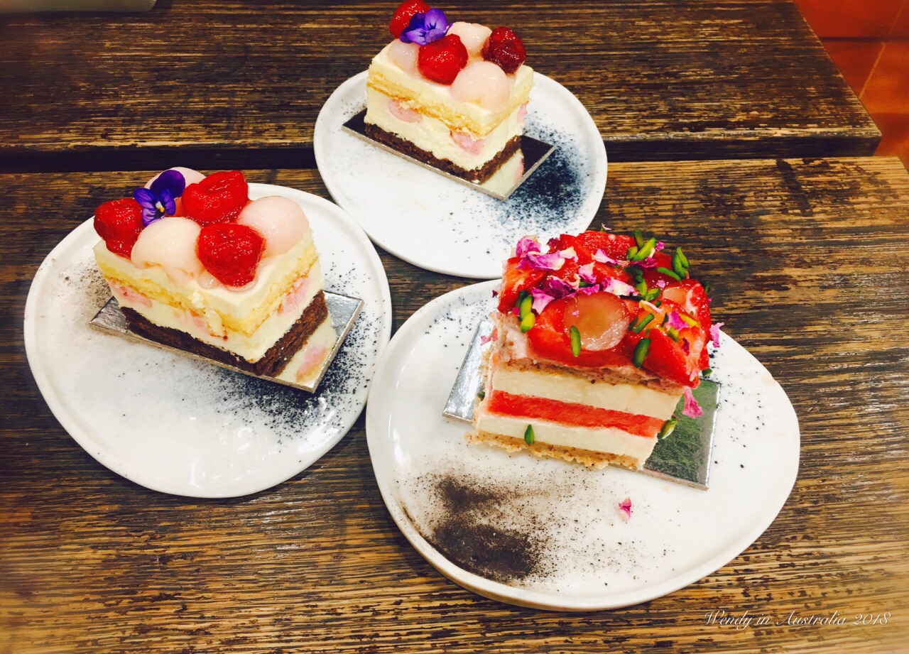 以高颜值的西瓜蛋糕而走红的蛋糕店,在悉尼有好几家分店。西瓜蛋糕其实是西瓜草莓蛋糕,蛋糕表面铺着一层碎草莓和小花,中间有一层整片的西瓜,味道还是很不错,既有奶油的香味,又有水果的爽口,不过味道还有外表惊艳。单人份的,分食起来非常不方便,中间是西瓜,很难切。荔枝蛋糕,上面铺着荔枝和莓果,咬起来有股玫瑰的花香,口感没有鲜花饼甜,味道比西瓜的差一点。 这家还有免费的气泡水!不过记得一定要早来,我们第一次去,下午4点左右,西瓜蛋糕就卖完了。