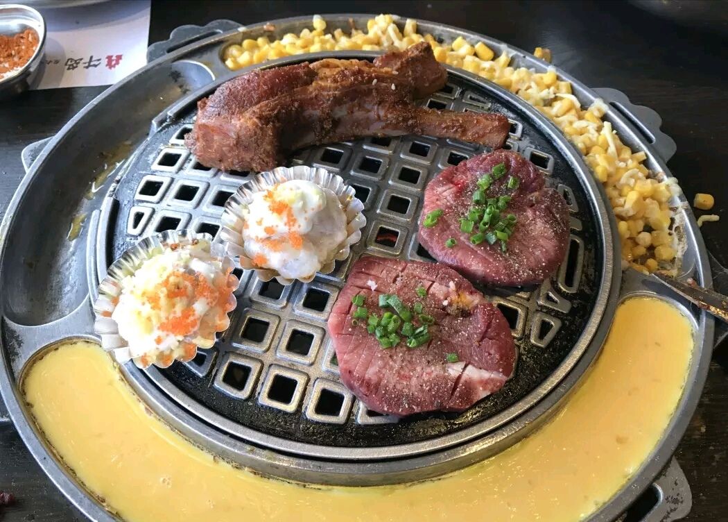 份量超级足,绝对是够的。由于是第一次过来吃,怕烤不好,浪费食材。店员小哥热心的帮我们烤肉,对于懒癌星人来说简直就是福音,坐位置上等着熟了,直接吃就可以。整个用餐过程都极为享受,窗外可以看到鹦鹉洲长江大桥,边用餐边看江景,心情很舒畅。 牛五花稍微有点肥,店员首先烤的就是牛五花,把油水炸出来,后面烤肉就方便了。他家烤肉不需要单独给色拉油,纯用烤肉自带的油水和汤汁在铁盘上烤,原汁原味很香。牛五花烤熟之后趁热吃,口感柔和还带点汁水,没有筋子很爽口。 芝士蟹籽烤鲜虾滑,盘子端上来放锡纸上,里面加了芝士和蟹籽,店员直接把锡纸放在烤盘上烤,芝士融化之后散发出淡淡的奶香,等到虾滑由白色变成红色的时候,就熟透可以吃了。口感带芝士的香味,蟹籽脆脆的,吃嘴里完全不像是在吃虾滑,反而像是在吃甜品。