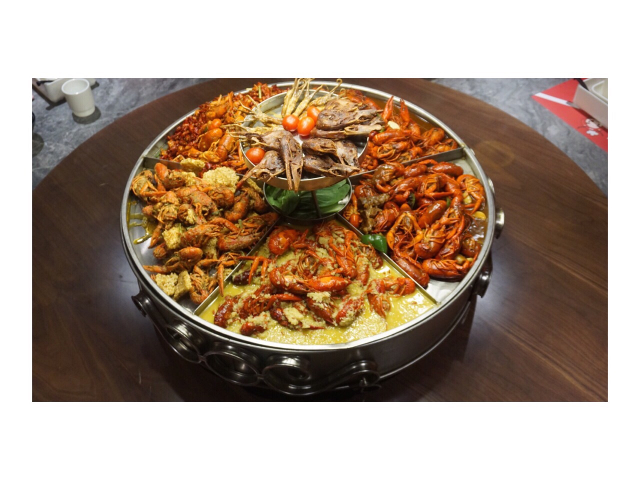 红大龙虾,南京老牌的龙虾店,历史悠久,吃了好多年。 王府大店,经汤姆马克餐饮品牌设计机构升级重装过后, 品牌档次提升,环境的格调满满,宣传广告片十分诱人。 新增的品类 :鸡尾酒,颜值不仅高,味道很好喝。 点了一份龙虾大咖,5种口味 : 十三香 干煸 咖喱 蒜泥 蛋黄锅巴龙虾。 还配以酥鸭头与卤鸭舌,招牌鸭头超有名,味道酥松咸鲜,卤鸭舌,口感微辣。 5种口味的龙虾,个人口味偏向蛋黄龙虾 十三香龙虾与蒜泥龙虾。 蛋黄锅巴龙虾,锅巴香脆,好吃的不得了,恨不得打包一份锅巴。 蒜泥龙虾,蒜香浓郁,腮白黄多肉紧致,与面条是绝配,要爱死了。 冰醉女儿红龙虾,选用10年陈酿的绍兴女儿红,淋在冰镇的龙虾上,飘逸的干冰,仙气十足。 店内当餐消费,四倍充值的活动,免当餐消费的活动,很超值。 干煸牛蛙,火红的辣椒,带皮的牛蛙外焦里嫩,值得一尝。 龙虾捞饭,加入了虾腿肉、虾肉、青菜、笋丁、香菇,十分诱人。