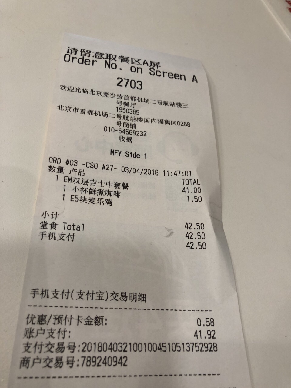 ...有买麦当劳垫饥了,机场里的麦当劳比外面贵是可以理解滴,这家也有自助点餐,效率杠杠的,服务也不差t2没有pp卡休息室,只有买麦当劳垫饥了,机场里的麦当劳比外面贵是可以理解滴,这家也有自助点餐,效率杠杠的,服务也不差。