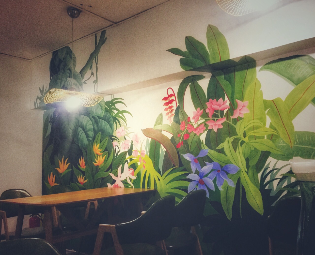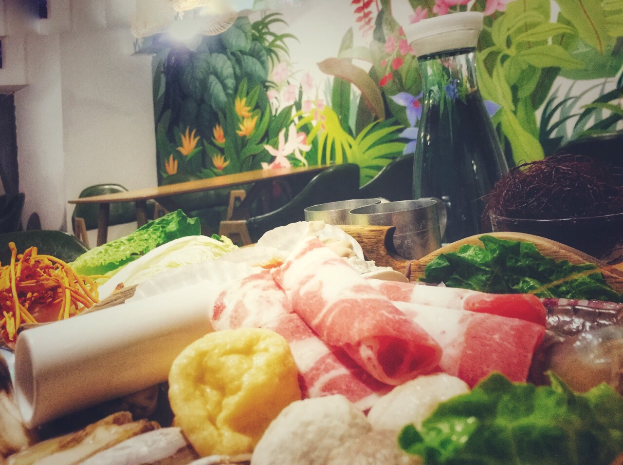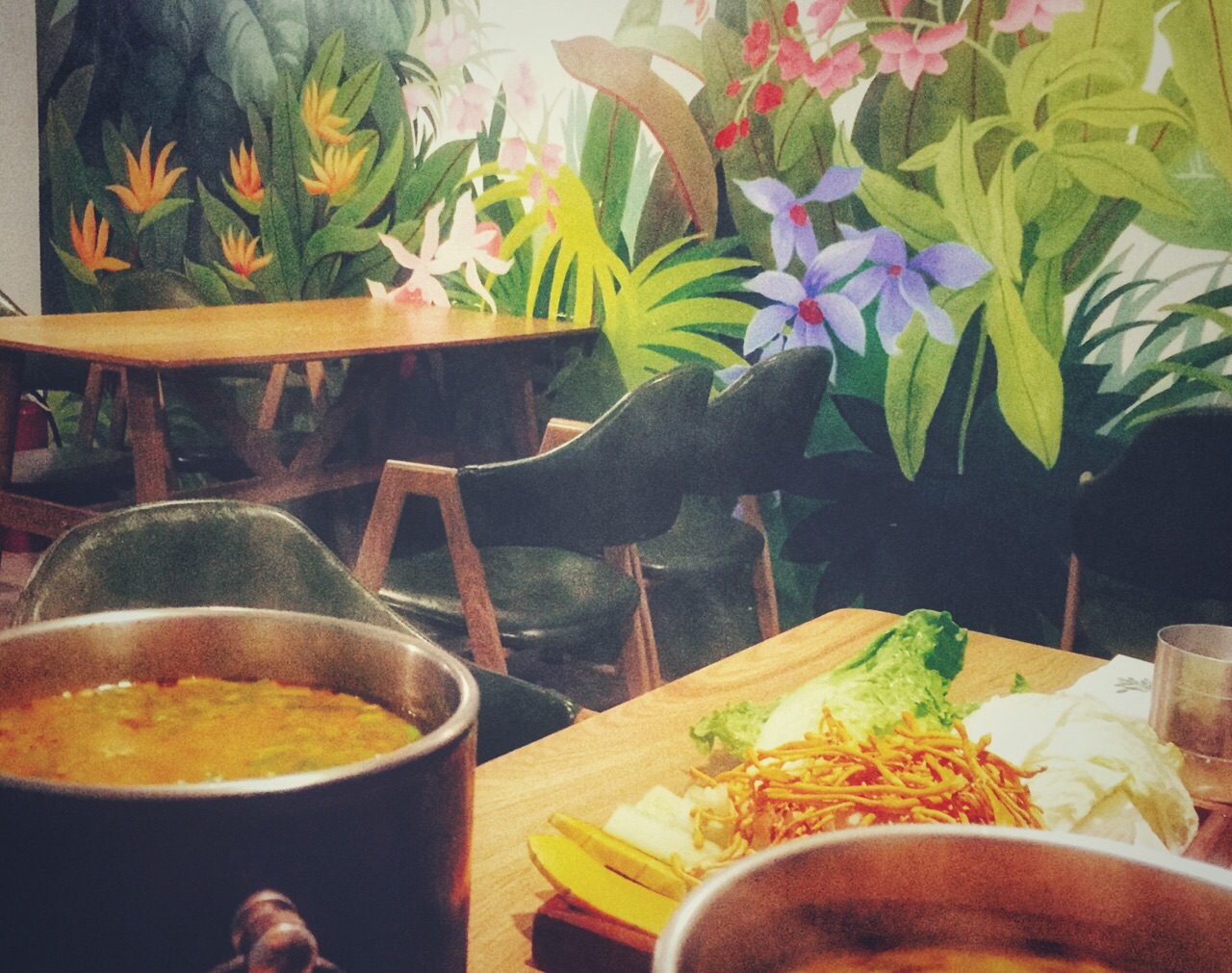 【泰国 新加坡 印度尼西亚 咖喱 肉骨茶 印尼九层塔】 来这家店脑海中就想到了这首歌,哈哈~ 这家评分很高,每次来都需要提前一两个小时预约位置。 位置没那么好找,在大坪时代天街的一个写字楼里。但所谓酒香不怕巷子深,只要够美味,总会吸引爱好美食的人前来觅食。店里墙壁是粉刷的绿色和蓝色,还有店主手绘的涂鸦,灯具也很有风格,和木质的桌椅在一起,营造出了一个清新淡雅的环境。 冬阴功火锅是店里的招牌了。汤底是很正宗的泰国冬阴功味,浓郁香醇,酸酸辣辣的开胃爽口。菜的分量很足,海鲜个头都很大,也很新鲜。