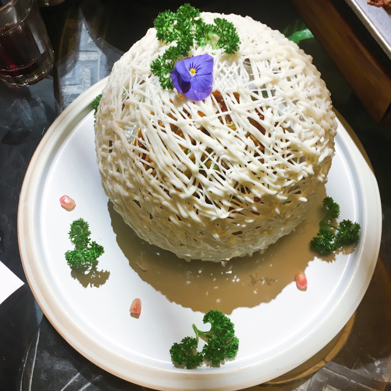 之前去过车公庄的店,老妈感觉不错,这次就特意找了离家近的魏公村店。进门后服务员看到我们两位老人,贴心的提供了鸟笼的座位,这里还靠近演出的位置,全家都很高兴。因为选型特别点了鸟巢,外壳是白巧克力,里面是口水鸡。面儿茶稀的出奇,找了服务员说帮我们“冲”一碗稠点儿的,这让我们无语了……