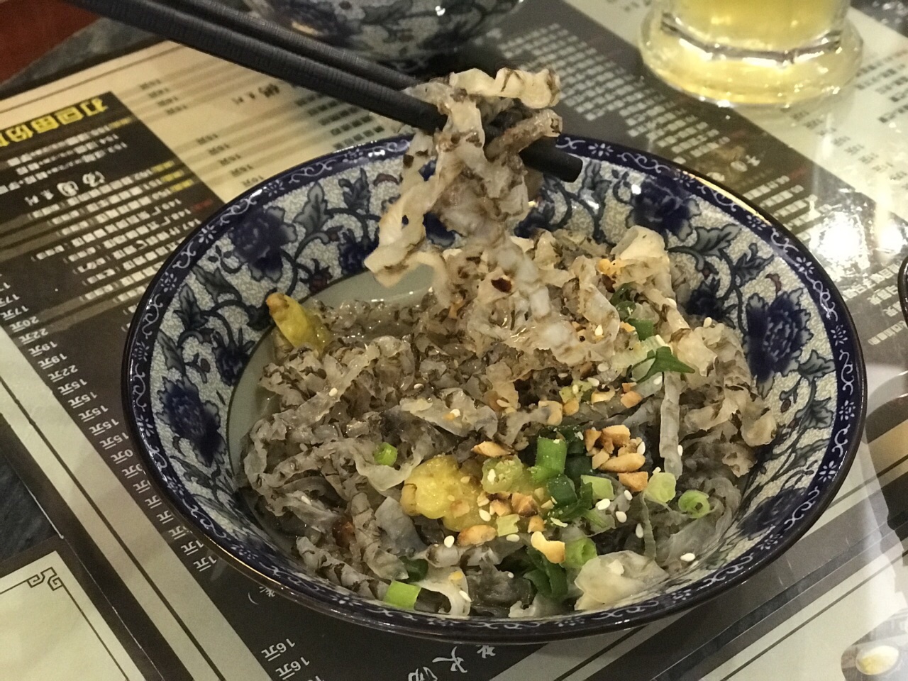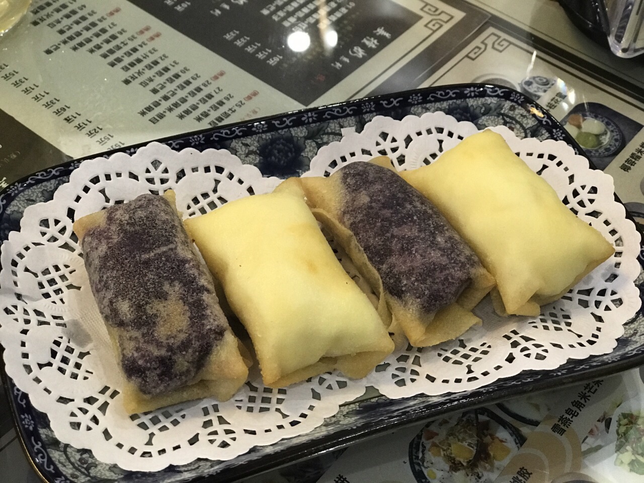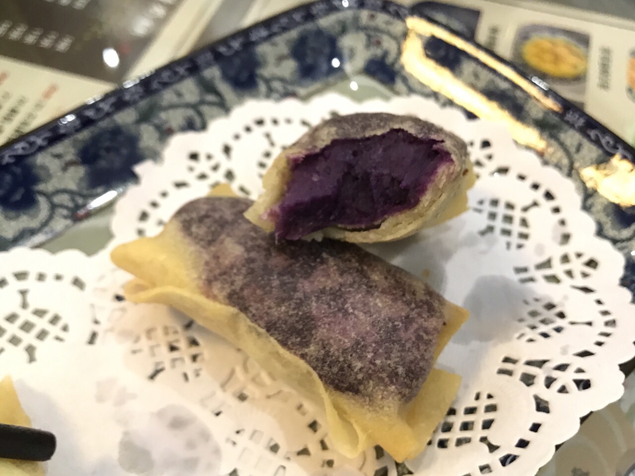 特意去尝双皮奶,因为我们喜欢吃。地方不是很好找,在烈日下花了一番功夫才找到。我要了两份双皮奶,奶味浓郁顺滑,不是太甜。服务员推荐紫金双拼,是炸牛奶和炸紫薯。炸牛奶好好吃 我们在艳阳下晒得汗流浃背,她介绍了一些冷饮消暑降温。点了一杯桔子柠檬绿茶和一杯老盐百香果茶,我觉得太多冰块了,都尝不到果汁。我自己要了一碟泡椒凉拌鱼皮,鱼皮有点儿硬,而且太咸了。午茶时间有优惠但是服务员不说,让我付原价。