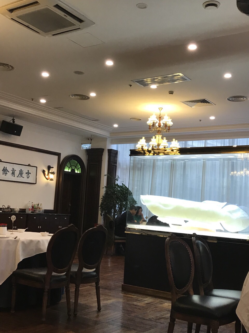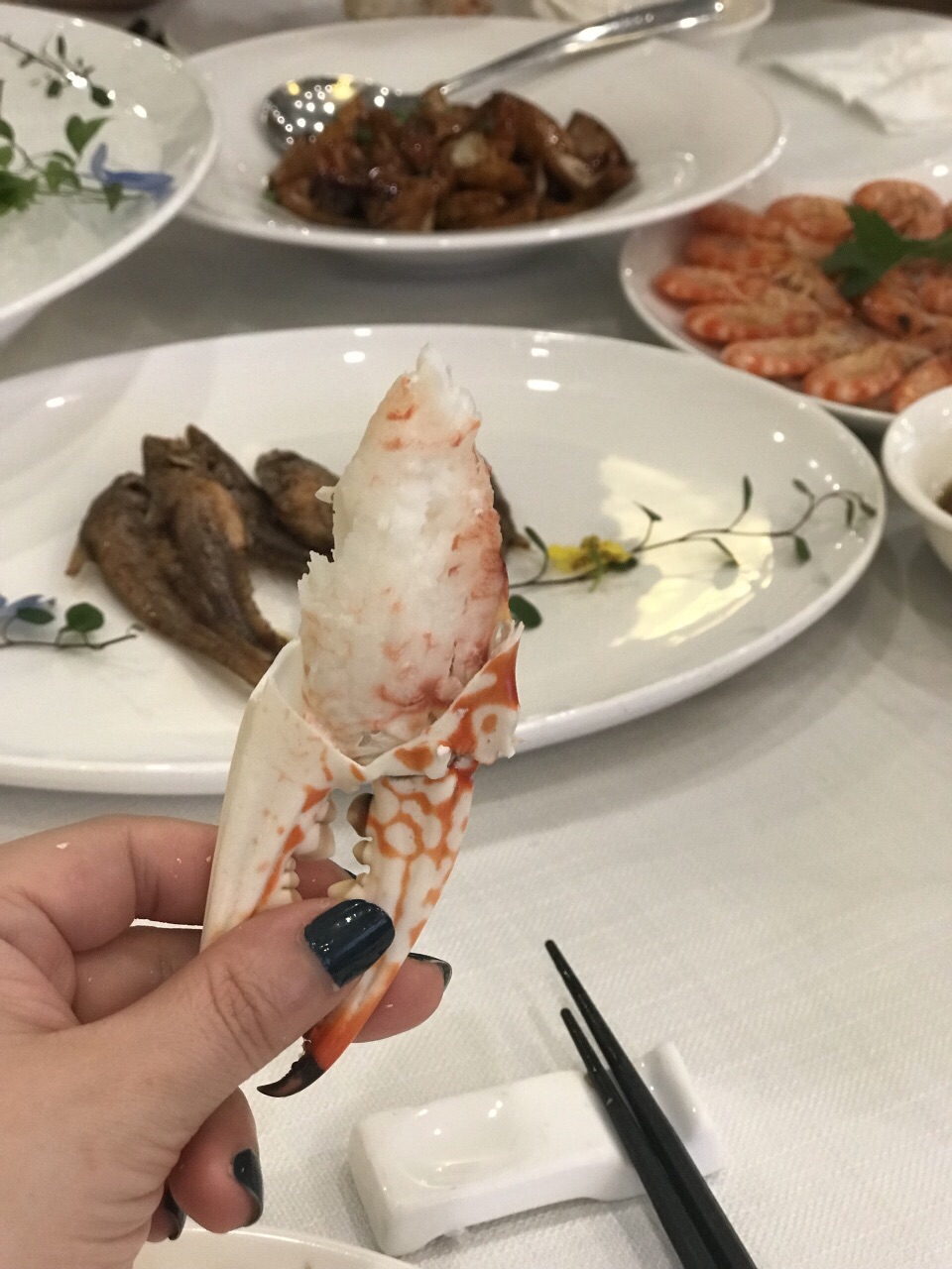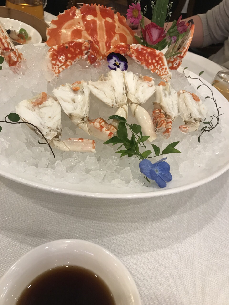 某人某天突发奇想一定要吃潮州冻花蟹,声称看了某个美食家的文章,硬拉着我寻味来到醉辉皇。静安寺过来三十多块,还是蛮远的,周围在修建,灰蒙蒙的让人不舒服,店堂内倒是宽敞明亮上档次!只是上座率实在不高。看了菜单,明明是粤菜嘛!我想吃它们的招牌醉蟹,回答要预定,现点没有,乳鸽也没有,甜点山药糕也没有……基本要啥没啥,我都想走人了,又想跟某人吵架了!他点了一只一斤半的冻花蟹,味道尚可,但并不特别,跟我们在其他地方吃的并无区别。斑节虾还算新鲜,也不特殊。雪花牛肉食材不错,可惜厨艺不佳,要的4分熟,但里面是冷的,请注意,里面生的是对的,但入口不该是冰冷的,这个口感真是浪费了牛肉。其他菜与点心我都不想点评了,很一般,无功无过,不会再去第二次的店家,某人也默默的吃好买完单走人了!