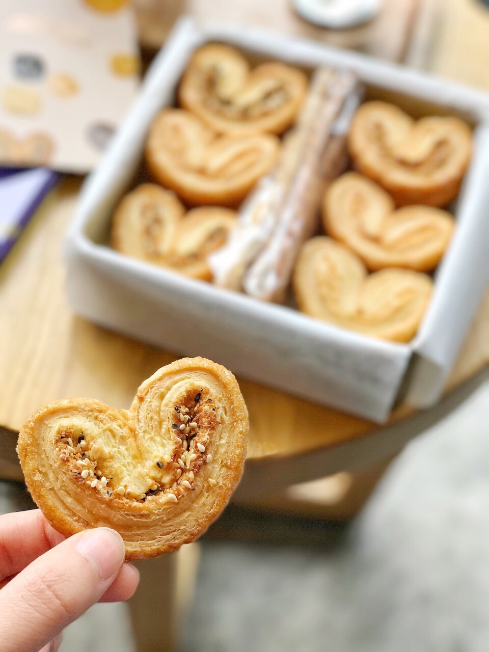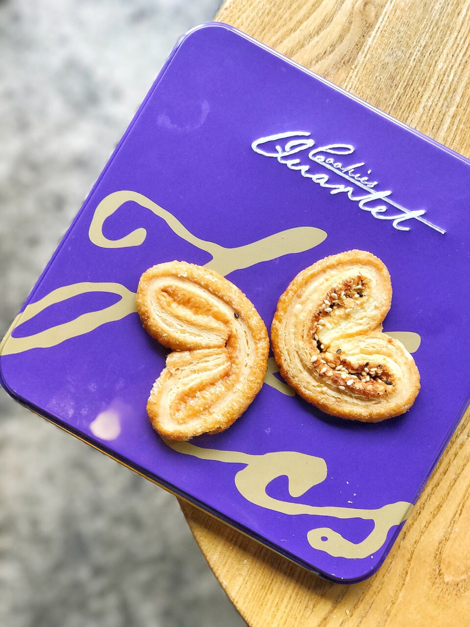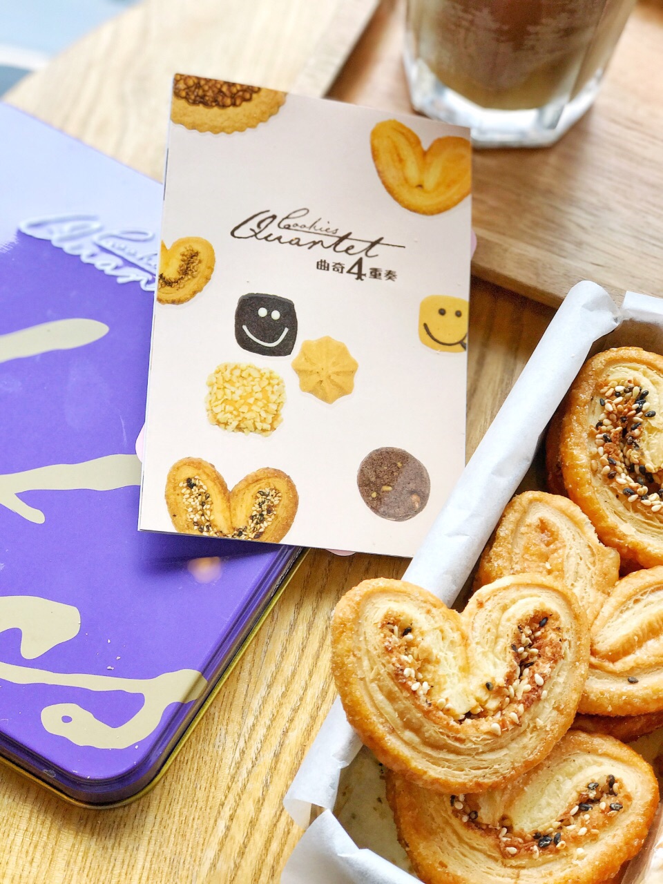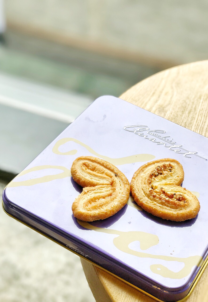 因为朋友圈有人po了这家的蝴蝶酥,是原味款的那一盒。 哈哈,小亚本身就喜欢蝴蝶酥,所以就立马被种草了,果断找了翟先生,让他下次回成都的时候,顺便带一盒回来尝尝。 虽然这家的曲奇也很有名,但是考虑到自己并不是很喜欢曲奇,所以选了颜值更高的蝴蝶酥礼盒。 还是选的口味最丰富的杂锦蝴蝶酥礼盒。 【杂锦蝴蝶酥礼盒】188元港币 小铁盒做得很精致,外观设计也比较高档的样子。实话说,我一直觉得小熊曲奇的铁盒图案看起来很low,很像地摊货。哈哈! 礼盒包含4款口味的蝴蝶酥和2款酥条。 “原味蝴蝶酥”:蝴蝶酥的酥皮做得很好,层次很薄很分明,色泽金黄均匀,黄油味浓; “亚麻籽蝴蝶酥”:其他口味的蝴蝶酥,其实就是原味蝴蝶酥中间加了点不同配料而已,在味道上差别并不大。这个就是原味中间有点亚麻籽颗粒而已; “黑白芝麻蝴蝶酥”:因为有了黑白芝麻,这款蝴蝶酥会更香一点,黑白芝麻的味道: “椰丝芝麻蝴蝶酥”:有椰丝和白芝麻,喜欢椰丝的味道,可惜太淡了,基本上不明显。 【玉桂酥条】酥皮和榛子颗粒搓长条,蘸上肉桂粉,自己可以想象的味道。 【杏仁酥条】杏仁颗粒很多,所以格外的香脆,只有几根不够吃哦。 恩。说不上惊艳,但是算是好吃的。价格略贵!