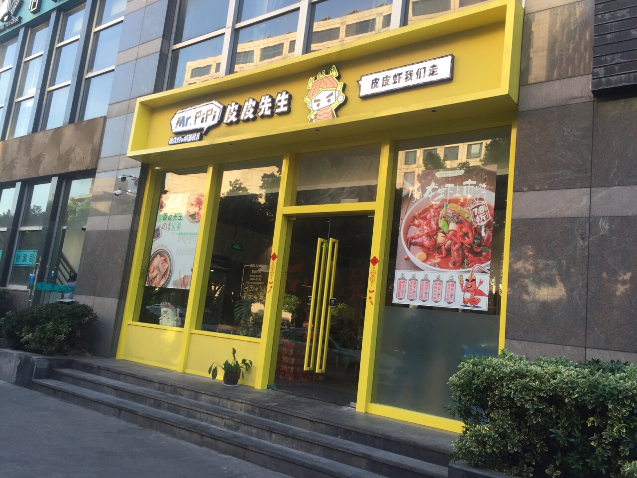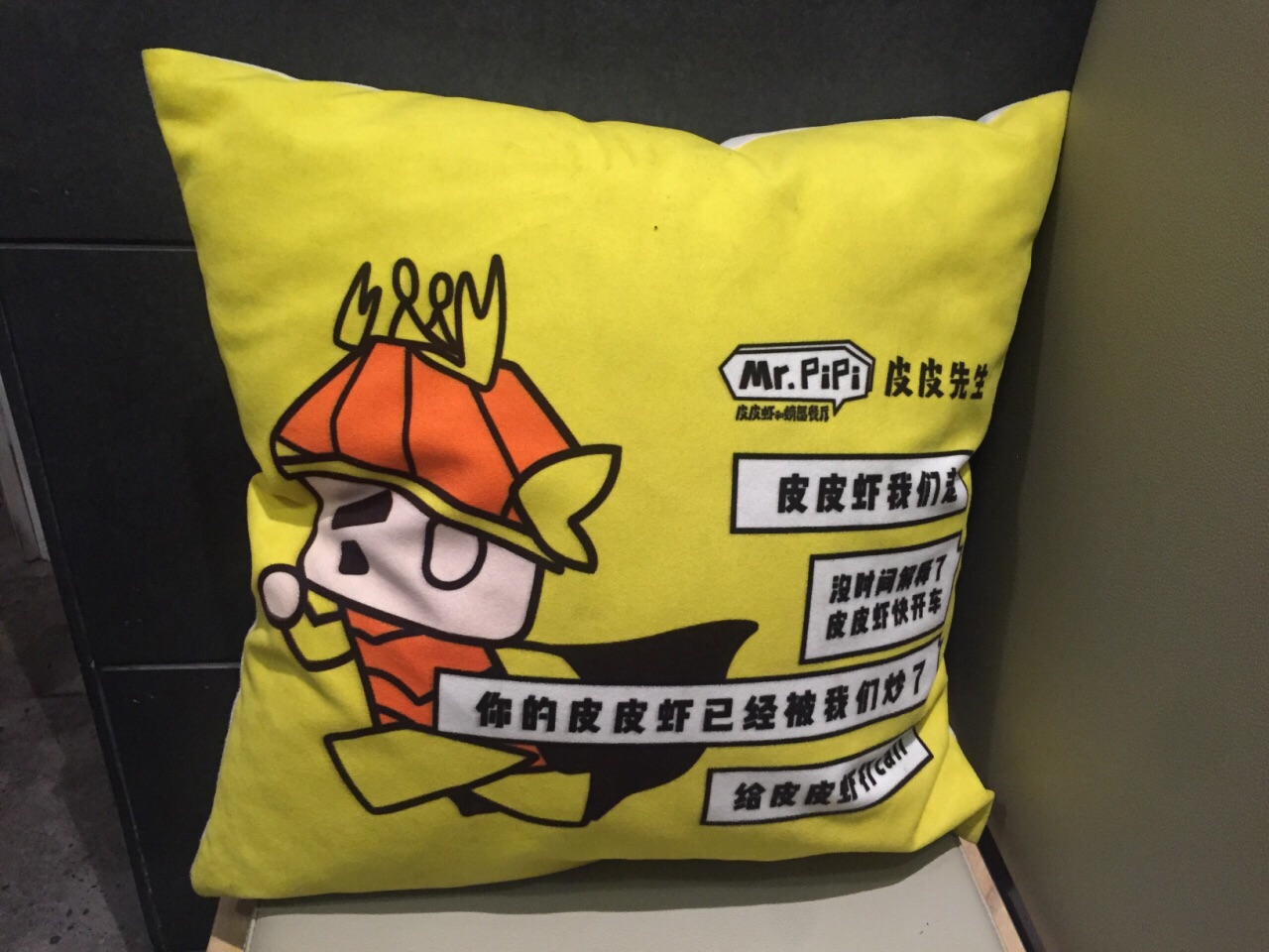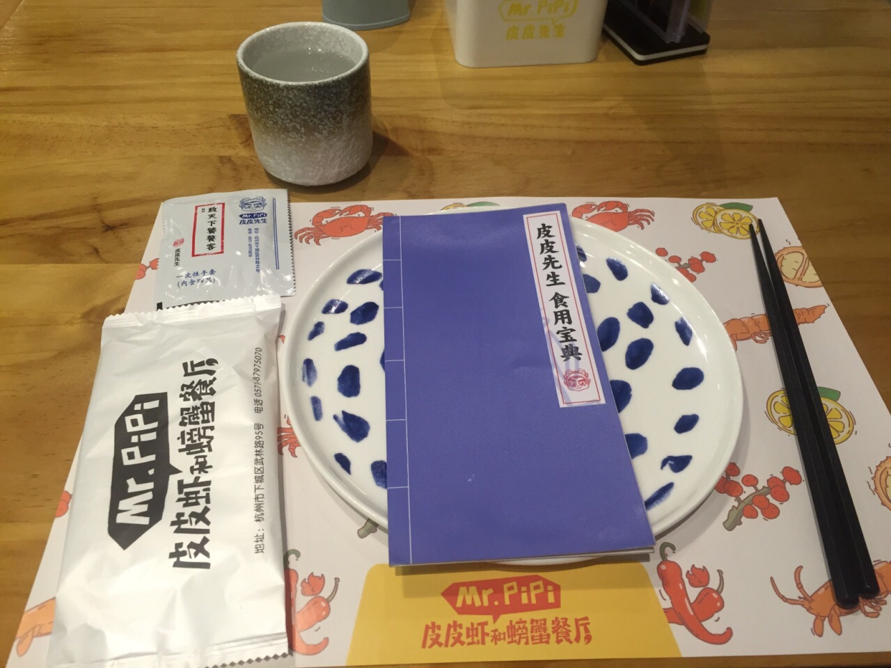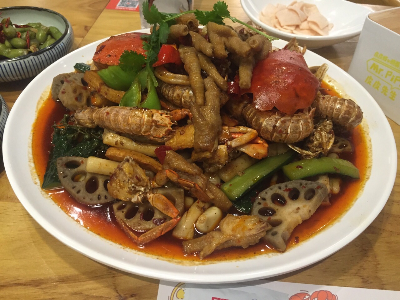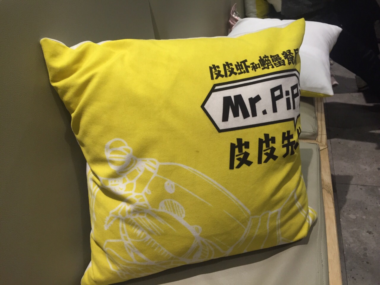 参加大众点评年会抽中3等奖,奖品之一就是皮皮先生的双人套餐券一张,在大众点评网上搜索了下,同样的套餐,团购价要228元呢,感谢点评爸爸。 在到期的最后一天过来兑换,这家店在黄龙恒励大厦一楼外围,边上是克洛餐吧,黄色的门脸还是挺明显的。 晚上5点多过来,不用等位,挑了沙发座坐下。沙发上的靠枕也是黄色的,图案和文字很有意思,都是围绕皮皮虾的主题。 桌上湿巾,一次性手套都有,还有本类似武功秘籍的皮皮虾食用宝典,打开来学习下,吃皮皮虾有4种方法,但是觉得太麻烦了,还是用手剥最方便。 服务员比较周到,入座后给我们倒了水,拿来一盘虾片,上好佳的味道,还给了我们一人一个衢州的椪柑。验券后,拿来一升装的泰国进口椰子水,打开后帮我们倒上,喝了口,椰香味很浓,很好喝。 两份小菜先端上来,陈醋凤爪,很有嚼劲,散在陈醋里有点酸,微微有点辣。生炝毛豆,毛豆一颗颗很饱满,有点酸有点辣,很开胃。 主菜混世魔王皮皮虾和香辣大闸蟹二选一,为了吃皮皮虾而来的,选了混世魔王皮皮虾。等了一会儿,端上来一大盘,料好丰富,有皮皮虾,肉蟹,凤爪,黄瓜,鱿鱼,年糕,藕片,杏鲍菇等。大概是吃皮皮虾的季节还没到,皮皮虾个头不大,戴上一次性塑料手套直接动手剥壳吃,虾肉比较实,蘸点汤汁,哇,好辣。再吃螃蟹,螃蟹切块烧的,很入味很辣,螃蟹选的不错,肉多。 跟服务员反映说混世魔王皮皮虾烧的太辣了,服务员说这道菜的特色就是辣,让顾客吃的过瘾也辣的过瘾。